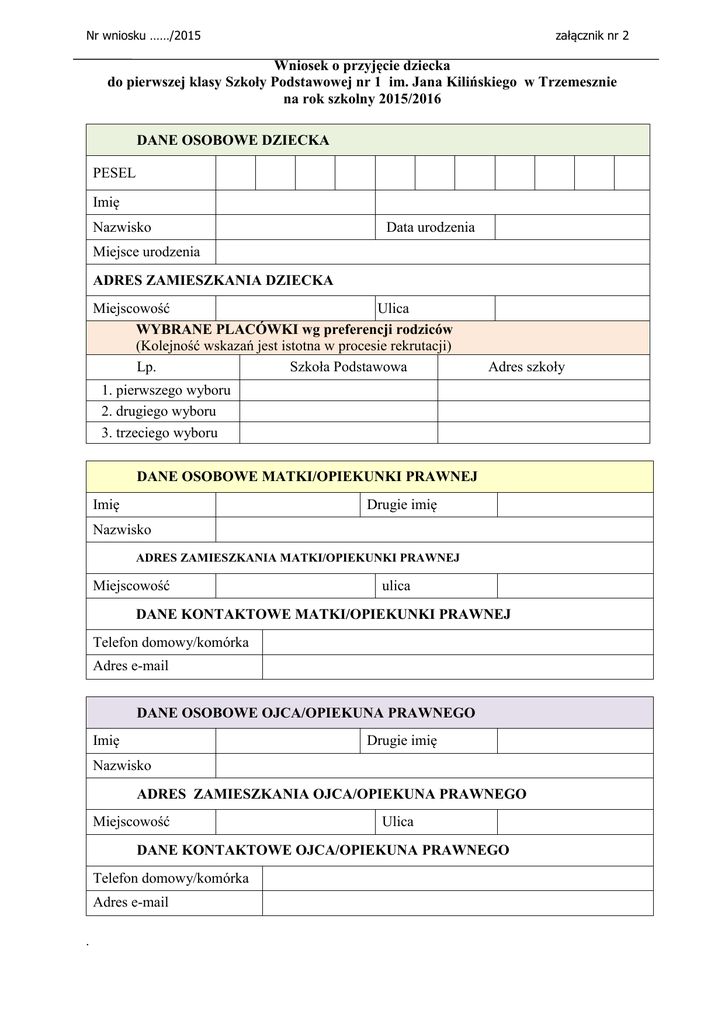 Nr wniosku ……/2015 załącznik nr 2 Wniosek o przyjęcie dziecka do pierwszej klasy Szkoły Podstawowej nr 1 im. Jana Kilińskiego w Trzemesznie na rok szkolny 2015/2016 DANE OSOBOWE DZIECKA PESEL Imię Nazwisko Data urodzenia Miejsce urodzenia ADRES ZAMIESZKANIA DZIECKA Miejscowość Ulica WYBRANE PLACÓWKI wg preferencji rodziców (Kolejność wskazań jest istotna w procesie rekrutacji) Lp. Szkoła Podstawowa Adres szkoły 1. pierwszego wyboru 2. drugiego wyboru 3. trzeciego wyboru DANE OSOBOWE MATKI/OPIEKUNKI PRAWNEJ Imię Drugie imię Nazwisko ADRES ZAMIESZKANIA MATKI/OPIEKUNKI PRAWNEJ Miejscowość ulica DANE KONTAKTOWE MATKI/OPIEKUNKI PRAWNEJ Telefon domowy/komórka Adres e-mail DANE OSOBOWE OJCA/OPIEKUNA PRAWNEGO Imię Drugie imię Nazwisko ADRES ZAMIESZKANIA OJCA/OPIEKUNA PRAWNEGO Miejscowość Ulica DANE KONTAKTOWE OJCA/OPIEKUNA PRAWNEGO Telefon domowy/komórka Adres e-mail . KRYTERIA PRZYJĘĆ do klasy pierwszej Szkoły Podstawowej nr 1 w Trzemesznie (przy spełnionych kryteriach proszę postawić znak „x”) 1. Kryteria wynikające ze statutu szkoły/ustalane przez gminę lub dyrektora w uzgodnieniu z organem prowadzącym Posiadanie rodzeństwa w tutejszej szkole lub rodzeństwa, które jest absolwentem tej szkoły. 2. Uczęszczanie dziecka do oddziału przedszkolnego w tej szkole- kontynuacja nauki. 3. Zamieszkiwanie dziadków dziecka lub rodzeństwa jednego z rodziców w obwodzie szkoły. 4. Przynajmniej eden z rodziców dziecka jest absolwentem tej szkoły. 5. Szkoła jest położona blisko miejsca pracy przynajmniej jednego z rodziców. Uwagi: Przewodniczący Komisji Rekrutacyjnej może prosić o przedłożenie dokumentów potwierdzających spełnianie kryteriów kwalifikacyjnych zaznaczonych we wniosku. W przypadku nie przedłożenia w terminie wskazanym przez Przewodniczącego dokumentów potwierdzających spełnienie kryteriów przyjmuje się, że dziecko nie spełnia danego kryterium. Do wypełnionej karty proszę dołączyć: opinię lub orzeczenie z poradni psychologiczno-pedagogicznej, orzeczenie o potrzebie kształcenia specjalnego wydane ze względu na niepełnosprawność, orzeczenie o niepełnosprawności dziecka lub o stopniu niepełnosprawności, dokument poświadczający objęcie dziecka pieczą zastępczą zgodnie z ustawą o wspieraniu rodziny i systemie pieczy zastępczej, dodatkowe dołączone do deklaracji informacje o dziecku (art. stan zdrowia, potrzeba szczególnej opieki, stosowana dieta, zalecenia lekarskie, art.) Oświadczam, że: a) b) c) d) wszystkie dane zawarte w zgłoszeniu są prawdziwe, niezwłocznie powiadomię dyrektora szkoły o zmianie danych zawartych w zgłoszeniu, wyrażam zgodę na przetwarzanie danych osobowych zawartych we wniosku dla celów związanych z rekrutacją do szkoły zgodnie z ustawą z dnia 29 sierpnia 1997 roku o ochronie danych osobowych (tekst jednolity Dz. U. z 2002 r. Nr 101, poz. 926 z późniejszymi zmianami), wyrażam zgodę/nie wyrażam zgody na opublikowanie imienia i nazwiska mojego dziecka na tablicy ogłoszeń w szkole na liście dzieci przyjętych . Zapoznałam/ zapoznałem się z treścią powyższych pouczeń. Data i podpis matki lub opiekunki prawnej prawnego ……………………………………………. Data i podpis ojca lub opiekuna …………………………………………… Przyjęcie zgłoszenia przez dyrektora szkoły Data …………………… Podpis dyrektora ………………………………….