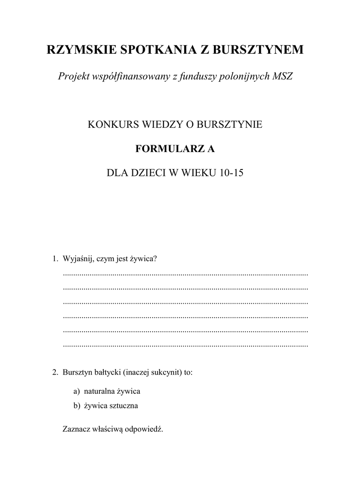 RZYMSKIE SPOTKANIA Z BURSZTYNEM Projekt współfinansowany z funduszy polonijnych MSZ KONKURS WIEDZY O BURSZTYNIE FORMULARZ A DLA DZIECI W WIEKU 10-15 1. Wyjaśnij, czym jest żywica? ....................................................................................................................... ....................................................................................................................... ....................................................................................................................... ....................................................................................................................... ....................................................................................................................... ....................................................................................................................... 2. Bursztyn bałtycki (inaczej sukcynit) to: a) naturalna żywica b) żywica sztuczna Zaznacz właściwą odpowiedź. 3. Żywica jakich drzew tworzy bursztyn bałtycki: a) iglastych b) liściastych Zaznacz właściwą odpowiedź. 4. Wymień 3 gatunki drzew rosnących w bursztynowych lasach. a) ............................................................................................................. b) ............................................................................................................. c) ............................................................................................................. 5. Bursztyn bałtycki ma: a) 60 tys. lat b) 100 tys. lat c) 5 mln lat d) 40 mln lat Zaznacz właściwą odpowiedź. 6. Jak wygląda bursztyn? Opisz w kilku zdaniach. ....................................................................................................................... ....................................................................................................................... ....................................................................................................................... ....................................................................................................................... ....................................................................................................................... ....................................................................................................................... ....................................................................................................................... ....................................................................................................................... 7. Inkluzją w bursztynie nazywa się wszystko to, co się do niego dostało w sposób naturalny, kiedy żywica spływała z drzew. W bursztynie znajdują się inkluzje organiczne: rośliny i zwierzęta (owady i pajęczaki). Wymień 3 zwierzęta znalezione w bursztynie. a) .................................................................................................................. b) .................................................................................................................. c) .................................................................................................................. 8. Nad którym morzem można dziś znaleźć sukcynit: a) Morzem Bałtyckim b) Morzem Śródziemnym c) Morzem Czarnym Zaznacz właściwą odpowiedź. 9. Napisz, jak nazywała się droga, którą strożytni Rzymianie sprowadzali bursztyn znad Bałtyku? .................................................................................................................. 10.Co jest wyrabiane z bursztynu? a) zabawki b) biżuteria (naszyjniki, pierścionki, bransolety) c) samochody Zaznacz właściwą odpowiedź. 11.Wymień 3 kolory, w jakich może występować bursztyn. a) .................................................................................................................. b) .................................................................................................................. c) .................................................................................................................. 12.Nazwa „bursztyn” pochodzi od niemieckiego słowa „bernstein”. Wyjaśnij znaczenie tego słowa. ....................................................................................................................... ....................................................................................................................... ....................................................................................................................... ....................................................................................................................... 13.Czy bursztyn wchodzi w skład palonego w kościele kadzidła? a) tak b) nie Zaznacz właściwą odpowiedź. 14.Jak sprawdzić autentyczność bursztynu? Opisz jeden ze sposobów. ....................................................................................................................... ....................................................................................................................... ....................................................................................................................... ....................................................................................................................... ....................................................................................................................... ....................................................................................................................... ....................................................................................................................... 15.Wysłuchaj piosenki zespołu „Fasolki” zaczynającej się od słów: „Kiedy już trzeba będzie powiedzieć cześć”. Napisz, do czego porównany jest bursztyn w refrenie t