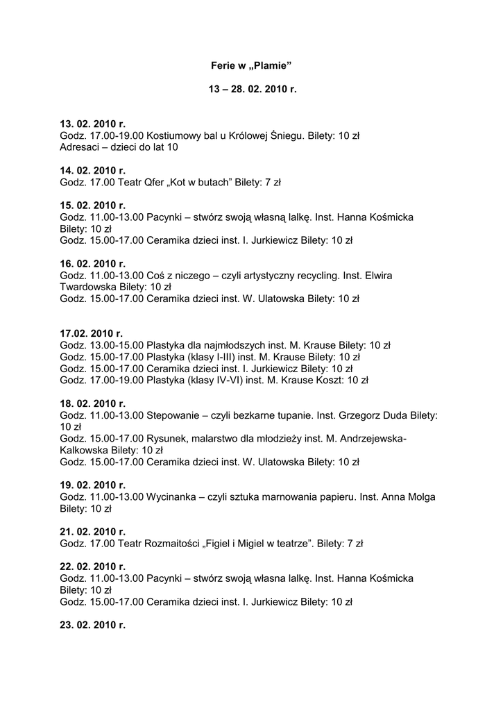 Ferie w „Plamie” 13 – 28. 02. 2010 r. 13. 02. 2010 r. Godz. 17.00-19.00 Kostiumowy bal u Królowej Śniegu. Bilety: 10 zł Adresaci – dzieci do lat 10 14. 02. 2010 r. Godz. 17.00 Teatr Qfer „Kot w butach” Bilety: 7 zł 15. 02. 2010 r. Godz. 11.00-13.00 Pacynki – stwórz swoją własną lalkę. Inst. Hanna Kośmicka Bilety: 10 zł Godz. 15.00-17.00 Ceramika dzieci inst. I. Jurkiewicz Bilety: 10 zł 16. 02. 2010 r. Godz. 11.00-13.00 Coś z niczego – czyli artystyczny recycling. Inst. Elwira Twardowska Bilety: 10 zł Godz. 15.00-17.00 Ceramika dzieci inst. W. Ulatowska Bilety: 10 zł 17.02. 2010 r. Godz. 13.00-15.00 Plastyka dla najmłodszych inst. M. Krause Bilety: 10 zł Godz. 15.00-17.00 Plastyka (klasy I-III) inst. M. Krause Bilety: 10 zł Godz. 15.00-17.00 Ceramika dzieci inst. I. Jurkiewicz Bilety: 10 zł Godz. 17.00-19.00 Plastyka (klasy IV-VI) inst. M. Krause Koszt: 10 zł 18. 02. 2010 r. Godz. 11.00-13.00 Stepowanie – czyli bezkarne tupanie. Inst. Grzegorz Duda Bilety: 10 zł Godz. 15.00-17.00 Rysunek, malarstwo dla młodzieży inst. M. AndrzejewskaKalkowska Bilety: 10 zł Godz. 15.00-17.00 Ceramika dzieci inst. W. Ulatowska Bilety: 10 zł 19. 02. 2010 r. Godz. 11.00-13.00 Wycinanka – czyli sztuka marnowania papieru. Inst. Anna Molga Bilety: 10 zł 21. 02. 2010 r. Godz. 17.00 Teatr Rozmaitości „Figiel i Migiel w teatrze”. Bilety: 7 zł 22. 02. 2010 r. Godz. 11.00-13.00 Pacynki – stwórz swoją własna lalkę. Inst. Hanna Kośmicka Bilety: 10 zł Godz. 15.00-17.00 Ceramika dzieci inst. I. Jurkiewicz Bilety: 10 zł 23. 02. 2010 r. Godz. 11.00-13.00 Coś z niczego – czyli artystyczny recycling. Inst. Elwira Twardowska Bilety: 10 zł Godz. 15.00-17.00 Ceramika dzieci inst. W. Ulatowska Bilety: 10 zł 24. 02. 2010 r. Godz. 13.00-15.00 Plastyka dla najmłodszych inst. M. Krause Bilety: 10 zł Godz. 15.00-17.00 Plastyka (klasy I-III) inst. M. Krause Bilety: 10 zł Godz. 15.00-17.00 Ceramika dzieci inst. I. Jurkiewicz Bilety: 10 zł Godz. 17.00-19.00 Plastyka (klasy IV-VI) inst. M. Krause Koszt: 10 zł 25. 02. 2010 r. Godz. 11.00-13.00 Stepowanie – czyli bezkarne tupanie. Inst. Grzegorz Duda Bilety: 10 zł Godz. 15.00-17.00 Rysunek, malarstwo dla młodzieży inst. M. AndrzejewskaKalkowska Bilety: 10 zł Godz. 15.00-17.00 Ceramika dzieci inst. W. Ulatowska Bilety: 10 zł 26. 02. 2010 r. Godz. 11.00-13.00 Wycinanka – czyli sztuka marnowania papieru. Inst. Anna Molga Bilety: 10 zł 28. 02. 2010 r. Godz. 17.00 Teatr Klapa czyli Koperek i Kminek „Słowik”. Bilety: 7 zł Imprezy dodatkowe: 16. 02. 2010 Godz. 20.00 Dagadana. Bilety: 15 zł - koncert 19. 02. 2010 Godz. 20.00 Blisko Pola. Bilety: 10 zł – koncert „Plama” Gdański Archipelag Kultury Ul. Pilotów 11, 80-460 Gdańsk Tel. 58 557 42 47 www.plama.art.pl