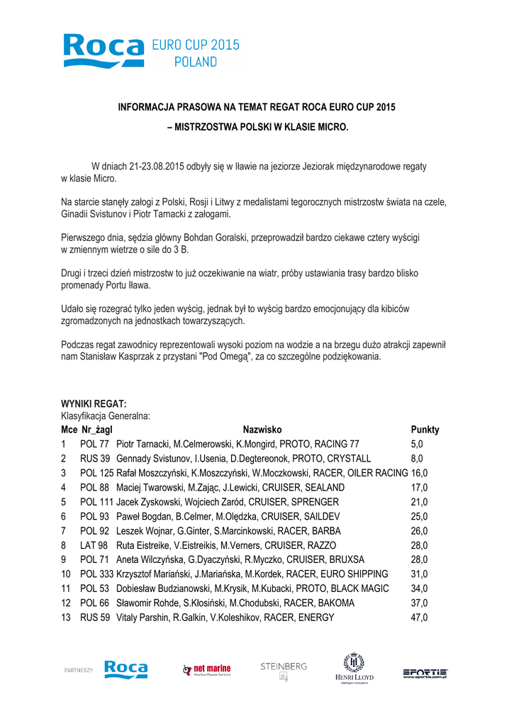 INFORMACJA PRASOWA NA TEMAT REGAT ROCA EURO CUP 2015 – MISTRZOSTWA POLSKI W KLASIE MICRO. W dniach 21-23.08.2015 odbyły się w Iławie na jeziorze Jeziorak międzynarodowe regaty w klasie Micro. Na starcie stanęły załogi z Polski, Rosji i Litwy z medalistami tegorocznych mistrzostw świata na czele, Ginadii Svistunov i Piotr Tarnacki z załogami. Pierwszego dnia, sędzia główny Bohdan Goralski, przeprowadził bardzo ciekawe cztery wyścigi w zmiennym wietrze o sile do 3 B. Drugi i trzeci dzień mistrzostw to już oczekiwanie na wiatr, próby ustawiania trasy bardzo blisko promenady Portu Iława. Udało się rozegrać tylko jeden wyścig, jednak był to wyścig bardzo emocjonujący dla kibiców zgromadzonych na jednostkach towarzyszących. Podczas regat zawodnicy reprezentowali wysoki poziom na wodzie a na brzegu dużo atrakcji zapewnił nam Stanisław Kasprzak z przystani "Pod Omegą", za co szczególne podziękowania. WYNIKI REGAT: Klasyfikacja Generalna: Mce Nr_żagl Nazwisko Punkty 1 POL 77 Piotr Tarnacki, M.Celmerowski, K.Mongird, PROTO, RACING 77 5,0 2 RUS 39 Gennady Svistunov, I.Usenia, D.Degtereonok, PROTO, CRYSTALL 8,0 3 POL 125 Rafał Moszczyński, K.Moszczyński, W.Moczkowski, RACER, OILER RACING 16,0 4 POL 88 Maciej Twarowski, M.Zając, J.Lewicki, CRUISER, SEALAND 17,0 5 POL 111 Jacek Zyskowski, Wojciech Zaród, CRUISER, SPRENGER 21,0 6 POL 93 Paweł Bogdan, B.Celmer, M.Olędzka, CRUISER, SAILDEV 25,0 7 POL 92 Leszek Wojnar, G.Ginter, S.Marcinkowski, RACER, BARBA 26,0 8 LAT 98 Ruta Eistreike, V.Eistreikis, M.Verners, CRUISER, RAZZO 28,0 9 POL 71 Aneta Wilczyńska, G.Dyaczyński, R.Myczko, CRUISER, BRUXSA 28,0 10 POL 333 Krzysztof Mariański, J.Mariańska, M.Kordek, RACER, EURO SHIPPING 31,0 11 POL 53 Dobiesław Budzianowski, M.Krysik, M.Kubacki, PROTO, BLACK MAGIC 34,0 12 POL 66 Sławomir Rohde, S.Kłosiński, M.Chodubski, RACER, BAKOMA 37,0 13 RUS 59 Vitaly Parshin, R.Galkin, V.Koleshikov, RACER, ENERGY 47,0 Dywizja Cruiser: 1. POL 88 Maciej Twarowski, M.Zając, J.Lewicki, SEALAND 2. POL 111 Jacek Zyskowski, Wojciech Zaród, SPRENGER 3. POL 93 Paweł Bogdan, B.Celmer, M.Olędzka, SAILDEV 4. lAT 98 Ruta Eistreike, V.Eistreikis, M.Verners, RAZZO 5. POL 71Aneta Wilczyńska, G.Dyaczyński, R.Myczko, BRUXSA Dywizja Racer: 1 POL 125 Rafał oszczyński, K.Moszczyński, W.Moczkowski, OILER RACING 2 POL 92 Leszek Wojnar, G.Ginter, S.Marcinkowski, BARBA 3 POL 333 Krzysztof Mariański, J.Mariańska, M.Kordek, EURO SHIPPING 4 POL 66 Sławomir Rohde, S.Kłosiński, M.Chodubski, BAKOMA 5 RUS 59 Vitaly Parshin, R.Galkin, V.Koleshikov, ENERGY Bardzo dziękujemy sponsorom regat, dzięki którym mogliśmy zorganizować regaty: Roca Polska, Steinberg, Net Marine, Henri Lloyd, Sportis, Villa Glass. Komisja sędziowska w składzie: Bohdan Goralski Beata Zajkowska Natalia Ruwińska Katarzyna Goralska Team wodny: Jurek Chodubski Michał "Haze" Surdyn Ewa Przykłota Paulina Przykłota
