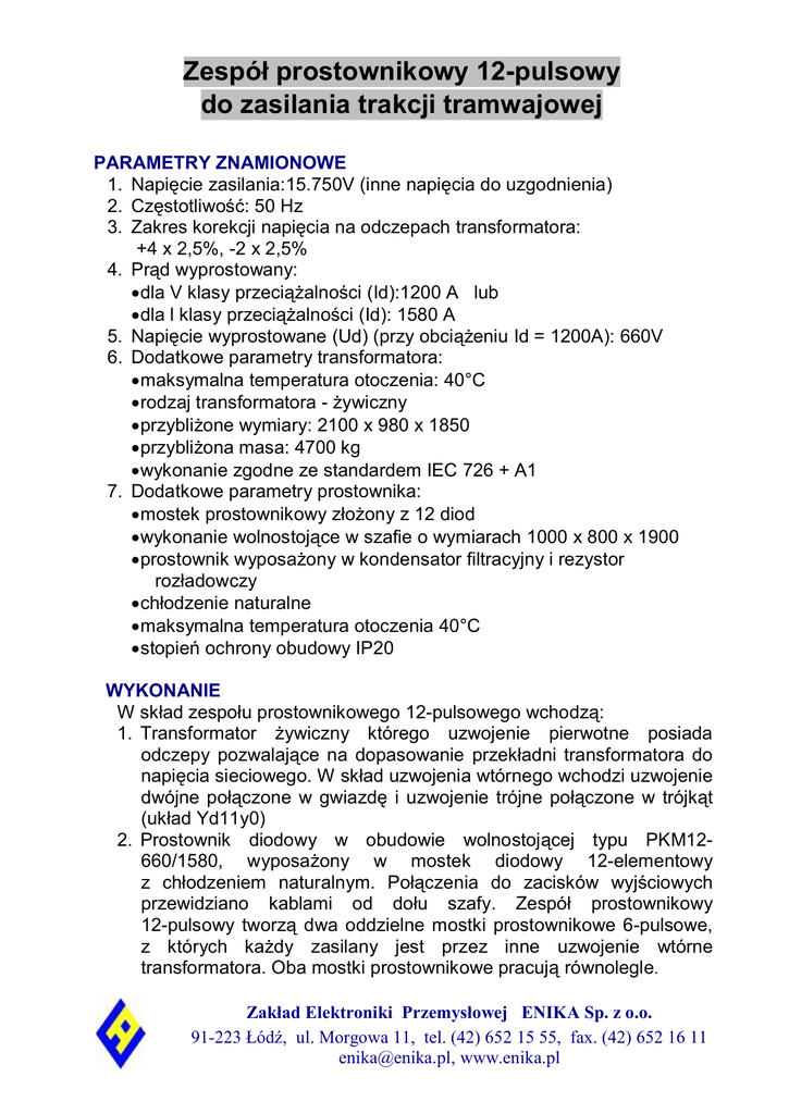 Zespół prostownikowy 12-pulsowy do zasilania trakcji tramwajowej PARAMETRY ZNAMIONOWE 1. Napięcie zasilania:15.750V (inne napięcia do uzgodnienia) 2. Częstotliwość: 50 Hz 3. Zakres korekcji napięcia na odczepach transformatora: +4 x 2,5%, -2 x 2,5% 4. Prąd wyprostowany: · dla V klasy przeciążalności (Id):1200 A lub · dla l klasy przeciążalności (Id): 1580 A 5. Napięcie wyprostowane (Ud) (przy obciążeniu Id = 1200A): 660V 6. Dodatkowe parametry transformatora: · maksymalna temperatura otoczenia: 40°C · rodzaj transformatora - żywiczny · przybliżone wymiary: 2100 x 980 x 1850 · przybliżona masa: 4700 kg · wykonanie zgodne ze standardem IEC 726 + A1 7. Dodatkowe parametry prostownika: · mostek prostownikowy złożony z 12 diod · wykonanie wolnostojące w szafie o wymiarach 1000 x 800 x 1900 · prostownik wyposażony w kondensator filtracyjny i rezystor rozładowczy · chłodzenie naturalne · maksymalna temperatura otoczenia 40°C · stopień ochrony obudowy IP20 WYKONANIE W skład zespołu prostownikowego 12-pulsowego wchodzą: 1. Transformator żywiczny którego uzwojenie pierwotne posiada odczepy pozwalające na dopasowanie przekładni transformatora do napięcia sieciowego. W skład uzwojenia wtórnego wchodzi uzwojenie dwójne połączone w gwiazdę i uzwojenie trójne połączone w trójkąt (układ Yd11y0) 2. Prostownik diodowy w obudowie wolnostojącej typu PKM12660/1580, wyposażony w mostek diodowy 12-elementowy z chłodzeniem naturalnym. Połączenia do zacisków wyjściowych przewidziano kablami od dołu szafy. Zespół prostownikowy 12-pulsowy tworzą dwa oddzielne mostki prostownikowe 6-pulsowe, z których każdy zasilany jest przez inne uzwojenie wtórne transformatora. Oba mostki prostownikowe pracują równolegle. Zakład Elektroniki Przemysłowej ENIKA Sp. z o.o. 91-223 Łódź, ul. Morgowa 11, tel. (42) 652 15 55, fax. (42) 652 16 11 [email protected], www.enika.pl Zakład Elektroniki Przemysłowej ENIKA Sp. z o.o. 91-223 Łódź, ul. Morgowa 11, tel. (42) 652 15 55, fax. (42) 652 16 11 [email protected], www.enika.pl