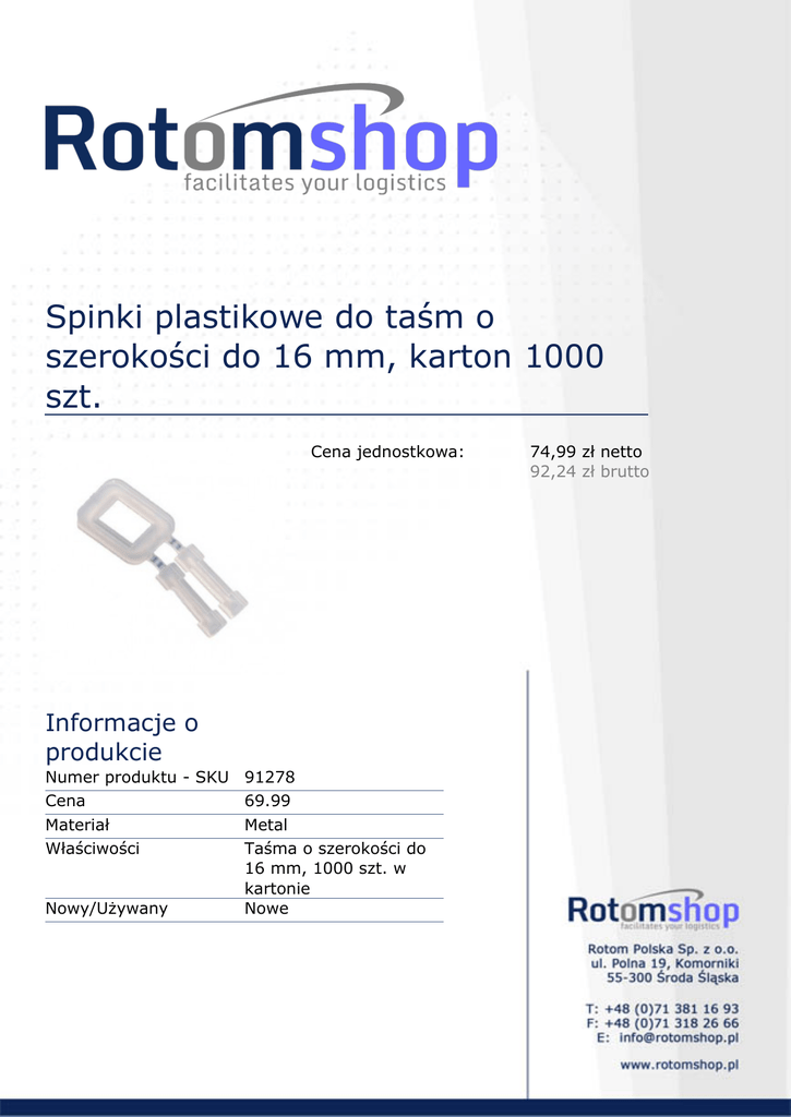 Spinki plastikowe do taśm o szerokości do 16 mm, karton 1000 szt. Cena jednostkowa: Informacje o produkcie Numer produktu - SKU 91278 Cena 69.99 Materiał Metal Właściwości Taśma o szerokości do 16 mm, 1000 szt. w kartonie Nowy/Używany Nowe Powered by TCPDF (www.tcpdf.org) 74,99 zł netto 92,24 zł brutto
