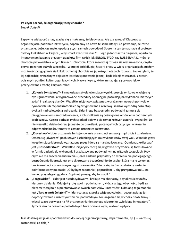 Po czym poznać, że organizację toczy choroba? Leszek Sołtysik Zapewne większość z nas, zgadza się z maksymą, że błędy uczą. Ale czy zawsze? Dlaczego w organizacjach, podobnie jak w życiu, popełniamy na nowo te same błędy? Co powoduje, że różne organizacje, duże, czy małe, upadają z tych samych powodów? Sporo na ten temat napisał profesor Sydney Finkelstein w książce „Why smart executives fail?”. Jego jednoznaczna diagnoza, oparta na intensywnym badaniu przyczyn upadków firm takich jak ENRON, TYCO, czy RUBBERMAID, mówi o chorobie przywództwa w tych firmach. Chorobie, która zazwyczaj rozwija się niezauważona, często okryta pozorem dużych sukcesów. W mojej dość długiej historii pracy w wielu organizacjach, miałem możliwość przyglądania się kilkakrotnie tej chorobie na jej różnych etapach rozwoju. Zauważyłem, że jej najbardziej wyrazistym objawem jest funkcjonowanie jednej, bądź jakiejś mieszanki, z trzech, opisanych poniżej, kultur organizacyjnych. Nazwy i opisy, które im nadaję, są celowo lekko przerysowane i trochę karykaturalne: 1. „Kolonia świstaków”– Firma osiąga satysfakcjonujące wyniki, pozycja rynkowa wydaje się być ugruntowana, a wypracowane procedury operacyjne pozwalają na wykonanie bieżących zadań i realizację planów. Wszelkie inicjatywy związane z wdrażaniem nowych pomysłów rynkowych lub racjonalizatorskich są przyjmowane z rezerwą i rzadko wychodzą poza etap dyskusji nad celowością wdrożenia. Lider i jego bezpośredni podwładni zajmują się pielęgnowaniem samozadowolenia, a ich spotkania są poświęcone omówieniu codziennych drobiazgów. Często podczas tych spotkań pojawia się temat różnych usterek i sygnałów, że nie wszystko działa dobrze, jednakże po określeniu potencjalnych przyczyn i wskazaniu odpowiedzialności, tematy te zostają uznane za załatwione. 2. „Królestwo”– Lider utożsamia funkcjonowanie organizacji ze swoją mądrością i działaniem. Otacza się „dworem” posłusznych i schlebiających mu wykonawców swej woli. Wszelkie głosy kwestionujące kierunek wyznaczony przez lidera są marginalizowane. Odmianą „królestwa” jest „Gospodarstwo”. Wszystkie inicjatywy rodzą się w głowie przywódcy, są formułowane w formie zadania do wykonania i przekazywane podwładnym na niższych szczeblach. Przy czym nie ma znaczenia hierarchia – jeżeli zadanie przynależy do szczebla nie podlegającego bezpośrednio liderowi, jest ono skierowane bezpośrednio do osoby, która ma je wykonać, bez konsultacji z przełożonym tegoż pracownika. Zdarza się, że ów przełożony zostanie poinformowany po czasie: „O byłbym zapomniał, poprosiłem … aby przygotował mi … na koniec przyszłego tygodnia. Dopilnuj, proszę, aby to zrobił.” 3. „Targowisko” – Lider jest niezdecydowany i brakuje mu charyzmy, aby określić wyraźny kierunek działania. Oddaje tą rolę swoim podwładnym, którzy w jego obecności, bądź za plecami toczą boje o przeforsowanie swoich pomysłów i interesów. Odmianą tego modelu jest „Targ u wrót świątyni” – lider roztacza szeroką wizję przyszłości, pozostawiając jej doprecyzowanie i urzeczywistnienie podwładnym. Nie angażuje się w codzienność firmy – więcej czasu poświęca na PR oraz umacnianie swojego wizerunku „wielkiego innowatora”. Tymczasem na poziomie podwładnych trwa opisana wyżej walka o wpływy. Jeśli dostrzegasz jakieś podobieństwo do swojej organizacji (firmy, departamentu, itp.) – warto się zastanowić, co dalej?