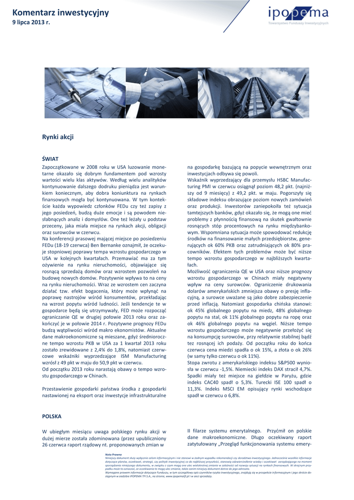 Komentarz inwestycyjny 9 lipca 2013 r. Rynki akcji ŚWIAT Zapoczątkowane w 2008 roku w USA luzowanie monetarne okazało się dobrym fundamentem pod wzrosty wartości wielu klas aktywów. Według wielu analityków kontynuowanie dalszego dodruku pieniądza jest warunkiem koniecznym, aby dobra koniunktura na rynkach finansowych mogła być kontynuowana. W tym kontekście każda wypowiedz członków FEDu czy też zapisy z jego posiedzeń, budzą duże emocje i są powodem niesłabnących analiz i domysłów. One też leżały u podstaw przeceny, jaka miała miejsce na rynkach akcji, obligacji oraz surowców w czerwcu. Na konferencji prasowej mającej miejsce po posiedzeniu FEDu (18-19 czerwca) Ben Bernanke oznajmił, że oczekuje stopniowej poprawy tempa wzrostu gospodarczego w USA w kolejnych kwartałach. Przemawiać ma za tym ożywienie na rynku nieruchomości, objawiające się rosnącą sprzedażą domów oraz wzrostem pozwoleń na budowę nowych domów. Pozytywnie wpływa to na ceny na rynku nieruchomości. Wraz ze wzrostem cen zaczyna działać tzw. efekt bogacenia, który może wpłynąć na poprawę nastrojów wśród konsumentów, przekładając na wzrost popytu wśród ludności. Jeśli tendencje te w gospodarce będą się utrzymywały, FED może rozpocząć ograniczanie QE w drugiej połowie 2013 roku oraz zakończyć je w połowie 2014 r. Pozytywne prognozy FEDu budzą wątpliwości wśród makro ekonomistów. Aktualne dane makroekonomiczne są mieszane, gdyż średnioroczne tempo wzrostu PKB w USA za 1 kwartał 2013 roku zostało zrewidowane z 2,4% do 1,8%, natomiast czerwcowe wskaźniki wyprzedzające ISM Manufacturing wzrósł z 49 pkt w maju do 50,9 pkt w czerwcu. Od początku 2013 roku narastają obawy o tempo wzrostu gospodarczego w Chinach. Przestawienie gospodarki państwa środka z gospodarki nastawionej na eksport oraz inwestycje infrastrukturalne na gospodarkę bazującą na popycie wewnętrznym oraz inwestycjach odbywa się powoli. Wskaźnik wyprzedzający dla przemysłu HSBC Manufacturing PMI w czerwcu osiągnął poziom 48,2 pkt. (najniższy od 9 miesięcy) z 49,2 pkt. w maju. Pogorszyły się składowe indeksu obrazujące poziom nowych zamówień oraz produkcji. Inwestorów zaniepokoiła też sytuacja tamtejszych banków, gdyż okazało się, że mogą one mieć problemy z płynnością finansową na skutek gwałtownie rosnących stóp procentowych na rynku międzybankowym. Wspomniana sytuacja może spowodować redukcję środków na finansowanie małych przedsiębiorstw, generujących ok 60% PKB oraz zatrudniających ok 80% pracowników. Efektem tych problemów może być niższe tempo wzrostu gospodarczego w najbliższych kwartałach. Możliwość ograniczenia QE w USA oraz niższe prognozy wzrostu gospodarczego w Chinach miały negatywny wpływ na ceny surowców. Ograniczenie drukowania dolarów amerykańskich zmniejsza obawy o presję inflacyjną, a surowce uważane są jako dobre zabezpieczenie przed inflacją. Natomiast gospodarka chińska stanowi: ok 45% globalnego popytu na miedz, 48% globalnego popytu na stal, ok 11% globalnego popytu na ropę oraz ok 46% globalnego popytu na węgiel. Niższe tempo wzrostu gospodarczego może negatywnie przełożyć się na konsumpcję surowców, przy relatywnie stabilnej bądź tez rosnącej ich podaży. Od początku roku do końca czerwca cena miedzi spadła o ok 15%, a złota o ok 26% (w samy tylko czerwcu o ok 11%). Stopa zwrotu z amerykańskiego indeksu S&P500 wyniosła w czerwcu -1,5%. Niemiecki indeks DAX stracił 4,7%. Spadki miały też miejsce na giełdzie w Paryżu, gdzie indeks CAC40 spadł o 5,3%. Turecki ISE 100 spadł o 11,3%. Indeks MSCI EM opisujący rynki wschodzące spadł w czerwcu o 6,8%. POLSKA W ubiegłym miesiącu uwaga polskiego rynku akcji w dużej mierze została zdominowana (przez upubliczniony 26 czerwca raport rządowy nt. proponowanych zmian w II filarze systemu emerytalnego. Przyćmił on polskie dane makroekonomiczne. Długo oczekiwany raport zatytułowany „Przegląd funkcjonowania systemu emery- Nota Prawna Niniejszy dokument służy wyłącznie celom informacyjnym i nie stanowi w żadnym wypadku rekomendacji czy doradztwa inwestycyjnego. Jednocześnie wszelkie informacje dotyczące planów, oczekiwań, strategii, czy polityki inwestycyjnej co do najbliższej przyszłości, stanowią odzwierciedlenie wiedzy i oczekiwań zarządzającego na moment sporządzenia niniejszego dokumentu, w związku z czym mogą one ulec wielokrotnej zmianie w zależności od rozwoju sytuacji na rynkach finansowych. W skrajnym przypadku może to oznaczać, ze oczekiwania te mogą ulec zmianie, także zanim niniejszy dokument dotrze do jego adresata. Wymagane prawem informacje dotyczące Funduszu, w tym szczegółowy opis czynników ryzyka inwestycyjnego, znajdują się w prospekcie informacyjnym i jego skrócie dostępnym w siedzibie IPOPEMA TFI S.A., na stronie, www.ipopematfi.pl i w sieci sprzedaży. Komentarz inwestycyjny 9 lipca 2013 r. talnego” został bardzo źle odebrany przez rynki finansowe, a zakładane w nim scenariusze zmian (o których dalej) są dużo bardziej daleko idące niż oczekiwali wcześniej ekonomiści i analitycy. Biorąc pod uwagę wcześniejszą retorykę ministrów z resortów finansów oraz pracy i polityki społecznej, nie jest zaskoczeniem, że raport jest mocno krytyczny wobec OFE. Główne zarzuty dotyczą kosztów funkcjonowania OFE, efektywności zarządzania oraz negatywnego wpływu II filara na poziom długu publicznego. W ramach propozycji „ulepszenia” systemu, rząd przedstawił trzy warianty, które będą przedmiotem konsultacji społecznych i debaty publicznej. Konsultacje mają potrwać około 2 miesiące. Później, rząd na tej podstawie dokona wyboru jednego z wariantów. Pierwszy z przedstawionych wariantów, tzw. „wariant obligacyjny” zakłada przeniesienie do ZUS części nieakcyjnej aktywów OFE, tj. części aktywów ponad próg maksymalnego zaanga