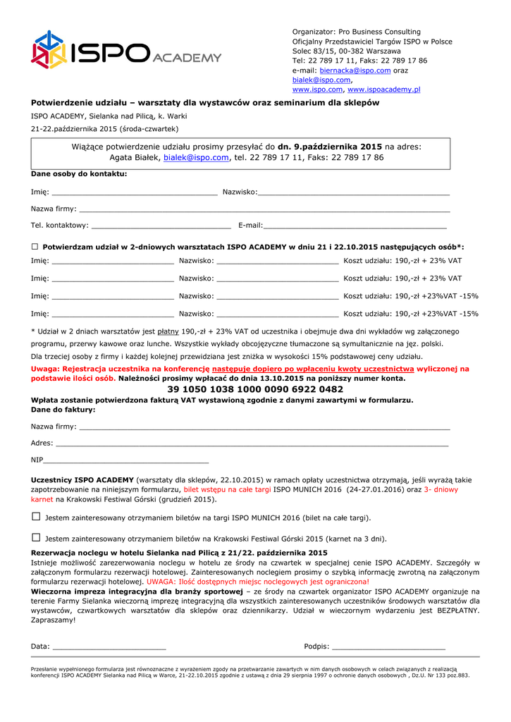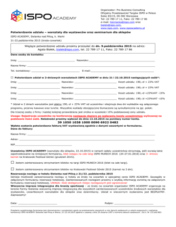 Organizator: Pro Business Consulting Oficjalny Przedstawiciel Targów ISPO w Polsce Solec 83/15, 00-382 Warszawa Tel: 22 789 17 11, Faks: 22 789 17 86 e-mail: [email protected] oraz [email protected], Organizator: Pro Business Consulting www.ispo.com, www.ispoacademy.pl Potwierdzenie udziału – warsztaty dla wystawców oraz seminarium dla sklepów ISPO ACADEMY, Sielanka nad Pilicą, k. Warki 21-22.października 2015 (środa-czwartek) Wiążące potwierdzenie udziału prosimy przesyłać do dn. 9.października 2015 na adres: Agata Białek, [email protected], tel. 22 789 17 11, Faks: 22 789 17 86 Dane osoby do kontaktu: Imię: ______________________________________ Nazwisko:____________________________________________ Nazwa firmy: _____________________________________________________________________________________ Tel. kontaktowy: ________________________________ □ E-mail:__________________________________________ Potwierdzam udział w 2-dniowych warsztatach ISPO ACADEMY w dniu 21 i 22.10.2015 następujących osób*: Imię: ____________________________ Nazwisko: ____________________________ Koszt udziału: 190,-zł + 23% VAT Imię: ____________________________ Nazwisko: ____________________________ Koszt udziału: 190,-zł + 23% VAT Imię: ____________________________ Nazwisko: ____________________________ Koszt udziału: 190,-zł +23%VAT -15% Imię: ____________________________ Nazwisko: ____________________________ Koszt udziału: 190,-zł +23%VAT -15% * Udział w 2 dniach warsztatów jest płatny 190,-zł + 23% VAT od uczestnika i obejmuje dwa dni wykładów wg załączonego programu, przerwy kawowe oraz lunche. Wszystkie wykłady obcojęzyczne tłumaczone są symultanicznie na jęz. polski. Dla trzeciej osoby z firmy i każdej kolejnej przewidziana jest zniżka w wysokości 15% podstawowej ceny udziału. Uwaga: Rejestracja uczestnika na konferencję następuje dopiero po wpłaceniu kwoty uczestnictwa wyliczonej na podstawie ilości osób. Należności prosimy wpłacać do dnia 13.10.2015 na poniższy numer konta. 39 1050 1038 1000 0090 6922 0482 Wpłata zostanie potwierdzona fakturą VAT wystawioną zgodnie z danymi zawartymi w formularzu. Dane do faktury: Nazwa firmy: _____________________________________________________________________________________ Adres: __________________________________________________________________________________________ NIP______________________________________ Uczestnicy ISPO ACADEMY (warsztaty dla sklepów, 22.10.2015) w ramach opłaty uczestnictwa otrzymają, jeśli wyrażą takie zapotrzebowanie na niniejszym formularzu, bilet wstępu na całe targi ISPO MUNICH 2016 (24-27.01.2016) oraz 3- dniowy karnet na Krakowski Festiwal Górski (grudzień 2015). □ Jestem zainteresowany otrzymaniem biletów na targi ISPO MUNICH 2016 (bilet na całe targi). □ Jestem zainteresowany otrzymaniem biletów na Krakowski Festiwal Górski 2015 (karnet na 3 dni). Rezerwacja noclegu w hotelu Sielanka nad Pilicą z 21/22. października 2015 Istnieje możliwość zarezerwowania noclegu w hotelu ze środy na czwartek w specjalnej cenie ISPO ACADEMY. Szczegóły w załączonym formularzu rezerwacji hotelowej. Zainteresowanych noclegiem prosimy o szybką informację zwrotną na załączonym formularzu rezerwacji hotelowej. UWAGA: Ilość dostępnych miejsc noclegowych jest ograniczona! Wieczorna impreza integracyjna dla branży sportowej – ze środy na czwartek organizator ISPO ACADEMY organizuje na terenie Farmy Sielanka wieczorną imprezę integracyjną dla wszystkich zainteresowanych uczestników środowych warsztatów dla wystawców, czwartkowych warsztatów dla sklepów oraz dziennikarzy. Udział w wieczornym wydarzeniu jest BEZPŁATNY. Zapraszamy! Data: __________________________ Podpis: __________________________ Przesłanie wypełnionego formularza jest równoznaczne z wyrażeniem zgody na przetwarzanie zawartych w nim danych osobowych w celach związanych z realizacją konferencji ISPO ACADEMY Sielanka nad Pilicą w Warce, 21-22.10.2015 zgodnie z ustawą z dnia 29 sierpnia 1997 o ochronie danych osobowych , Dz.U. Nr 133 poz.883.