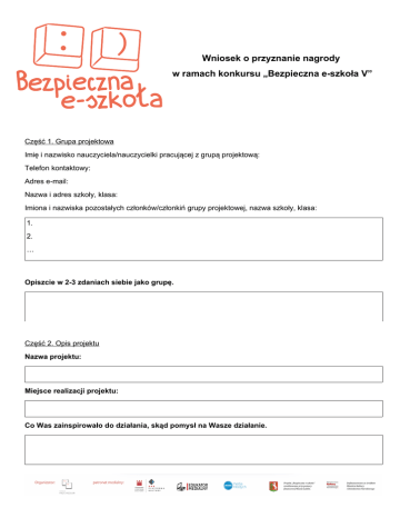 Wniosek o przyznanie nagrody w ramach konkursu „Bezpieczna e-szkoła V” Część 1. Grupa projektowa Imię i nazwisko nauczyciela/nauczycielki pracującej z grupą projektową: Telefon kontaktowy: Adres e-mail: Nazwa i adres szkoły, klasa: Imiona i nazwiska pozostałych członków/członkiń grupy projektowej, nazwa szkoły, klasa: 1. 2. … Opiszcie w 2-3 zdaniach siebie jako grupę. Część 2. Opis projektu Nazwa projektu: Miejsce realizacji projektu: Co Was zainspirowało do działania, skąd pomysł na Wasze działanie. Odbiorcy projektu (np. uczniowie i uczennice szkoły, mieszkańcy i mieszkanki osiedla, młodzież mieszkająca na terenie gminy, osoby starsze): Krótki opis projektu (jakiej tematyki dotyczył projekt? Na czym polegał?): W jaki sposób promowaliście edukację medialną w Waszym projekcie? Przewidywany efekt projektu i możliwość jego kontynuacji (co chcieliście osiągnąć w ramach projektu? Czy można go kontynuować i utrzymać efekt waszych działań?) Jakie napotkaliście po drodze trudności, jak sobie z nimi poradziliście? Kto, w jaki sposób i na jakim etapie mógłby wspierał Was w realizacji projektu? (wskażcie sojuszników, którzy Wam pomagali w realizacji projektu)