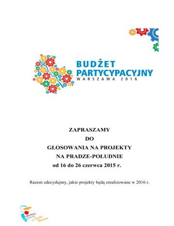 ZAPRASZAMY DO GŁOSOWANIA NA PROJEKTY NA PRADZE-POŁUDNIE od 16 do 26 czerwca 2015 r. Razem zdecydujmy, jakie projekty będą zrealizowane w 2016 r. W okresie 16 czerwca – 26 czerwca 2015 r. odbędzie się głosowanie na projekty złożone przez mieszkańców do budżetu partycypacyjnego. Każdy mieszkaniec Warszawy będzie mógł oddać głos na projekty, które jego zdaniem są najbardziej potrzebne! Projekty, które zdobędą najwięcej głosów zostaną zrealizowane w 2016 r. Zagłosować można papierowo lub przez Internet. Jak zagłosować na wybrane projekty – w kilku prostych krokach: KROK 1 – Wybieramy dzielnicę, w której chcemy oddać głos. Można głosować tylko w jednej dzielnicy, więc ten wybór jest ważny. KROK 2 – Wybieramy obszar w dzielnicy, na który chcemy oddać głos. Na Pradze- Południe można zagłosować na projekty z obszaru ogólnodzielnicowego oraz na projekty z jednego wybranego obszaru lokalnego. Praga-Południe podzielona została na 8 obszarów lokalnych: • Gocław • Grochów Południowy • Saska Kępa • Grochów Północny • Grochów Centrum • Kamionek • Grochów Kinowa • Przyczółek Grochowski KROK 3 – Sprawdzamy projekty, jakie zostały dopuszczone do głosowania w wybranym przez nas obszarze i wybieramy te projekty, które są naszym zdaniem najbardziej potrzebne. Lista projektów z ich pełnym opisem znajduje się na stronie internetowej: www.twojbudzet.um.warszawa.pl Można wybrać dowolną liczbę projektów, pamiętajmy jednak że łączny koszt realizacji wszystkich wybranych projektów nie może być większy niż kwota dostępna w wybranym obszarze i na poziomie ogólnodzielnicowym (w przeciwnym wypadku głos zostanie policzony jako nieważny). Można więc zagłosować na wiele tanich projektów lub tylko kilka droższych. Projekty ogólnodzielnicowe 834 292, 00 zł. • Gocław 792 372,00 zł • Grochów Południowy 645 042,00 zł • Saska Kępa 629 575,00 zł • Grochów Północny 442 643,00 zł • Grochów Centrum 306 705,00 zł • Kamionek 251 591,00 zł • Grochów Kinowa 183 149,00 zł • Przyczółek Grochowski 86 093 zł Razem na Pradze-Południe mamy do rozdysponowania 4 171 462,00 zł KROK 4 – ZAGŁOSUJ od 16 czerwca do 26 czerwca 2015 r. – można to zrobić na kilka sposobów: najłatwiej jest zagłosować przez Internet – na stronie www.twojbudzet.um.warszawa.pl zagłosować można również papierowo – przychodząc do Urzędu Dzielnicy PragaPołudnie m.st. Warszawy (w poniedziałki w godz. 8.00- 18.00, od wtorku do piątku w godz. 8.00 -16.00) i wrzucając do urny wypełnioną kartę do głosowania można również przekazać swój głos pocztą na adres - Urząd Dzielnicy Praga-Południe m.st. Warszawy ul. Grochowska 274, 03-841 Warszawa z dopiskiem „Budżet partycypacyjny 2016”. Żeby głos był ważny, musi wpłynąć do urzędu pomiędzy 16 a 26 czerwca 2015 r. (kartę do głosowania będzie można pobrać ze strony internetowej Urzędu Dzielnicy – www.pragapld.waw.pl od 16 czerwca 2015 r. lub w Wydziale Obsługi Mieszkańców). UWAGA! Każdy mieszkaniec Warszawy może oddać głos tylko raz! Jeżeli zagłosujemy więcej niż jeden raz (np. przez Internet i osobiście), wtedy wszystkie głosy zostaną uznane za nieważne. Jeżeli łączny koszt realizacji wybranych projektów przekroczy kwoty dostępne na poziomie ogólnodzielnicowym lub w obszarze lokalnym, głos również nie będzie ważny. Głosować mogą tylko osoby mieszkające w Warszawie (nie trzeba być jednak zameldowanym). W głosowaniu może wziąć udział każdy mieszkaniec Warszawy bez względu na wiek. Do dnia 10 lipca 2015 r. zostaną ogłoszone listy projektów (w każdym z obszarów), które zdobyły najwięcej głosów i będą zrealizowane w 2016 roku!