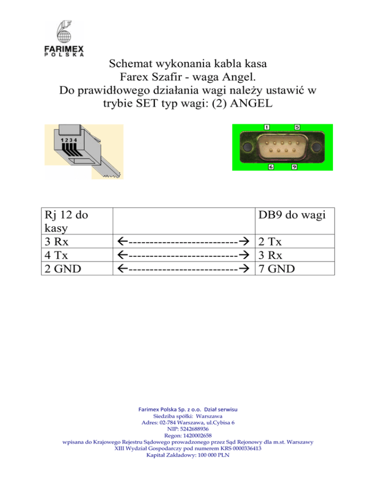 Schemat wykonania kabla kasa Farex Szafir - waga Angel. Do prawidłowego działania wagi naleŜy ustawić w trybie SET typ wagi: (2) ANGEL Rj 12 do kasy 3 Rx 4 Tx 2 GND DB9 do wagi -------------------------- 2 Tx -------------------------- 3 Rx -------------------------- 7 GND Farimex Polska Sp. z o.o. Dział serwisu Siedziba spółki: Warszawa Adres: 02-784 Warszawa, ul.Cybisa 6 NIP: 5242688936 Regon: 1420002658 wpisana do Krajowego Rejestru Sądowego prowadzonego przez Sąd Rejonowy dla m.st. Warszawy XIII Wydział Gospodarczy pod numerem KRS 0000336413 Kapitał Zakładowy: 100 000 PLN