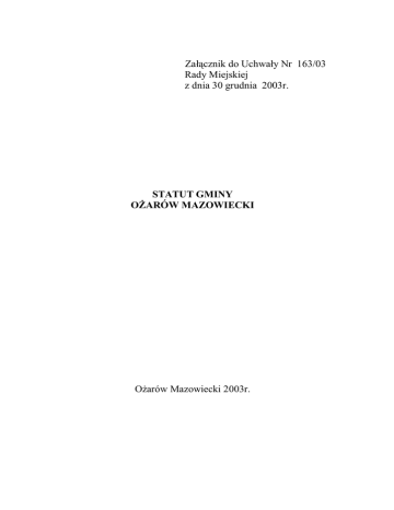 Załącznik do Uchwały Nr 163/03 Rady Miejskiej z dnia 30 grudnia 2003r. STATUT GMINY OŻARÓW MAZOWIECKI Ożarów Mazowiecki 2003r. Rozdział 1 Przepisy ogólne. §1 Miasto i Gmina Ożarów Mazowiecki zwana dalej gminą stanowi lokalną wspólnotę samorządową, którą z mocy prawa tworzą jego mieszkańcy. §2 Gmina obejmuje swoim zasięgiem miejscowości: miasto Ożarów Mazowiecki, wsie: Bronisze, Domaniewek I, Duchnice, Gołaszew, Jawczyce, Józefów, Kaputy, Konotopa, Koprki, Kręczki, Macierzysz, Michałówek, Mory, Myszczyn, Ołtarzew, Orły, Ożarów, Pilaszków, Piotrkówek Duży, Piotrkówek Mały, Płochocin, Pogroszew, Pogroszew Kolonia, Strzykuły, Szeligi, Święcice, Umiastów, Wieruchów, Wolica, Wolskie. §3 Siedzibą władz gminy jest miasto Ożarów Mazowiecki. §4 1. Gmina posiada osobowość prawną i stanowi samodzielną jednostkę samorządową. 2. Gmina wykonuje określone ustawami zadania publiczne w imieniu własnym i na własną odpowiedzialność. §5 Ilekroć w niniejszym Statucie jest mowa o: Gminie - należy przez to rozumieć wspólnotę samorządową Gminy Ożarów Mazowiecki oraz jej terytorium, Burmistrzu - należy przez to rozumieć Burmistrza Miasta i Gminy w Ożarowie Mazowieckim, Radzie - należy przez to rozumieć Radę Miejską w Ożarowie Mazowieckim, Przewodniczącym Rady - należy przez to rozumieć Przewodniczącego Rady Miejskiej w Ożarowie Mazowieckim, Urzędzie - należy przez to rozumieć Urząd Miasta i Gminy w Ożarowie Mazowieckim. §6 Symbolami graficznymi Miasta i Gminy są : herb, flaga i sztandar. §7 1. Herb miasta Ożarowa Mazowieckiego jest czteropolowy wg opisu jak niżej: Lewa strona nawiązuje do historii – płomienie symbolizują nazwę naszego miasta (wieś i folwark Pożarowy) – kolor czerwony Prawa strona symbolizuje zagłębie rolnicze. Czterolistna koniczyna symbolizuje szczęście i dobrze prosperujące rolnictwo na urodzajnych ziemiach – kolor zielony. 2. Zezwolenia na użycie herbu udziela Rada. 3. Wzór herbu określa załącznik nr 1 do Statutu. 2 §8 1. Barwami Gminy są kolory: czerwony, biały i zielony. 2. Flaga składa się z czterech pól ułożonych w szachownicę. 3. Flagę Gminy określa załącznik nr 2 do Statutu. §9 1. Gmina posiada sztandar nadany uchwałą Rady. 2. Na awersie sztandaru zamieszczony jest herb Ożarowa Mazowieckiego i napis: „Ożarów Mazowiecki”; na rewersie – emblemat obrazujący wieniec laurowy i napis: „Budujmy Wspólnie Mądrze i Sprawiedliwie”. 3. Wzór sztandaru określa załącznik nr 3 do Statutu. § 10 1. Ustanawia się insygnia dla Burmistrza w postaci łańcucha z Herbem Miasta. 2. Insygniów używa Burmistrz w oficjalnych wystąpieniach podczas uroczystości państwowych i gminnych. § 11 Do zakresu działania gminy należy wykonywanie określonych ustawami zadań publicznych o znaczeniu lokalnym, niezastrzeżonych ustawami na rzecz innych podmiotów. Rozdział 2 Organy gminy. § 12 Organami gminy są: 1/ Rada, 2/ Burmistrz. Rada § 13 1. Rada jest organem stanowiącym i kontrolnym gminy. 2. Kadencja rady trwa 4 lata, licząc od dnia wyborów. 3. Radni są wybierani w wyborach bezpośrednich. Zasady i tryb przeprowadzenia wyborów do rady określają przepisy regulujące wybory do rad gmin, rad powiatów i sejmików wojewódzkich. 4. Szczegółowy tryb prac rady określa załącznik nr 4 do Statutu. § 14 Do wyłącznej właściwości Rady należy wykonywanie zadań określonych w ustawie o samorządzie gminnym. § 15 Uchwały Rady zapadają zwykłą większością głosów w obecności co najmniej połowy ustawowego składu rady, w głosowaniu jawnym, chyba że ustawa stanowi inaczej. 3 § 16 1. Przewodniczący Rady przygotowuje i zwołuje sesje rady. 2. W tym celu zwołuje Komisję organizacyjną - Konwent. 3. W skład Komisji organizacyjnej - Konwentu wchodzą: Przewodniczący Rady, Dwóch Wiceprzewodniczących, Przewodniczący Komisji Stałych Przewodniczący klubów 4. W posiedzeniach Komisji organizacyjnej - Konwentu uczestniczy Burmistrz. 5. W posiedzeniach Komisji organizacyjnej - Konwentu mogą brać udział pozostali radni. § 17 Gmina gromadzi i udostępnia w swojej siedzibie zbiór aktów prawa miejscowego. § 18 1. Organy gminy działają jawnie, co obejmuje w szczególności: a) prawo obywateli do wstępu na sesje Rady i posiedzenia jej komisji w charakterze obserwatorów, b) prawo do uzyskiwania od pracowników gminy odpowiedzialnych za przygotowanie pracy Rady wszelkich informacji z zakresu jej działania, w zakresie określonym w ust. 2, c) prawo do zapoznania się z dokumentami wynikającymi z wykonywanych przez gminę zadań publicznych, w tym protokołów z sesji Rady, posiedzeń komisji rady oraz zarządzeń Burmistrza – w zakresie sprecyzowanych zainteresowań wnioskujących. 2. Przedstawione do wglądu dokumenty, o których mowa w ust. 1 pkt. c będą udostępniane zainteresowanym tylko w tym zakresie, który nie narusza uregulowań wynikających z ustaw szczególnych. 1. 2. 3. 4. 5. 6. § 19 Obywatel chcący zapoznać się z dokumentami powinien złożyć do pracownika obsługującego Radę pisemny wniosek zawierający wykaz dokumentów, z którymi chciałby się zapoznać. Pracownicy Urzędu są zobowiązani w terminie 7 dni od daty złożenia wniosku przygotować żądaną dokumentację oraz poinformować zainteresowanego o terminie, w jakim dokumentacja będzie dostępna do wglądu. Osoby zainteresowane otrzymaniem kopii wnioskowanych dokumentów muszą zaznaczyć to we wniosku. Za sporządzenie kserokopii dokumentów zainteresowany uiszcza opłatę, której wysokość określają odrębne przepisy. Pracownik obsługujący Radę prowadzi ewidencję wniosków i sporządzonych kserokopii dokumentów. Zainteresowany może przeglądać oryginały dokumentów oraz dokonywać odpisów i wyciągów z dokumentów jedynie w obecności pracownika obsługującego Radę. 4 1. 2. 3. 4. 5. § 20 Rada kontroluje działalność Burmistrza o