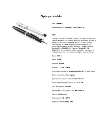 Opis produktu Kod: 19447-01 Nazwa produktu: Długopis touch QUATRO Opis: Długopis wykonany z metalu łączący aż cztery praktyczne funkcje: długopis, touch pen, wskaźnik laserowy, latarka. W jednym przyrządzie mieści się wszystko czego można potrzebować w czasie prezentacji multimedialnej lub innych biznesowych spotkań. Zgodnie z dyrektywą Unii Europejskiej (2006/25/EU) i Normą Polska ( PN-EN 60825-1:2005) wskaźnik posiada naklejkę informującą o niebezpieczeństiwe użytkowania. Logo wygrawerujemy. Cena: 9,39 zł Kolor: biały Materiał: metal Wymiary: 124 x 10 mm Znakowanie produktu: grawerowanie GM (5 x 40 mm) Znakowanie etui: nie dotyczy Opakowanie produktu: woreczek foliowy Waga jednostkowa brutto (w kg): 0.0150 Ilość w kartonie: 50 / 500 Wymiar kart. zbiorczego (cm): 43/30/10,5 Baterie: dołączone Rodzaj baterii: 3 x LR41 Kod Celny: 9608 1092 000 Powered by TCPDF (www.tcpdf.org)