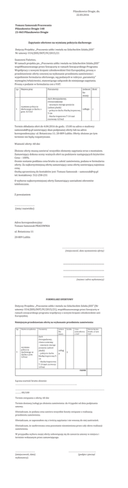 Pilaszkowice Drugie, dn. 22.03.2016 Tomasz Samoszuk Pracowania Pilaszkowice Drugie 148 21-065 Pilaszkowice Drugie Zapytanie ofertowe na wymianê pokrycia dachowego Dotyczy Projektu: „Pracownia szk³a i metalu na Szlacheckim Szlaku JIIIS” Nr umowy: U14/JIIIS/DOT/IV/2015/21 Szanowni Pañstwo, W ramach projektu pn. „Pracownia szk³a i metalu na Szlacheckim Szlaku JIIIS” wspó³finansowanego przez Szwajcariê w ramach Szwajcarskiego Programu Wspó³pracy z nowymi krajami cz³onkowskimi Unii Europejskiej, proszê o przedstawienie oferty cenowej na wykonanie przedmiotu zamówienia i wype³nienie formularza ofertowego, wg podanych w rubryce „parametry” wymogów/w³aœciwoœci, stanowi¹cego za³¹cznik do niniejszego zapytania. Proszê o podanie w formularzu cen z VAT. Termin sk³adania ofert do 4.04.2016 do godz.: 15.00 na adres e-mailowy: [email protected] zawieraj¹cy skan podpisanej oferty lub na adres korespondencyjny: ul. Botaniczna 11; 20-809 Lublin. Oferty z³o¿one po tym terminie nie bêd¹ rozpatrywane. Wa¿noœæ oferty: 60 dni Z³o¿one oferty musz¹ zawieraæ wszystkie elementy zapytania wraz z monta¿em. Zamawiaj¹cy dokona oceny wa¿nych ofert na podstawie nastêpuj¹cych kryteriów: Cena – 100%. Ocenie zostanie poddana cena brutto za ca³oœæ zamówienia, podana w formularzu oferty. Za najkorzystniejsz¹ ofertê zamawiaj¹cy uzna ofertê zawieraj¹c¹ najni¿sza cenê. Osob¹ uprawnion¹ do kontaktów jest: Tomasz Samoszuk – [email protected] tel. kontaktowy: 512-258-231 O wyborze najkorzystniejszej oferty Zamawiaj¹cy zawiadomi oferentów telefonicznie. Z powa¿aniem …………………………. (imiê i nazwisko) Adres korespondencyjny: Tomasz Samoszuk PRACOWNIA ul. Botaniczna 11 20-809 Lublin …………………………………………………………….. (miejscowoœæ, data wystawienia oferty) …………………………………………………………. …………………………………………………………. …………………………………………………………. (nazwa i adres wykonawcy) FORMULARZ OFERTOWY Dotyczy Projektu: „Pracownia szk³a i metalu na Szlacheckim Szlaku JIIIS” (Nr umowy: U14/JIIIS/DOT/IV/2015/21), wspó³finansowanego przez Szwajcariê w ramach szwajcarskiego programu wspó³pracy z nowymi krajami cz³onkowskimi unii Europejskiej. Niniejszym przedstawiam ofertê na wykonanie przedmiotu zamówienia: £¹czna wartoœæ brutto s³ownie: ………………………………………………………………………………………….. …………………………………………………………………………………………………………………………………… ………. 00/100 Termin zwi¹zania z ofert¹: 60 dni Termin dostawy/us³ugi po z³o¿eniu zamówienia: do 4 tygodni od dnia podpisania umowy. Oœwiadczam, ¿e podana cena zawiera wszystkie koszty zwi¹zane z realizacj¹ przedmiotu zamówienia. Oœwiadczam, ze zapozna³em siê z treœci¹ zapytania i nie wnoszê do niej zastrze¿eñ. Oœwiadczam, ¿e zaoferowana cena pozostanie niezmieniona przez ca³y okres realizacji zamówienia. W przypadku wyboru mojej oferty zobowi¹zujê siê do zawarcia umowy w miejscu i terminie wskazanym przez zamawiaj¹cego. …………………………… (miejscowoœæ, data) wykonawcy) ………………………………………. (podpis i pieczêæ