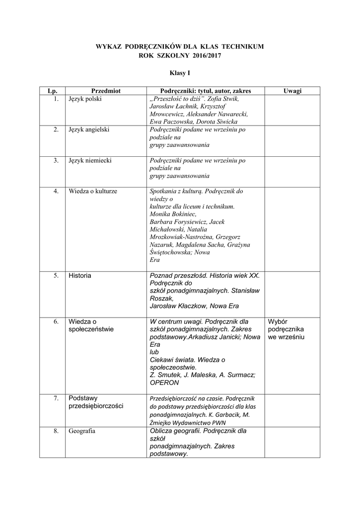 WYKAZ PODRĘCZNIKÓW DLA KLAS TECHNIKUM ROK SZKOLNY 2016/2017 Klasy I Lp. 1. Przedmiot Język polski Podręczniki: tytuł, autor, zakres „Przeszłość to dziś”. Zofia Stwik, Jarosław Łachnik, Krzysztof Mrowcewicz, Aleksander Nawarecki, Ewa Paczowska, Dorota Siwicka Podręczniki podane we wrześniu po podziale na grupy zaawansowania 2. Język angielski 3. Język niemiecki Podręczniki podane we wrześniu po podziale na grupy zaawansowania 4. Wiedza o kulturze Spotkania z kulturą. Podręcznik do wiedzy o kulturze dla liceum i technikum. Monika Bokiniec, Barbara Forysiewicz, Jacek Michałowski, Natalia Mrozkowiak-Nastrożna, Grzegorz Nazaruk, Magdalena Sacha, Grażyna Świętochowska; Nowa Era 5. Historia Poznad przeszłośd. Historia wiek XX. Podręcznik do szkół ponadgimnazjalnych. Stanisław Roszak, Jarosław Kłaczkow, Nowa Era 6. Wiedza o społeczeństwie W centrum uwagi. Podręcznik dla szkół ponadgimnazjalnych. Zakres podstawowy.Arkadiusz Janicki; Nowa Era lub Ciekawi świata. Wiedza o społeczeostwie. Z. Smutek, J. Maleska, A. Surmacz; OPERON 7. Podstawy przedsiębiorczości 8. Geografia Przedsiębiorczość na czasie. Podręcznik do podstawy przedsiębiorczości dla klas ponadgimnazjalnych. K. Garbacik, M. Żmiejko Wydawnictwo PWN Oblicza geografii. Podręcznik dla szkół ponadgimnazjalnych. Zakres podstawowy. Uwagi Wybór podręcznika we wrześniu Radosław Uliszak, Krzysztof Wiederman; Nowa Era 9. Chemia To jest chemia. Podręcznik dla szkół ponadgimnazjalnyc h. Zakres podstawowy. Romuald Hassa, Aleksander Mrzigod, Janusz Mrzigod. Nowa Era 10. Biologia Ciekawi świata. Biologia. Zakres podstawowy. Agnieszka Baca, Małgorzata Łaszczyca, Piotr Łaszczyca, Grażyna Skirmunt, Krzysztof Skirmunt. OPERON 11. Fizyka Świat fizyki. Podręcznik dla szkół ponadgimnazjalnych. Zakres podstawowy.red. Maria Fiałkowska, ZamKor 12. Matematyka Matematyka. Zbiór zadao do liceum i technikum. Klasa 1; Poziom podstawowy.M. Kurczab, E. Kurczab, E. Świda, K. Pazdro 13. Informatyka Informatyka. Zakres podstawowy. Arkadiusz Gawełek; OPERON 14. Edukacja dla bezpieczeństwa Odkrywamy na nowo. Edukacja dla bezpieczeństwa. Mariusz Goniewicz, Anna W. Nowak-Kowal, Zbigniew Smutek; OPERON