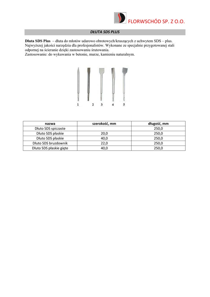 FLORWSCHÓD SP. Z O.O. DŁUTA SDS PLUS Dłuta SDS Plus – dłuta do młotów udarowo obrotowych/kruszących z uchwytem SDS – plus. Najwyższej jakości narzędzia dla profesjonalistów. Wykonane ze specjalnie przygotowanej stali odpornej na ścieranie dzięki zastosowaniu śrutowania. Zastosowanie: do wykuwania w betonie, murze, kamieniu naturalnym. nazwa Dłuto SDS spiczaste Dłuto SDS płaskie Dłuto SDS płaskie Dłuto SDS bruzdownik Dłuto SDS płaskie gięte szerokość, mm 20,0 40,0 22,0 40,0 długość, mm 250,0 250,0 250,0 250,0 250,0