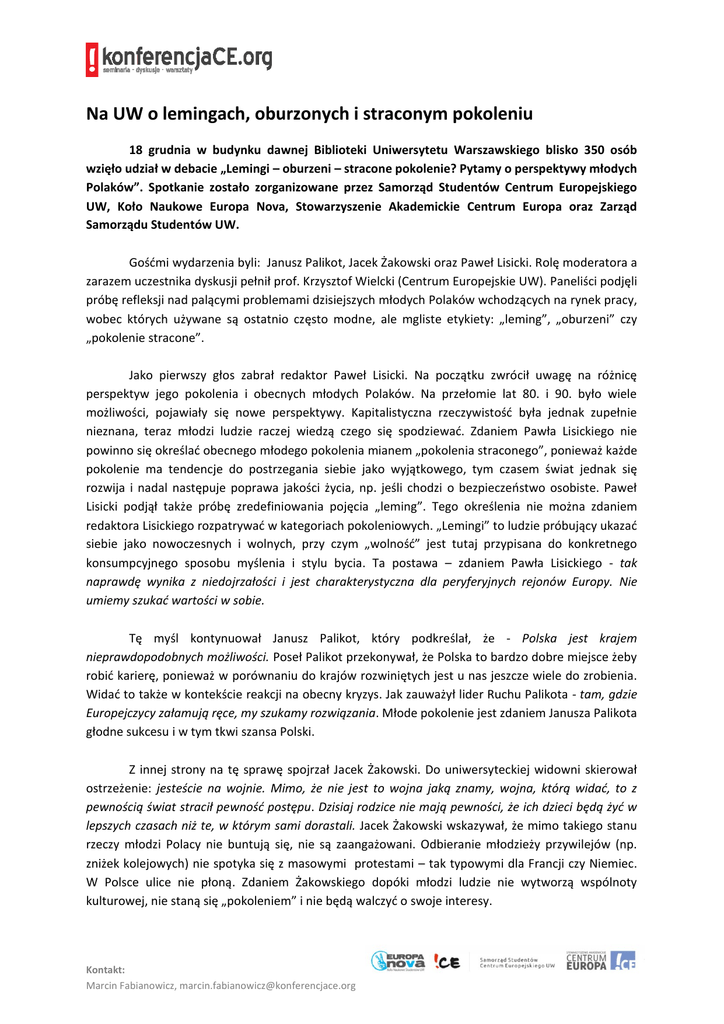 Na UW o lemingach, oburzonych i straconym pokoleniu 18 grudnia w budynku dawnej Biblioteki Uniwersytetu Warszawskiego blisko 350 osób wzięło udział w debacie „Lemingi – oburzeni – stracone pokolenie? Pytamy o perspektywy młodych Polaków”. Spotkanie zostało zorganizowane przez Samorząd Studentów Centrum Europejskiego UW, Koło Naukowe Europa Nova, Stowarzyszenie Akademickie Centrum Europa oraz Zarząd Samorządu Studentów UW. Gośćmi wydarzenia byli: Janusz Palikot, Jacek Żakowski oraz Paweł Lisicki. Rolę moderatora a zarazem uczestnika dyskusji pełnił prof. Krzysztof Wielcki (Centrum Europejskie UW). Paneliści podjęli próbę refleksji nad palącymi problemami dzisiejszych młodych Polaków wchodzących na rynek pracy, wobec których używane są ostatnio często modne, ale mgliste etykiety: „leming”, „oburzeni” czy „pokolenie stracone”. Jako pierwszy głos zabrał redaktor Paweł Lisicki. Na początku zwrócił uwagę na różnicę perspektyw jego pokolenia i obecnych młodych Polaków. Na przełomie lat 80. i 90. było wiele możliwości, pojawiały się nowe perspektywy. Kapitalistyczna rzeczywistość była jednak zupełnie nieznana, teraz młodzi ludzie raczej wiedzą czego się spodziewać. Zdaniem Pawła Lisickiego nie powinno się określać obecnego młodego pokolenia mianem „pokolenia straconego”, ponieważ każde pokolenie ma tendencje do postrzegania siebie jako wyjątkowego, tym czasem świat jednak się rozwija i nadal następuje poprawa jakości życia, np. jeśli chodzi o bezpieczeństwo osobiste. Paweł Lisicki podjął także próbę zredefiniowania pojęcia „leming”. Tego określenia nie można zdaniem redaktora Lisickiego rozpatrywać w kategoriach pokoleniowych. „Lemingi” to ludzie próbujący ukazać siebie jako nowoczesnych i wolnych, przy czym „wolność” jest tutaj przypisana do konkretnego konsumpcyjnego sposobu myślenia i stylu bycia. Ta postawa – zdaniem Pawła Lisickiego - tak naprawdę wynika z niedojrzałości i jest charakterystyczna dla peryferyjnych rejonów Europy. Nie umiemy szukać wartości w sobie. Tę myśl kontynuował Janusz Palikot, który podkreślał, że - Polska jest krajem nieprawdopodobnych możliwości. Poseł Palikot przekonywał, że Polska to bardzo dobre miejsce żeby robić karierę, ponieważ w porównaniu do krajów rozwiniętych jest u nas jeszcze wiele do zrobienia. Widać to także w kontekście reakcji na obecny kryzys. Jak zauważył lider Ruchu Palikota - tam, gdzie Europejczycy załamują ręce, my szukamy rozwiązania. Młode pokolenie jest zdaniem Janusza Palikota głodne sukcesu i w tym tkwi szansa Polski. Z innej strony na tę sprawę spojrzał Jacek Żakowski. Do uniwersyteckiej widowni skierował ostrzeżenie: jesteście na wojnie. Mimo, że nie jest to wojna jaką znamy, wojna, którą widać, to z pewnością świat stracił pewność postępu. Dzisiaj rodzice nie mają pewności, że ich dzieci będą żyć w lepszych czasach niż te, w którym sami dorastali. Jacek Żakowski wskazywał, że mimo takiego stanu rzeczy młodzi Polacy nie buntują się, nie są zaangażowani. Odbieranie młodzieży przywilejów (np. zniżek kolejowych) nie spotyka się z masowymi protestami – tak typowymi dla Francji czy Niemiec. W Polsce ulice nie płoną. Zdaniem Żakowskiego dopóki młodzi ludzie nie wytworzą wspólnoty kulturowej, nie staną się „pokoleniem” i nie będą walczyć o swoje interesy. Kontakt: Marcin Fabianowicz, [email protected] Profesor Wielecki podkreślił, że zerwana została solidarność międzypokoleniowa. Nie rodzi to jednak buntu, powszechne jest raczej „przystosowywanie się”. Z drugiej strony, Krzysztof Wielecki zauważył, że młodzi Polacy dopiero zauważają swoją siłę – objawiła się ona chociażby w protestach przeciwko ACTA. Wątek ten zauważył również Jacek Żakowski w haśle: You will never unplugged us! Nawiązując do myśli Alaina Touraine’a, stwierdził on, że realny wybuch nastąpi, gdy ktoś odłączy społeczeństwo od prądu, czyli od rozmaitych form zaangażowania zastępczego typowych dla społeczeństwa konsumpcyjnego – nazwanego (na dużo przed powstaniem terminu lemingi) konsumariatem. Nic nie powoduje buntu i nie jednoczy tak, jak zamach na wolność Internetu. W dalszej części dyskusji, podczas replik pomiędzy uczestnikami dyskusji oraz sesji pytań od gości debaty prelegenci zastanawiali się nad różnicami w perspektywach młodych Polaków poprzednich pokoleń, dyskutowali nad możliwościami obecnych 20 i 30-latków oraz o tym jak można odblokować energię Polaków i jaką rolę może tutaj pełnić edukacja. Goście debaty kierowali do prelegentów pytania dotyczące szkolnictwa wyższego i jego znaczenia w budowaniu perspektyw dla młodego pokolenia. Pytali także czy naprawdę warto się oburzać, co państwo powinno robić, żeby wesprzeć młodych ludzi, oraz jakie są szanse na rozwój przemysłu w Polsce. Mimo różnicy światopoglądów, być może pod wpływem uniwersyteckiej atmosfery, uczestnicy debaty doszli do korespondujących diagnoz. Janusz Palikot i Paweł Lisicki zgodzili się, że Polska to kraj wyjątkowych możliwości, któremu potrzeba młodych ambitnych ludzi, którzy przeciwstawią się trendom i zaczną je kreować, zaś Jacek Żakowski i Krzysztof Wielecki dość zgodnie podkreślali, iż zdolność do wyrażania oburzenia społecznego jest warunkiem pozytywnej zmiany. Jak jednak podkreślał Jacek Żakowski: nie nawołuję do oburzania się bez powodu. – Powodów jest naprawdę sporo – dodał Krzysztof Wielecki. Organizatorzy: Samorząd Studentów Centrum Europejskiego UW Od wielu lat Samorząd !CE to rozpoznawalny wśród studentów, absolwentów i kadry dydaktycznej organizator wydarzeń związanych z kulturą i studenckim ruchem naukowym. Do jego składu od lat dołączają osoby pomysłowe i zaangażowane w rozwój społeczności Centrum Europejskiego U