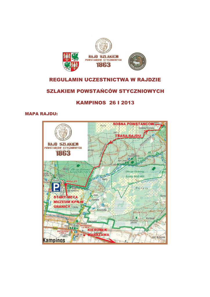 REGULAMIN UCZESTNICTWA W RAJDZIE SZLAKIEM POWSTAŃCÓW STYCZNIOWYCH KAMPINOS 26 I 2013 MAPA RAJDU: PROGRAM IMPREZY : WARUNKI UCZESTNICTWA TRASA RAJDU: 1 – TRASA WYTYCZONA ZOSTAŁA Z PARKINGU PRZY MUZEUM KPN W GRANICY DO SOSNY POWSTAŃCÓW Z METĄ W MIEJSCU STARTU - SZLAK ZIELONY 15 KM. 2 – UCZESTNICY RAJDU PORUSZAJĄ SIĘ PO SPECJALNIE WYTYCZONYCH TORACH, ZABRANIA SIĘ ZEJŚCIA Z TORU ORAZ KONTYNUACJI RAJDU POZA SZLAKIEM. UCZESTNICY: 3 – UCZESTNICY PROSZENI SĄ O ZGŁOSZENIE SIĘ DO BIURA RAJDU NIE PÓŻNIEJ NIŻ DO GODZ. 10:30 4 – UCZESTNICY RAJDU BIORĄ UDZIAŁ NA WŁASNĄ ODPOWIEDZIALNOŚĆ I PONOSZĄ PEŁNOPRAWNĄ ODPOWIEDZIALNOŚĆ ZA SWOJE CZYNY. 5 – MAŁOLETNI UCZESTNICY RAJDU MOGĄ BRAĆ UDZIAŁ W IMPREZIE ZA PISEMNĄ ZGODĄ RODZICÓW LUB PEŁNOPRAWNYCH OPIEKUNÓW - DOKUMENT DO PODPISU W BIURZE ZAWODÓW. 6 – ZAPISY PROWADZONE SĄ NA EMAIL : [email protected] LUB TEL. 517 143 924. REGULAMIN KPN: 1 – UCZESTNICY ZOBOWIĄZNI SĄ DO PRZESTRZEGANIA REGULAMINU KAMPINOWSKIEGO PARKU NARODOWEGO.