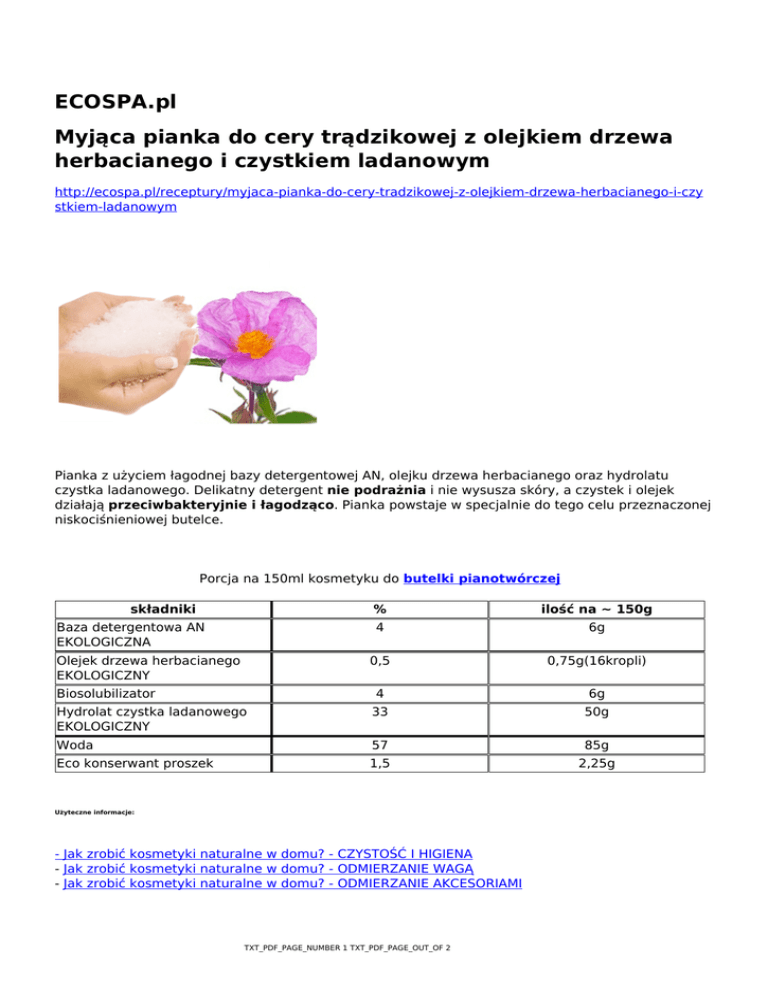 ECOSPA.pl Myjąca pianka do cery trądzikowej z olejkiem drzewa herbacianego i czystkiem ladanowym http://ecospa.pl/receptury/myjaca-pianka-do-cery-tradzikowej-z-olejkiem-drzewa-herbacianego-i-czy stkiem-ladanowym Pianka z użyciem łagodnej bazy detergentowej AN, olejku drzewa herbacianego oraz hydrolatu czystka ladanowego. Delikatny detergent nie podrażnia i nie wysusza skóry, a czystek i olejek działają przeciwbakteryjnie i łagodząco. Pianka powstaje w specjalnie do tego celu przeznaczonej niskociśnieniowej butelce. Porcja na 150ml kosmetyku do butelki pianotwórczej składniki % ilość na ~ 150g 4 6g 0,5 0,75g(16kropli) 4 6g Hydrolat czystka ladanowego EKOLOGICZNY 33 50g Woda 57 85g Eco konserwant proszek 1,5 2,25g Baza detergentowa AN EKOLOGICZNA Olejek drzewa herbacianego EKOLOGICZNY Biosolubilizator Użyteczne informacje: - Jak zrobić kosmetyki naturalne w domu? - CZYSTOŚĆ I HIGIENA - Jak zrobić kosmetyki naturalne w domu? - ODMIERZANIE WAGĄ - Jak zrobić kosmetyki naturalne w domu? - ODMIERZANIE AKCESORIAMI TXT_PDF_PAGE_NUMBER 1 TXT_PDF_PAGE_OUT_OF 2 Akcesoria przydatne do zrobienia receptury: - Waga - Łyżka miarowa poj. 1ml - Bagietka z łopatką 15cm - Zlewka skalowana 250ml Sposób przygotowania: (1) W naczyniu np. zlewce 250 ml odmierz olejek drzewa herbacianego oraz biosolubilizator, składniki wymieszaj. (2) Następnie dodaj hydrolat, wodę (przegotowaną, ostudzoną), dodaj eco konserwant w proszku i delikatnie mieszaj (aby nie spienić roztworu) do momentu aż konserwant w całości rozpuści się. (3) Na koniec dodaj bazę AN delikatnie mieszając. (4) Całość przelej do butelki pianotwórczej. Przechowywanie stosowanie termin przydatności w lodówce (niekonserwowany) lub na półce (konserwowany) codziennie dwa tygodnie (bez konserwantu), 3 miesiące (konserwowany) Każdorazowo przed użyciem dobrze wstrząśnij. TXT_PDF_PAGE_NUMBER 2 TXT_PDF_PAGE_OUT_OF 2