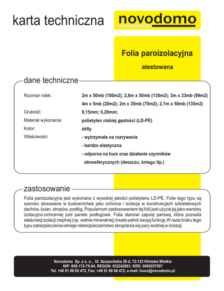 karta techniczna Folia paroizolacyjna atestowana dane techniczne Rozmiar rolek : 2m x 50mb (100m2); 2,6m x 50mb (130m2); 3m x 33mb (99m2) 4m x 5mb (20m2); 2m x 35mb (70m2); 2,7m x 50mb (135m2) Gruboœæ: 0,15mm; 0,20mm; Materia³ wykonania: polietylen niskiej gêstoœci (LD-PE) Kolor: ¿ó³ty W³aœciwoœci - wytrzyma³a na rozrywanie - bardzo elastyczna - odporna na kurz oraz dzia³anie czynników atmosferycznych (deszczu, œniegu itp.) zastosowanie Folia paroizolacyjna jest wykonana z wysokiej jakoúci polietylenu LD-PE. Folie tego typu sà szeroko stosowane w budownictwie jako ochrona i izolacja w konstrukcjach szkieletowych dachów, úcian, stropów, podùóg. Popularnym zastosowaniem tej folii jest uýycie jej jako warstwy izolacyjno-ochronnej pod panele podùogowe. Folia stanowi zaporæ parowà, która pozwala wùaúciwej izolacji cieplnej (np. weùnie mineralnej) trwale peùniã swojà funkcjæ.W razie braku tego typu zabezpieczenia istnieje niebezpieczeñstwo skraplania siæ pary wodnej w izolacji. Novodomo Sp. z o. o., Ul. Szczeciñska 28 d, 72-123 Kliniska Wielkie NIP: 856-172-75-04, REGON: 932242061, KRS: 0000257597 Tel. +48 91 88 65 472, Fax: +48 91 88 66 472, e-mail: [email protected]