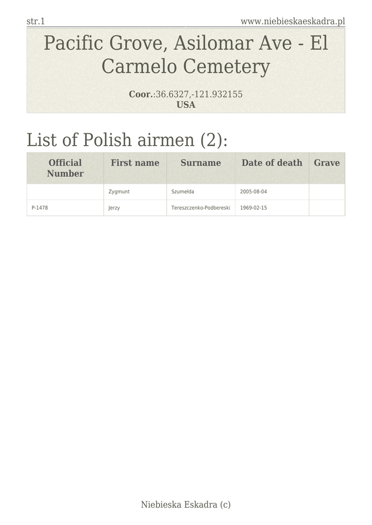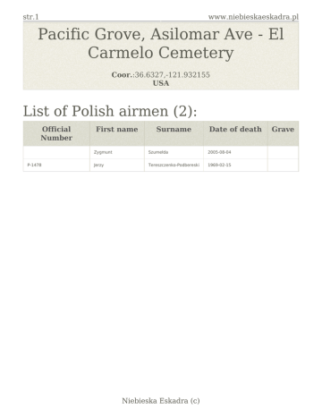 str.1 www.niebieskaeskadra.pl Pacific Grove, Asilomar Ave - El Carmelo Cemetery Coor.:36.6327,-121.932155 USA List of Polish airmen (2): Official Number P-1478 First name Surname Date of death Zygmunt Szumełda 2005-08-04 Jerzy Tereszczenko-Podbereski 1969-02-15 Niebieska Eskadra (c) Grave