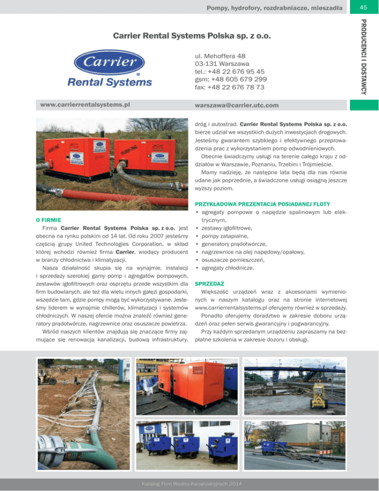 Pompy, hydrofory, rozdrabniacze, mieszadła ul. Mehoffera 48 03-131 Warszawa tel.: +48 22 676 95 45 gsm: +48 605 679 299 fax: +48 22 676 78 73 www.carrierrentalsystems.pl [email protected] dróg i autostrad. Carrier Rental Systems Polska sp. z o.o. bierze udział we wszystkich dużych inwestycjach drogowych. Jesteśmy gwarantem szybkiego i efektywnego przeprowadzenia prac z wykorzystaniem pomp odwodnieniowych. Obecnie świadczymy usługi na terenie całego kraju z oddziałów w Warszawie, Poznaniu, Trzebini i Trójmieście. Mamy nadzieję, że następne lata będą dla nas równie udane jak poprzednie, a świadczone usługi osiągną jeszcze wyższy poziom. O FIRMIE Firma Carrier Rental Systems Polska sp. z o.o. jest obecna na rynku polskim od 14 lat. Od roku 2007 jesteśmy częścią grupy United Technologies Corporation, w skład której wchodzi również firma Carrier, wiodący producent w branży chłodnictwa i klimatyzacji. Nasza działalność skupia się na wynajmie, instalacji i sprzedaży szerokiej gamy pomp i agregatów pompowych, zestawów igłofiltrowych oraz osprzętu przede wszystkim dla firm budowlanych, ale też dla wielu innych gałęzi gospodarki, wszędzie tam, gdzie pompy mogą być wykorzystywane. Jesteśmy liderem w wynajmie chillerów, klimatyzacji i systemów chłodniczych. W naszej ofercie można znaleźć również generatory prądotwórcze, nagrzewnice oraz osuszacze powietrza. Wśród naszych klientów znajdują się znaczące firmy zajmujące się renowacją kanalizacji, budową infrastruktury, PRZYKŁADOWA PREZENTACJA POSIADANEJ FLOTY • agregaty pompowe o napędzie spalinowym lub elektrycznym, • zestawy igłofiltrowe, • pompy zatapialne, • generatory prądotwórcze, • nagrzewnice na olej napędowy/opałowy, • osuszacze pomieszczeń, • agregaty chłodnicze. SPRZEDAŻ Większość urządzeń wraz z akcesoriami wymienionych w naszym katalogu oraz na stronie internetowej www.carrierrentalsystems.pl oferujemy również w sprzedaży. Ponadto oferujemy doradztwo w zakresie doboru urządzeń oraz pełen serwis gwarancyjny i pogwarancyjny. Przy każdym sprzedanym urządzeniu zapraszamy na bezpłatne szkolenia w zakresie dozoru i obsługi. Katalog Firm Wodno-Kanalizacyjnych 2014 PRODUCENCI I DOSTAWCY Carrier Rental Systems Polska sp. z o.o. 45