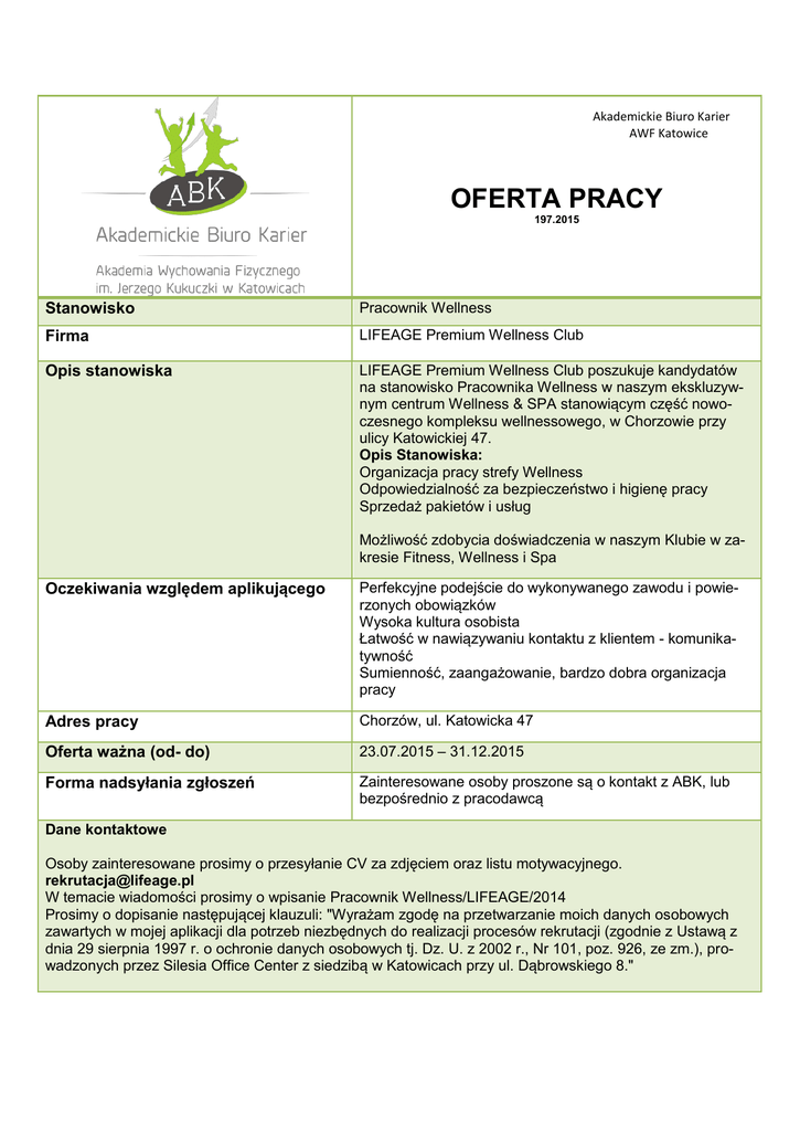 Akademickie Biuro Karier AWF Katowice OFERTA PRACY 197.2015 Stanowisko Pracownik Wellness Firma LIFEAGE Premium Wellness Club Opis stanowiska LIFEAGE Premium Wellness Club poszukuje kandydatów na stanowisko Pracownika Wellness w naszym ekskluzywnym centrum Wellness & SPA stanowiącym część nowoczesnego kompleksu wellnessowego, w Chorzowie przy ulicy Katowickiej 47. Opis Stanowiska: Organizacja pracy strefy Wellness Odpowiedzialność za bezpieczeństwo i higienę pracy Sprzedaż pakietów i usług Możliwość zdobycia doświadczenia w naszym Klubie w zakresie Fitness, Wellness i Spa Oczekiwania względem aplikującego Perfekcyjne podejście do wykonywanego zawodu i powierzonych obowiązków Wysoka kultura osobista Łatwość w nawiązywaniu kontaktu z klientem - komunikatywność Sumienność, zaangażowanie, bardzo dobra organizacja pracy Adres pracy Chorzów, ul. Katowicka 47 Oferta ważna (od- do) 23.07.2015 – 31.12.2015 Forma nadsyłania zgłoszeń Zainteresowane osoby proszone są o kontakt z ABK, lub bezpośrednio z pracodawcą Dane kontaktowe Osoby zainteresowane prosimy o przesyłanie CV za zdjęciem oraz listu motywacyjnego. [email protected] W temacie wiadomości prosimy o wpisanie Pracownik Wellness/LIFEAGE/2014 Prosimy o dopisanie następującej klauzuli: "Wyrażam zgodę na przetwarzanie moich danych osobowych zawartych w mojej aplikacji dla potrzeb niezbędnych do realizacji procesów rekrutacji (zgodnie z Ustawą z dnia 29 sierpnia 1997 r. o ochronie danych osobowych tj. Dz. U. z 2002 r., Nr 101, poz. 926, ze zm.), prowadzonych przez Silesia Office Center z siedzibą w Katowicach przy ul. Dąbrowskiego 8."