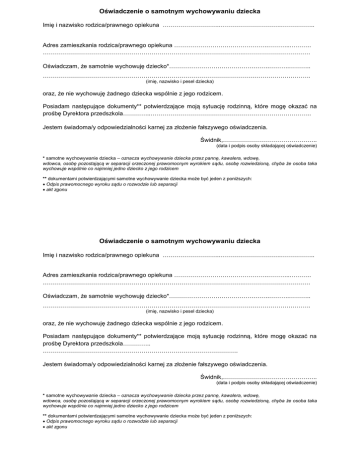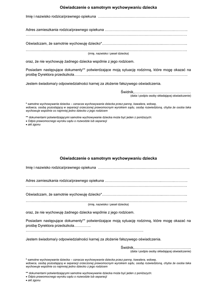 Oświadczenie o samotnym wychowywaniu dziecka Imię i nazwisko rodzica/prawnego opiekuna ……………………….………………………….…………….. Adres zamieszkania rodzica/prawnego opiekuna ………………………………………..………..……….. ……………………………………………………………………………………….…………………………… Oświadczam, że samotnie wychowuję dziecko*…………………………………………..……….……….. ……………………………………………………………………………………………………………………. (imię, nazwisko i pesel dziecka) oraz, że nie wychowuję żadnego dziecka wspólnie z jego rodzicem. Posiadam następujące dokumenty** potwierdzające moją sytuację rodzinną, które mogę okazać na prośbę Dyrektora przedszkola…………..…………………………………………………………………….. Jestem świadoma/y odpowiedzialności karnej za złożenie fałszywego oświadczenia. Świdnik,……………………………………….. (data i podpis osoby składającej oświadczenie) * samotne wychowywanie dziecka – oznacza wychowywanie dziecka przez pannę, kawalera, wdowę, wdowca, osobę pozostającą w separacji orzeczonej prawomocnym wyrokiem sądu, osobę rozwiedzioną, chyba że osoba taka wychowuje wspólnie co najmniej jedno dziecko z jego rodzicem ** dokumentami potwierdzającymi samotne wychowywanie dziecka może być jeden z poniższych: Odpis prawomocnego wyroku sądu o rozwodzie lub separacji akt zgonu Oświadczenie o samotnym wychowywaniu dziecka Imię i nazwisko rodzica/prawnego opiekuna ……………………….………………………….…………….. Adres zamieszkania rodzica/prawnego opiekuna ………………………………………..………..……….. ……………………………………………………………………………………….…………………………… Oświadczam, że samotnie wychowuję dziecko*…………………………………………..……….……….. ……………………………………………………………………………………………………………………. (imię, nazwisko i pesel dziecka) oraz, że nie wychowuję żadnego dziecka wspólnie z jego rodzicem. Posiadam następujące dokumenty** potwierdzające moją sytuację rodzinną, które mogę okazać na prośbę Dyrektora przedszkola………….. ……………………………………………………………………………………. Jestem świadoma/y odpowiedzialności karnej za złożenie fałszywego oświadczenia. Świdnik,……………………………………….. (data i podpis osoby składającej oświadczenie) * samotne wychowywanie dziecka – oznacza wychowywanie dziecka przez pannę, kawalera, wdowę, wdowca, osobę pozostającą w separacji orzeczonej prawomocnym wyrokiem sądu, osobę rozwiedzioną, chyba że osoba taka wychowuje wspólnie co najmniej jedno dziecko z jego rodzicem ** dokumentami potwierdzającymi samotne wychowywanie dziecka może być jeden z poniższych: Odpis prawomocnego wyroku sądu o rozwodzie lub separacji akt zgonu
