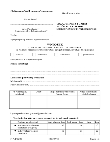 PLP............../7331-............../................... Góra Kalwaria, dnia .................................. ................................................................................................................................... Wnioskodawca* .................................................................................... .................................................................................... adres Wnioskodawcy (ewentualnie adres do korespondencji)* URZĄD MIASTA I GMINY W GÓRZE KALWARII REFERAT PLANOWANIA PRZESTRZENNEGO Telefon........................................................................ *uprzejmie prosimy o czytelne wypełnienie danych WNIOSEK O WYDANIE DECYZJI O WARUNKACH ZABUDOWY dla realizacji nie zaliczonych do inwestycji celu publicznego, inwestycji polegającej na: budowie rozbudowie nadbudowie przebudowie Proszę wstawić - 'X' w odpowiednim polu Rodzaj inwestycji: ................................................................................................................................................................ ................................................................................................................................................................ ................................................................................................................................................................ Lokalizacja planowanej inwestycji: Miejscowość .......................................................................................................................................... Nazwa i numer ulicy .............................................................................................................................. Nr ewidencyjny działki/ek Obręb Imię i nazwisko właściciela (nazwa firmy) Adres zamieszkania (siedziba firmy) Łączna powierzchnia gruntu objęta wnioskiem - ............................................... . 1. Określenie charakterystycznych parametrów technicznych inwestycji: Rodzaje powierzchni bud. mieszk. j.m. bud. gosp. j.m. inny j.m. powierzchnia zabudowy (szerokość x długość) 2 m m 2 m2 maksymalnawysokość zabudowy m m m F-PLP/02/01 2010/07/12 Strona 1/3 wysokość (liczba kondygnacji) powierzchnia całkowita m2 m2 m2 powierzchnia mieszkalna m2 m2 m2 powierzchnia usługowa m2 m2 m2 powierzchni handlowa m2 m2 m2 powierzchnia magazynowa m2 m2 m2 powierzchnia produkcyjna m2 m2 m2 powierzchnia inna m2 m2 m2 2. Określenie zapotrzebowania na media: a) zapotrzebowanie na wodę .......................... m3/dobę b) sposób odprowadzania lub oczyszczania ścieków............................................................................. ................................................................................................................................................................ c) sposób unieszkodliwiania odpadów .................................................................................................. d) zapotrzebowanie na energię………... ............................................................................................... e) zapotrzebowanie na inny rodzaj infrastruktury technicznej .............................................................. ............................................................................................................................................................... f) sposób ogrzewania ............................................................................................................................. g) sposób zaopatrzenia w wodę ............................................................................................................. h) dostęp do drogi publicznej ................................................................................................................ i) sposób odprowadzenia wód opadowych ............................................................................................ j) dane charakteryzujące wpływ na środowisko ………………………………………………………………………………………………………… ................................................................................................................................................................ ................................................................................................................................................................ ............................................................................................ (podpis Wnioskodawcy lub osoby przez niego upoważnionej) Uwaga: W zależności od rodzaju inwestycji organ administracji może wystąpić do wnioskodawcy o uzupełnienie innych dodatkowych danych niezbędnych do ustalenia warunków zabudowy. W razie stwierdzenia braków formalnych wniosku, organ I-instancji wezwie wnioskodawcę w trybie art. 64 § 2 kpa, do uzupełnienia braków. Wymagane dokumenty: 1) cztery egzemplarze (2 oryginały + 2 kopie) aktualnej kopii mapy zasadniczej lub w przypadku jej braku, kopii mapy katastralnej, obejmującej teren, którego wniosek dotyczy i obszar na który ta inwestycja będzie oddziaływać (w odległości nie mniejszej niż trzykrotna szerokość frontu działki objętej wnioskiem, nie mniejszej jednak niż 50 m od granic działki wnioskodawcy), z oznaczeniem granic terenu objętego wnioskiem, w skali 1:500 lub 1:1000; 2) graficznie przedstawiony planowany sposób zagospodarowania terenu, w tym przeznaczenie i gabaryty projektowanych obiektów budowlanych; F-PLP/02/01 2010/07/12 Strona 2/3 3) aktualny wypis z rejestru gruntów dla nieruchomości, na których projektowane jest przedsięwzięcie; 4) w przypadku, kiedy wnioskodawcą jest osoba prawna, odpis z Krajowego Rejestru Sądowego; 5) w przypadku, kiedy wnioskodawca działa przez pełnomocnika – pełnomocnictwo; 6) ewentualnie decyzję o środowiskowych uwarunkowaniach; 7) kserokopia warunkó