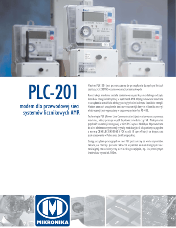 PLC-201 modem dla przewodowej sieci systemów licznikowych AMR Modem PLC-201 jest przeznaczony do przesyłania danych po liniach zasilających 230VAC w zastosowaniach przemysłowych. Konstrukcja modemu została zorientowana pod kątem zdalnego odczytu liczników energii elektrycznej w systemach AMR. Oprogramowanie osadzone w urządzeniu umożliwia obsługę rozległych sieci odczytu liczników energii. Modem stanowi urządzenie końcowe transmisji danych z licznika energii elektrycznej i jest wyposażony w separowany interfejs RS-485. Technologia PLC (Power Line Communication) jest realizowana za pomocą modemu, który pracuje w pół duplexie z modulacją FSK. Maksymalna prędkość transmisji szeregowej w sieci PLC wynosi 4800bps. Wprowadzane do sieci elektroenergetycznej sygnały modulacyjne i ich poziomy są zgodne z normą CENELEC EN50065 i FCC część 15 specyfikacji co dopuszcza je do stosowania w Polsce oraz Unii Europejskiej. Zasięg urządzeń pracujących w sieci PLC jest zależny od wielu czynników, takich jak rodzaj i poziom zakłóceń w paśmie komunikacyjnym sieci zasilającej, stan elektryczny sieci niskiego napięcia, itp. i w przeciętnym środowisku wynosi ok. 500m. Komunikacja Modemy PLC-201, z punktu widzenia systemu odczytowego SYNDIS ENERGIA, tworzą sieć odczytu liczników. W celu realizacji skutecznego zarządzania siecią oraz sprawnego przesyłu danych, został opracowany protokół PLCP. W sieci odczytu liczników, protokół PLCP wymaga skonfigurowania punktu dostępowego MAP (urządzenie PLC-MAP-x) oraz punktów końcowych (AMR) instalowanych przy licznikach. Punkt dostępowy, po odebraniu prawidłowej ramki protokołu PLCP z systemu nadrzędnego, realizuje przesył danych w sieci odczytu liczników. AMR, po odebraniu poprawnych danych z MAP realizuje odczyt licznika energii. Zwrotnie, przesył danych z AMR do systemu SYNDIS ENERGIA realizowany jest w analogiczny sposób. Na poniższym rysunku przedstawiono schemat komunikacji i przesyłu danych. APN sieć GPRS TCP/IP GSM SYNDIS ENERGIA modem GPRS RS-485 lub Ethernet linia elektroenergetyczna sieć odczytu liczników modem PLC-201 (AMR) PLC-MAP-x modem PLC-201 (AMR) liczniki energii z przystawkami PLC-201 Warunki środowiskowe , , , , , , , lokalizacja: osłonięta, kl.C wg PN-EN 60870-2-2 warunki atmosferyczne: bez agresywnych par i gazów temperatura pracy: od -20°C do 55°C wilgotność względna: od 5% do 95 % bez kondensacji wytrzymałość elektryczna: zasilanie 2.5kV/RMS 1min, transmisje 1kV/RMS 1min wytrzymałość udarowa: zasilanie 5kV, 1.2/50ms, transmisje 2kV, 1.2/50ms kompatybilność elektromagnetyczna: zgodność z PN-EN 60870-2-1 p.5 dla 4 poziomu narażeń Dane techniczne napięcie zasilania pobór prądu nadawanie/odbiór wbudowany bezpiecznik modemowa prędkość transmisji prędkość transmisji interfejsu serwisowego 110-230VAC/DC 20/17mA 1A 4800bd 115000bd DBAMY O ŚRODOWISKO! PAPIER Z RECYKLINGU, UDZIAŁ MAKULATURY 75%, CERTYFIKAT NR TT-COC-2043 modulacja separacja galwaniczna RS-485 parametry wyjścia binarnego stopień szczelności mocowanie na pokrywę licznika wymiary obudowy FSK 1kV 600V/0.6A (opcja) Ip53 śruba M4 z plombą 120x80x41 mm www.mikronika.pl