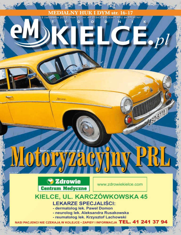 MEDIALNY HUK I DYM str. 16-17 15 listopada 2015, Rok VII, nr 44 (0343) EGZEMPL ARZ BEZPŁ ATNY Motoryzacyjny PRL Temat numeru strona 6-7 www.zdrowiekielce.com KIELCE, UL. KARCZÓWKOWSKA 45 LEKARZE SPECJALIŚCI: - dermatolog lek. Paweł Domon - neurolog lek. Aleksandra Rusakowska - reumatolog lek. Krzysztof Lachowski NASI PACJENCI NIE CZEKAJĄ W KOLEJCE • ZAPISY I INFORMACJA TEL. 41 241 37 94 KIELCE AKTUALNOŚCI Górnej prezentowane są instalacje, w małej sali fotografie autorstwa Leszka Mądzika, zaś w Galerii Dolnej filmy ze spektakli oraz kilkadziesiąt plakatów do realizacji teatralnych autora. /dok/ Murale gotowe Zupełnie zmieniło się wnętrze tunelu pod dworcem PKP. Powstały tam unikalne w skali kraju murale, które zostały wykonane na zlecenie Polskich Kolei Państwowych. Twórcami dzieł są graficiarze. – To co możemy zobaczyć w tunelu, to typowa grafika ścienna. Nie mieliśmy dużej swobody artystycznej, bo PKP przedstawiła jasny plan, co ma tutaj powstać. Na jednej ze ścian widzimy pociąg podobny do Pendolino, jednak jest to pojazd polskiej produkcji, firmy „Ne- wag”. Kiedy malowaliśmy, reakcje ludzi były bardo pozytywne - mówi Marcin, jeden z malujących. Koszt całego przedsięwzięcia to około 40 tysięcy złotych. /pin/ Kończą remont Miron w „Kubusiu” Ruszył program W Wojewódzkim Szpitalu Zespolonym w Kielcach ruszył Program Dobrowolnych Odejść, o którym pisaliśmy szerzej w minionym tygodniu. Ma on rozwiązać problem przerostu zatrudnienia, który wystąpił po połączeniu szpitali dziecięcego i zespolonego na Czarnowie. – Ten program na pewno nas nie uspokoi. Bo co będzie, jeśli nikt się nie zgłosi lub zrobi to zbyt mało osób? Czy na tym problem się skończy? – pyta w imieniu związkowców Anna Głownia, z–ca Przewodniczącej Ogólnopolskiego Związku Pielęgniarek i Położnych w Wojewódzkim Szpitalu Zespolonym w Kielcach. O dalszych szczegółach będziemy informować na naszej stronie internetowej. /ig/ milionów złotych. Pieniądze na reno- artystę warsztatami, wystawą i powację budynku pochodziły z Narodo- zakonkursowymi filmami. Przegląd /ds/ wego Funduszu Ochrony Środowiska, potrwa do 27 listopada. a także z budżetu wojewody. /pin/ NURT za pasem Remont Świętokrzyskiego Urzędu Wojewódzkiego dobiega końca. Termomodernizacja obiektu obejmowała między innymi zmianę wentylacji, wymianę instalacji grzewczej na bardziej nowoczesną, a także zamontowanie nowych okien i drzwi. Powstało również centrum konferencyjne. Usprawnienia pozwolą na oszczędności energii centralnego ogrzewania, ciepłej wody oraz energii oświetleniowej. Prace rozpoczęły się w maju ubiegłego roku, a koszt remontu wyniósł 25 We wtorek, 24 listopada, rozpoczyna się XXI Festiwal Form Dokumentalnych NURT. Wyświetlonych zostanie 37 filmów, podzielonych na dziewięć seansów. Odwołują się one do histoMądzik w BWA rii, życia artystycznego oraz spraw społecznych. Tegoroczny NURT jest Ta ekspozycja to swoiste wędrowanie po twórczości i życiu Leszka Mądzika, artysty z kieleckim rodowodem, scenografa, reżysera, malarza, fotografa, profesora warszawskiej Akademii Sztuk Pięknych oraz Katolickiego Uniwersytetu Lubelskiego Jana Pawła II. Od piątku, 13 listopada, w BWA w Kielcach wydarzeniem jubileuszów. Festiwal można oglądać wystawę jego prac już 20 raz odbywa się w Kielcach. pod tytułem „Dotyk przemijania” – W tym roku mija także 100 lat od przemijanie to temat, który dominuje narodzin Tadeusza Kantora, legendy w twórczości mistrza. Ekspozycja polskiego teatru. NURT przypomni składa się z kilku części. W Galerii Teatr Lalki i Aktora „Kubuś” zaprasza dorosłych widzów na spektakl „Dziady po Białoszewskim” w reżyserii debiutującej Anny Retoruk. To opowieść o eksperymentującym ze słowem poecie. Akcja rozgrywa się po śmierci Mirona Białoszewskiego w jego warszawskim mieszkaniu przy ul. Lizbońskiej. Twórca powraca do świata żywych we wspomnieniach przyjaciół oraz za pośrednictwem rzeczy, których niegdyś używał. Scenariusz inscenizacji powstał w oparciu o poezję i dziennik Białoszewskiego. 21 i 24 listopada w „Kubusiu” wyświetlony zostanie również film dokumentalny o poecie. /ds/ „Dziady” są cool Powszechnie wiadomo, że dzieci dzisiaj nie lubią czytać. Ale to nie do końca prawda, bo młodzi aktorzy z Teatru Grodzkiego „Pod Basztami” w Chęcinach zakochali się w „Dziadach” Adama Mickiewicza i zaproponowali ich inscenizację. Jak mówią, zafascynował ich ten prastary obrzęd zaduszny, polegający na obcowaniu z duszami umarłych. Reżyserem spektaklu jest Dorota Anyż, a twórcą nowatorskiej scenografii Artur Anyż – założyciele teatru. Na scenie zobaczymy dzieci i młodzież w wieku od 7 do 19 lat. Premiera 15 listopada o godz.17 w hali „Pod Basztami” w Chęcinach. Wstęp wolny. /dok/ KONIEC Z BÓLEM KRĘGOSŁUPA !!! POLECAMY MATERAC GORCZYCOWY ! WYROBY ZDROWOTNE Z GORCZYCY i ŁUSKI GRYKI PODUSZKI, MATERACE, WAŁKI, OPASKI i inne PRODUCENT S u c h e d n i ó w, t e l . 4 1 2 5 4 4 2 2 0 , 6 0 7 5 9 6 9 2 0 w w w. b a r o s . p l 2 15 LISTOPADA 2015 KIELCE AKTUALNOŚCI Targi z pieskami „Caribbean Show” także w kategorii solowej. Na 7. pozycji uplasowała się Magdalena Mierzwa, a na 14. Daria Sroka. /ds/ Wystawy, która odbędzie się od 21 do 22 listopada, nie mogą przegapić miłośnicy psiej urody, bowiem w tych dniach po raz kolejny w Targach Kielce zaprezentują się psie piękności. Będą m.in. malutkie pieski rasy chihuahua, ogromne dogi, wypielęgnowane pudelki, bullmastiffy o groźnych spojrzeniach oraz kochające wszystkich labradory. Tradycyjnie do Kielc zawitają przedstawiciele rzadkich ras – wystawa to świetna okazja, aby Prestiżowe nominacje dowiedzieć się o nich więcej. /red/ Trzej szczypiorniści Vive Tauronu Kielce zostali nominowani w plebiscycie na najlepszych zawodników 2015 roku na poszcze