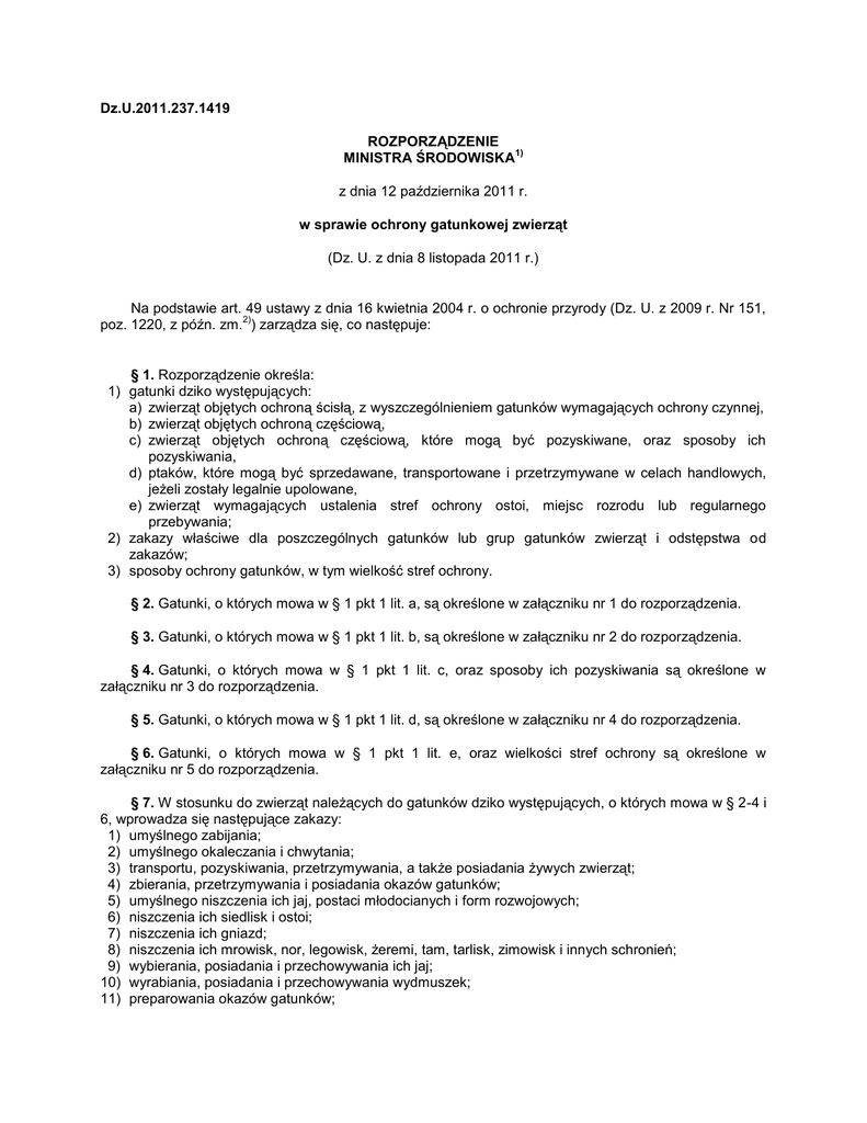 Dz.U.2011.237.1419 ROZPORZĄDZENIE 1) MINISTRA ŚRODOWISKA z dnia 12 października 2011 r. w sprawie ochrony gatunkowej zwierząt (Dz. U. z dnia 8 listopada 2011 r.) Na podstawie art. 49 ustawy z dnia 16 kwietnia 2004 r. o ochronie przyrody (Dz. U. z 2009 r. Nr 151, 2) poz. 1220, z późn. zm. ) zarządza się, co następuje: § 1. Rozporządzenie określa: 1) gatunki dziko występujących: a) zwierząt objętych ochroną ścisłą, z wyszczególnieniem gatunków wymagających ochrony czynnej, b) zwierząt objętych ochroną częściową, c) zwierząt objętych ochroną częściową, które mogą być pozyskiwane, oraz sposoby ich pozyskiwania, d) ptaków, które mogą być sprzedawane, transportowane i przetrzymywane w celach handlowych, jeżeli zostały legalnie upolowane, e) zwierząt wymagających ustalenia stref ochrony ostoi, miejsc rozrodu lub regularnego przebywania; 2) zakazy właściwe dla poszczególnych gatunków lub grup gatunków zwierząt i odstępstwa od zakazów; 3) sposoby ochrony gatunków, w tym wielkość stref ochrony. § 2. Gatunki, o których mowa w § 1 pkt 1 lit. a, są określone w załączniku nr 1 do rozporządzenia. § 3. Gatunki, o których mowa w § 1 pkt 1 lit. b, są określone w załączniku nr 2 do rozporządzenia. § 4. Gatunki, o których mowa w § 1 pkt 1 lit. c, oraz sposoby ich pozyskiwania są określone w załączniku nr 3 do rozporządzenia. § 5. Gatunki, o których mowa w § 1 pkt 1 lit. d, są określone w załączniku nr 4 do rozporządzenia. § 6. Gatunki, o których mowa w § 1 pkt 1 lit. e, oraz wielkości stref ochrony są określone w załączniku nr 5 do rozporządzenia. § 7. W stosunku do zwierząt należących do gatunków dziko występujących, o których mowa w § 2-4 i 6, wprowadza się następujące zakazy: 1) umyślnego zabijania; 2) umyślnego okaleczania i chwytania; 3) transportu, pozyskiwania, przetrzymywania, a także posiadania żywych zwierząt; 4) zbierania, przetrzymywania i posiadania okazów gatunków; 5) umyślnego niszczenia ich jaj, postaci młodocianych i form rozwojowych; 6) niszczenia ich siedlisk i ostoi; 7) niszczenia ich gniazd; 8) niszczenia ich mrowisk, nor, legowisk, żeremi, tam, tarlisk, zimowisk i innych schronień; 9) wybierania, posiadania i przechowywania ich jaj; 10) wyrabiania, posiadania i przechowywania wydmuszek; 11) preparowania okazów gatunków; zbywania, oferowania do sprzedaży, wymiany i darowizny okazów gatunków; wwożenia z zagranicy i wywożenia poza granicę państwa okazów gatunków; umyślnego płoszenia i niepokojenia; fotografowania, filmowania i obserwacji, mogących powodować płoszenie lub niepokojenie zwierząt, przy których nazwach w załączniku nr 1 do rozporządzenia zamieszczono znak (1); 16) przemieszczania z miejsc regularnego przebywania na inne miejsca; 17) przemieszczania urodzonych i hodowanych w niewoli do stanowisk naturalnych. 12) 13) 14) 15) § 8. Zakazy, o których mowa w § 7 pkt 1-4, 7, 9, 14 i 16, w stosunku do gatunków dziko występujących zwierząt objętych ochroną gatunkową, w przypadku braku rozwiązań alternatywnych i jeżeli nie jest to szkodliwe dla zachowania we właściwym stanie ochrony populacji tych gatunków i ich siedlisk, nie dotyczą: 1) usuwania od dnia 16 października do końca lutego gniazd z budek dla ptaków i ssaków; 2) usuwania od dnia 16 października do końca lutego gniazd ptasich z obiektów budowlanych i terenów zieleni, jeżeli wymagają tego względy bezpieczeństwa lub sanitarne; 3) chwytania na terenach zabudowanych przez podmioty upoważnione przez regionalnego dyrektora ochrony środowiska zabłąkanych zwierząt i przemieszczania ich do miejsc regularnego przebywania; 4) chwytania zwierząt rannych i osłabionych w celu udzielenia im pomocy weterynaryjnej lub przemieszczania do ośrodków rehabilitacji zwierząt; 5) zbierania i przechowywania piór ptaków. § 9. Zakazy, o których mowa w § 7 pkt 1-5, 7-9, 11-14 i 16, nie dotyczą: 1) pozyskiwania okazów gatunków, o których mowa w § 4, przez podmioty, które uzyskały zezwolenie Generalnego Dyrektora Ochrony Środowiska lub regionalnego dyrektora ochrony środowiska na ich pozyskiwanie; 2) przetrzymywania, zbywania, nabywania, oferowania do sprzedaży, wymiany, darowizny, a także wywożenia poza granicę państwa okazów zwierząt, o których mowa w pkt 1. § 10. Określa się następujące sposoby ochrony gatunków polegające na: 1) ustalaniu stref ochrony ostoi, miejsc rozrodu lub regularnego przebywania dla gatunków, o których mowa w § 1 pkt 1 lit. e; 2) zabezpieczaniu ostoi i stanowisk zwierząt przed zagrożeniami zewnętrznymi; 3) wykonywaniu zabiegów ochronnych utrzymujących właściwy stan populacji lub siedliska zwierząt w zakresie: a) renaturyzacji i odtwarzania siedlisk, b) utrzymywania lub odtwarzania właściwych dla gatunku stosunków wodnych, c) utrzymywania lub odtwarzania właściwego dla gatunku stanu gleby lub wody, d) zapobiegania sukcesji roślinnej przez wypas, koszenie, wycinanie drzew i krzewów, e) odtwarzania oraz zakładania nowych zadrzewień śródpolnych, f) budowy sztucznych miejsc lęgowych, wodopojów, g) dostosowania sposobów i terminów wykonywania prac agrotechnicznych, leśnych, budowlanych, remontowych i innych tak, aby zminimalizować ich wpływ na biologię zwierząt i ich siedliska, h) tworzenia i utrzymywania korytarzy ekologicznych, i) zapewniania drożności cieków będących szlakami migracji, w tym budowy przepławek i kanałów, rozbiórki przeszkód oraz stałej konserwacji istniejących przepławek, j) instalowania przejść dla zwierząt pod i nad drogami publicznymi oraz liniami kolejowymi, k) regulacji liczebności roślin, grzybów i zwierząt mających wpływ na chronione gatunki; 4) inwentaryzowaniu, dokumentowaniu i monitorowaniu stanowisk, siedlisk i populacji gatunków; 5) wspomaganiu rozmnażania się gatunku na stanowiskach naturalnych; 6) zabezpieczaniu reprezentatywnej części popul