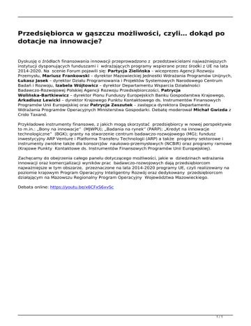Przedsiębiorca w gąszczu możliwości, czyli… dokąd po dotacje na innowacje? Dyskusję o źródłach finansowania innowacji przeprowadzono z przedstawicielami najważniejszych instytucji dysponujących funduszami i wdrażających programy wspierane przez środki z UE na lata 2014-2020. Na scenie Forum pojawili się: Partycja Zielińska – wiceprezes Agencji Rozwoju Przemysłu, Mariusz Frankowski – dyrektor Mazowieckiej Jednostki Wdrażania Programów Unijnych, Łukasz Jasek – dyrektor Działu Programowania i Projektów Systemowych Narodowego Centrum Badań i Rozwoju, Izabela Wójtowicz – dyrektor Departamentu Wsparcia Działalności Badawczo-Rozwojowej Polskiej Agencji Rozwoju Przedsiębiorczości, Patrycja Wolińska-Bartkiewicz – dyrektor Pionu Funduszy Europejskich Banku Gospodarstwa Krajowego, Arkadiusz Lewicki – dyrektor Krajowego Punktu Kontaktowego ds. Instrumentów Finansowych Programów Unii Europejskiej oraz Patrycja Zeszutek – zastępca dyrektora Departamentu Wdrażania Programów Operacyjnych Ministerstwa Gospodarki. Debatę moderował Michał Gwizda z Crido Taxand. Przykładowe instrumenty finansowe, z jakich mogą skorzystać przedsiębiorcy w nowej perspektywie to m.in.: „Bony na innowacje” (MJWPU); „Badania na rynek” (PARP); „Kredyt na innowacje technologiczne” (BGK); granty na stworzenie centrum badawczo-rozwojowego (MG); fundusz inwestycyjny ARP Venture i Platforma Transferu Technologii (ARP) a także programy sektorowe i instrumenty zwrotne także dla konsorcjów naukowo-przemysłowych (NCBiR) oraz programy ramowe (Krajowe Punkty Kontaktowe ds. Instrumentów Finansowych Programów Unii Europejskiej). Zachęcamy do obejrzenia całego panelu dotyczącego możliwości, jakie w dziedzinach wdrażania innowacji oraz komercjalizacji wyników prac badawczo-rozwojowych dają przedsiębiorcom najważniejsze w tym obszarze, przeznaczone na lata 2014-2020 programy UE, czyli realizowany na poziomie krajowym Program Operacyjny Inteligentny Rozwój oraz dedykowany przedsiębiorcom działającym na Mazowszu Regionalny Program Operacyjny Województwa Mazowieckiego. Debata online: https://youtu.be/x6CFxS6xvSc 1/1