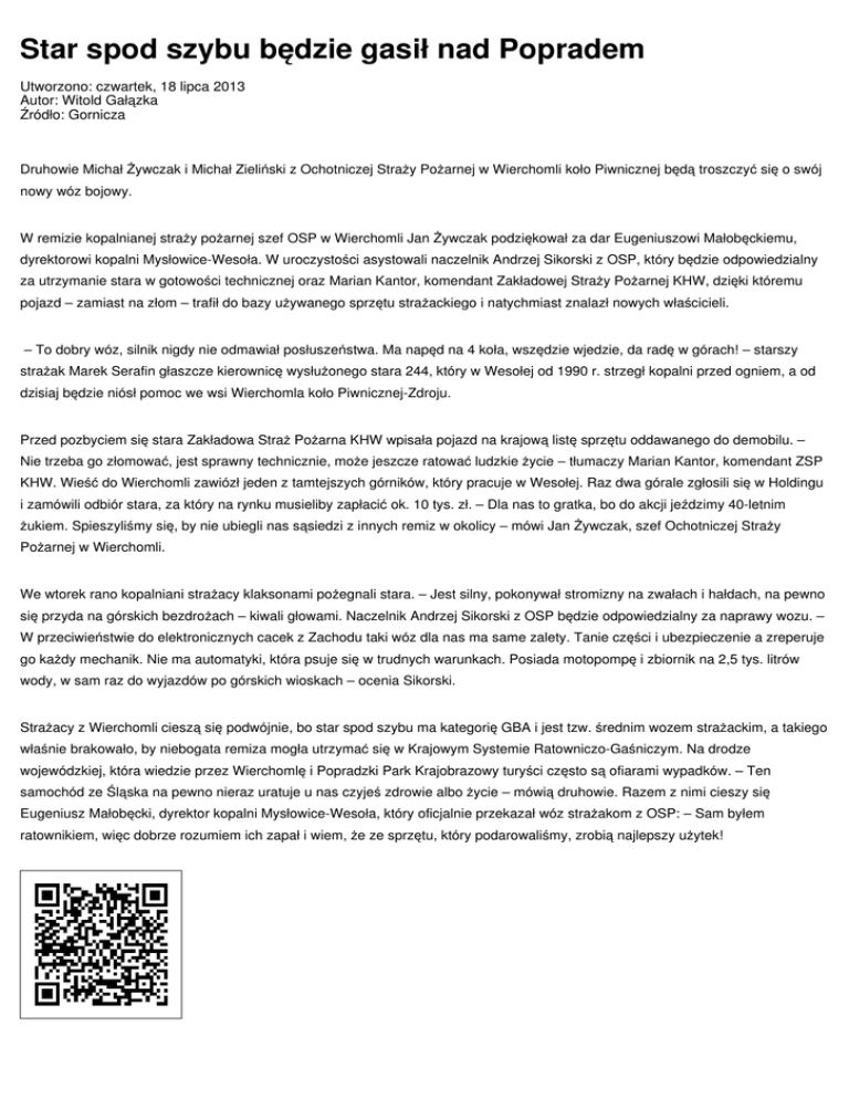Star spod szybu będzie gasił nad Popradem Utworzono: czwartek, 18 lipca 2013 Autor: Witold Gałązka Źródło: Gornicza Druhowie Michał Żywczak i Michał Zieliński z Ochotniczej Straży Pożarnej w Wierchomli koło Piwnicznej będą troszczyć się o swój nowy wóz bojowy. W remizie kopalnianej straży pożarnej szef OSP w Wierchomli Jan Żywczak podziękował za dar Eugeniuszowi Małobęckiemu, dyrektorowi kopalni Mysłowice-Wesoła. W uroczystości asystowali naczelnik Andrzej Sikorski z OSP, który będzie odpowiedzialny za utrzymanie stara w gotowości technicznej oraz Marian Kantor, komendant Zakładowej Straży Pożarnej KHW, dzięki któremu pojazd – zamiast na złom – trafił do bazy używanego sprzętu strażackiego i natychmiast znalazł nowych właścicieli. – To dobry wóz, silnik nigdy nie odmawiał posłuszeństwa. Ma napęd na 4 koła, wszędzie wjedzie, da radę w górach! – starszy strażak Marek Serafin głaszcze kierownicę wysłużonego stara 244, który w Wesołej od 1990 r. strzegł kopalni przed ogniem, a od dzisiaj będzie niósł pomoc we wsi Wierchomla koło Piwnicznej-Zdroju. Przed pozbyciem się stara Zakładowa Straż Pożarna KHW wpisała pojazd na krajową listę sprzętu oddawanego do demobilu. – Nie trzeba go złomować, jest sprawny technicznie, może jeszcze ratować ludzkie życie – tłumaczy Marian Kantor, komendant ZSP KHW. Wieść do Wierchomli zawiózł jeden z tamtejszych górników, który pracuje w Wesołej. Raz dwa górale zgłosili się w Holdingu i zamówili odbiór stara, za który na rynku musieliby zapłacić ok. 10 tys. zł. – Dla nas to gratka, bo do akcji jeździmy 40-letnim żukiem. Spieszyliśmy się, by nie ubiegli nas sąsiedzi z innych remiz w okolicy – mówi Jan Żywczak, szef Ochotniczej Straży Pożarnej w Wierchomli. We wtorek rano kopalniani strażacy klaksonami pożegnali stara. – Jest silny, pokonywał stromizny na zwałach i hałdach, na pewno się przyda na górskich bezdrożach – kiwali głowami. Naczelnik Andrzej Sikorski z OSP będzie odpowiedzialny za naprawy wozu. – W przeciwieństwie do elektronicznych cacek z Zachodu taki wóz dla nas ma same zalety. Tanie części i ubezpieczenie a zreperuje go każdy mechanik. Nie ma automatyki, która psuje się w trudnych warunkach. Posiada motopompę i zbiornik na 2,5 tys. litrów wody, w sam raz do wyjazdów po górskich wioskach – ocenia Sikorski. Strażacy z Wierchomli cieszą się podwójnie, bo star spod szybu ma kategorię GBA i jest tzw. średnim wozem strażackim, a takiego właśnie brakowało, by niebogata remiza mogła utrzymać się w Krajowym Systemie Ratowniczo-Gaśniczym. Na drodze wojewódzkiej, która wiedzie przez Wierchomlę i Popradzki Park Krajobrazowy turyści często są ofiarami wypadków. – Ten samochód ze Śląska na pewno nieraz uratuje u nas czyjeś zdrowie albo życie – mówią druhowie. Razem z nimi cieszy się Eugeniusz Małobęcki, dyrektor kopalni Mysłowice-Wesoła, który oficjalnie przekazał wóz strażakom z OSP: – Sam byłem ratownikiem, więc dobrze rozumiem ich zapał i wiem, że ze sprzętu, który podarowaliśmy, zrobią najlepszy użytek!