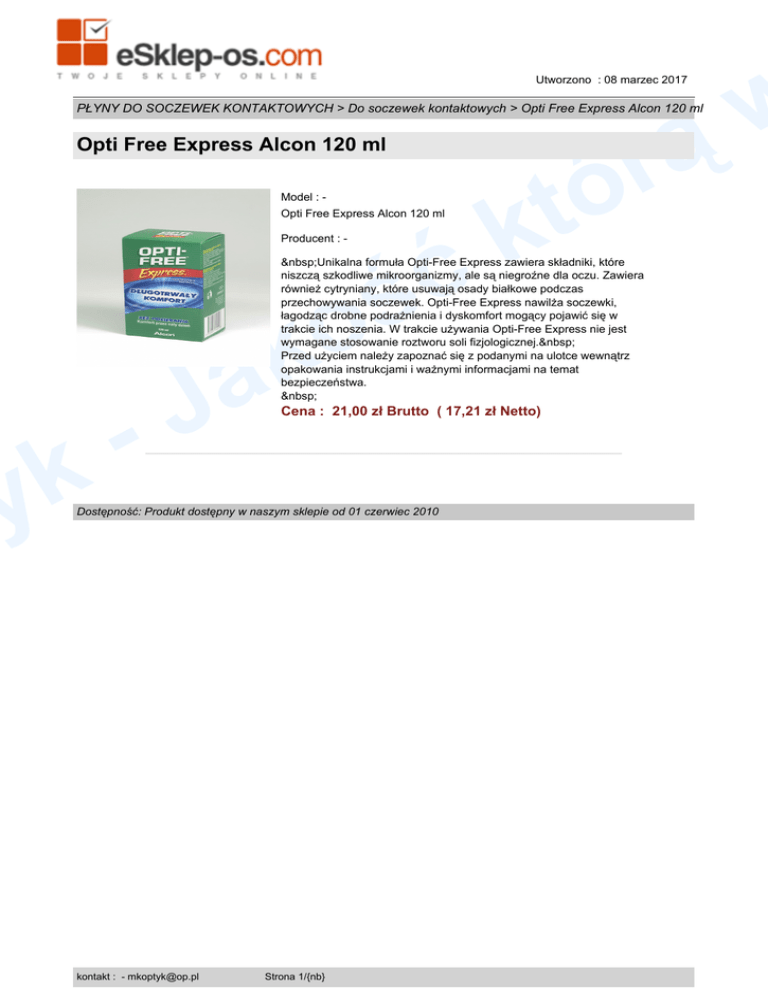 w ą Utworzono : 08 marzec 2017 PŁYNY DO SOCZEWEK KONTAKTOWYCH > Do soczewek kontaktowych > Opti Free Express Alcon 120 ml r ó t Opti Free Express Alcon 120 ml k ć Model : - Opti Free Express Alcon 120 ml Producent : - k y ś o Unikalna formuła Opti-Free Express zawiera składniki, które niszczą szkodliwe mikroorganizmy, ale są niegroźne dla oczu. Zawiera również cytryniany, które usuwają osady białkowe podczas przechowywania soczewek. Opti-Free Express nawilża soczewki, łagodząc drobne podrażnienia i dyskomfort mogący pojawić się w trakcie ich noszenia. W trakcie używania Opti-Free Express nie jest wymagane stosowanie roztworu soli fizjologicznej. Przed użyciem należy zapoznać się z podanymi na ulotce wewnątrz opakowania instrukcjami i ważnymi informacjami na temat bezpieczeństwa. J - k a Cena : 21,00 zł Brutto ( 17,21 zł Netto) Dostępność: Produkt dostępny w naszym sklepie od 01 czerwiec 2010 kontakt : - [email protected] Strona 1/{nb}
