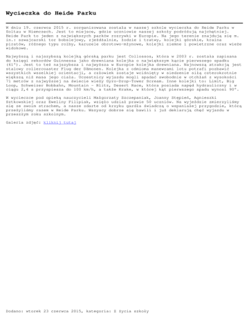 Wycieczka do Heide Parku W dniu 19. czerwca 2015 r. zorganizowana została w naszej szkole wycieczka do Heide Parku w Soltau w Niemczech. Jest to miejsce, gdzie uczniowie naszej szkoły podróżują najchętniej. Heide Park to jeden z największych parków rozrywki w Europie. Na jego terenie znajdują się m. in.: szwajcarski tor bobslejowy, zjeżdżalnie, łodzie i tratwy, kolejki górskie, kraina piratów, różnego typu rolby, karuzele obrotowo-młynowe, kolejki ziemne i powietrzne oraz wieże widokowe. Najwyższą i najszybszą kolejką górską parku jest Collossos, która w 2003 r. została zapisana do księgi rekordów Guinnessa jako drewniana kolejka o największym kącie pierwszego spadku (61°). Jest to też najszybsza i najwyższa w Europie kolejka drewniana. Najnowszą atrakcją jest stalowy rollercoaster Flug der Dämonen. Kolejka z ośmioma manewrami lotu potrafi pozbawić wszystkich wszelkiej orientacji, a człowiek zostaje wciśnięty w siedzenie siłą czterokrotnie większą niż masa jego ciała. Uczestnicy wyjazdu mogli spadać swobodnie w otchłań z wysokości 71 metrów z najwyższej na świecie wieży Gyro-Drop-Tower Scream. Inne kolejki to: Limit, Big Loop, Schweizer Bobbahn, Mountain - Blitz, Desert Race, która posiada napęd hydrauliczny i w ciągu 2,4 s przyspiesza do 100 km/h, a także Krake, w której kąt pierwszego spadu wynosi 90°. W wycieczce pod opieką nauczycieli Małgorzaty Szczepaniak, Joanny Stępień, Agnieszki Sztkowskiej oraz Eweliny Filipiak, wzięło udział prawie 50 uczniów. Na wyjeździe zmierzyliśmy się ze swoim strachem, a nasze zdarte od krzyku gardła świadczą o wspaniałej przygodzie, którą przeżyliśmy razem w Heide Parku. Wszyscy dobrze się bawili i już deklarują chęć wyjazdu w przeszłym roku szkolnym. Galeria zdjęć: kliknij tutaj Dodano: wtorek 23 czerwca 2015, kategoria: Z życia szkoły