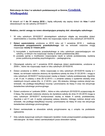 Rekrutacja do klas I w szkołach podstawowych w Gminie Grodzisk Wielkopolski. W dniach od 1 do 31 marca 2016 r. będą odbywały się zapisy dzieci do klas I szkół obwodowych na rok szkolny 2016/2017. Rodzicu, zwróć uwagę na nowo obowiązujące przepisy dot. obowiązku szkolnego: 1 W roku szkolnym 2016/2017 obowiązkiem szkolnym objęte są wszystkie dzieci siedmioletnie z rocznika 2009, które nie rozpoczęły nauki w roku szkolnym 2015/2016. 2 Dzieci sześcioletnie urodzone w 2010 roku od 1 września 2016 r. realizują obowiązek przygotowania przedszkolnego lub na wniosek rodziców mogą rozpocząć naukę w I klasie jeśli: 1) korzystało z wychowania przedszkolnego w roku szkolnym poprzedzającym rok szkolny, w którym ma rozpocząć naukę w szkole podstawowej albo 2) posiada opinię o możliwości rozpoczęcia nauki w szkole podstawowej, wydaną przez publiczną poradnię psychologiczno – pedagogiczną. 3 Obowiązek szkolny od 1 września 2016 obejmuje dzieci siedmioletnie, urodzone w 2009 r., które nie rozpoczęły nauki w roku szkolnym 2015/2016. 4 Dzieci urodzone w 2009 r., które rozpoczęły w roku szkolnym 2015/2016 naukę w I klasie, na wniosek rodziców złożony do dyrektora szkoły do dnia 31.03.2016 r. mogą w roku szkolnym 2016/2017 kontynuować naukę w klasie I szkoły podstawowej. Zgodnie z art. 9 ust. 4 ustawy z dnia 29.12.2015 r. o zmianie ustawy o systemie oświaty oraz niektórych innych ustaw (Dz. U. Z 2016 r. poz. 35) dziecko, którego rodzice złożyli ww. wniosek, nie podlega klasyfikacji rocznej i promowaniu do klasy II oraz nie otrzymuje świadectwa szkolnego promocyjnego. 5 Dzieci urodzone w I połowie 2008 r., które w roku szkolnym 2015/2016 uczęszczają do II klasy. Na wniosek rodziców złożony do dyrektora szkoły do dnia 31.03.2016 mogą w roku szkolnym 2016/2017 kontynuować naukę w klasie II szkoły podstawowej. Zgodnie z art.11 ust. 4 wyżej cytowanej ustawy dziecko, którego rodzice złożyli w/w wniosek, nie podlega klasyfikacji rocznej i promowaniu do klasy III oraz nie otrzymuje świadectwa szkolnego promocyjnego. 6 Dzieci zamieszkałe w obwodzie szkoły przyjmowane są z urzędu na podstawie zgłoszenia. 7 Gdy szkoła dysponuje wolnymi miejscami dyrektor może przeprowadzić postępowanie rekrutacyjne do klas I dzieci zamieszkałych poza obwodem szkoły. Harmonogram czynności w postępowaniu rekrutacyjnym oraz postępowaniu uzupełniającym do klas I szkół podstawowych prowadzonych przez Gminę Grodzisk Wielkopolski na rok szkolny 2016/2017. Czynności Termin w postępowaniu rekrutacyjnym Termin w postępowaniu uzupełniającym 1 Złożenie wniosków o przyjęcie do szkoły podstawowej wraz z dokumentami potwierdzającymi spełnianie przez kandydata warunków lub kryteriów branych pod uwagę w postępowaniu rekrutacyjnym. 01 – 31.03.2016 r. 25 – 26.04.2016 r. 2 Weryfikacja przez komisję rekrutacyjną wniosków o przyjęcie do szkoły podstawowej dokumentów potwierdzających spełnianie przez kandydata warunków lub kryteriów branych pod uwagę w postępowaniu rekrutacyjnym w tym dokonanie przez przewodniczącego komisji rekrutacyjnej czynności, o których mowa w art. 20t ust. 7 ustawy. 01 – 06.04.2016 r. 26 – 28.04.2016 r. 3 Podanie do publicznej wiadomości przez komisję rekrutacyjną listy kandydatów zakwalifikowanych i kandydatów niezakwalifikowanych. 07 – 15.04.2016 r. 29.04.2016 r. 4 Potwierdzenie przez rodzica kandydata woli przyjęcia w postaci pisemnego oświadczenia. 18 – 20.04.2016 r. 29.04 – 04.05.2016 r. 5 Podanie do publicznej wiadomości przez komisję rekrutacyjną listy kandydatów przyjętych i kandydatów nieprzyjętych. 25.04.2016 r. 05.05.2016 r. Lp. W postępowaniu rekrutacyjnym brane są pod uwagę następujące kryteria: Lp. Kryterium Gminę Liczba punktów Dokument potwierdzający spełnienie kryterium 1 Kandydat zamieszkuje Wielkopolski Grodzisk 10 pkt oświadczenie 2 Kandydat uczęszczał do oddziału przedszkolnego w tej szkole ( jeżeli w szkole tej prowadzone były oddziały przedszkolne) 10 pkt oświadczenie 3 W tej samej szkole obowiązek szkolny spełniany jest przez rodzeństwo kandydata 10 pkt oświadczenie 4 Miejsce pracy rodziców znajduje się w obwodzie wnioskowanej szkoły 5 pkt oświadczenie 5 Droga kandydata do wnioskowanej szkoły jest krótsza niż do szkoły obwodowej 5 pkt oświadczenie 6 W obwodzie wnioskowanej szkoły zamieszkują krewni kandydata wspierający rodziców w zapewnieniu mu należytej opieki 5 pkt oświadczenie Wzór wniosku o przyjęcie do klasy pierwszej szkoły podstawowej dostępny jest w danej szkole. Szczegółowe informacje na temat postępowania rekrutacyjnego uzyskają Państwo w każdej szkole podstawowej.