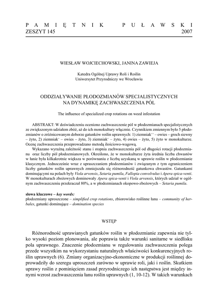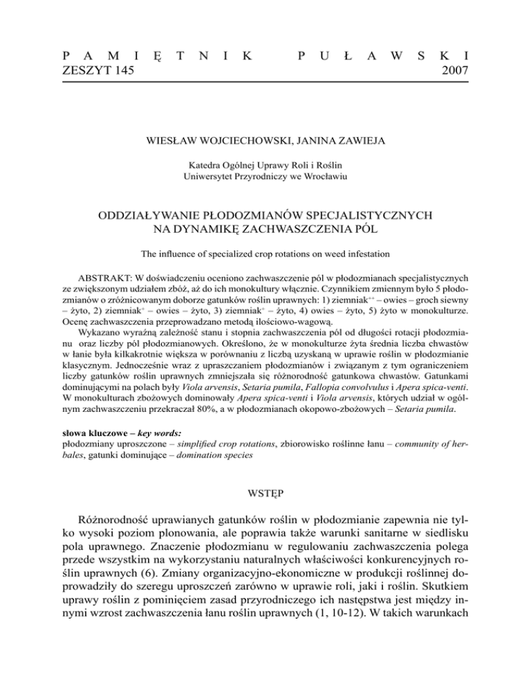 P A M I ZESZYT 145 Ę T N I K P U Ł A W S K I 2007 WIESŁAW WOJCIECHOWSKI, JANINA ZAWIEJA Katedra Ogólnej Uprawy Roli i Roślin Uniwersytet Przyrodniczy we Wrocławiu ODDZIAŁYWANIE PŁODOZMIANÓW SPECJALISTYCZNYCH NA DYNAMIKĘ ZACHWASZCZENIA PÓL The influence of specialized crop rotations on weed infestation ABSTRAKT: W doświadczeniu oceniono zachwaszczenie pól w płodozmianach specjalistycznych ze zwiększonym udziałem zbóż, aż do ich monokultury włącznie. Czynnikiem zmiennym było 5 płodozmianów o zróżnicowanym doborze gatunków roślin uprawnych: 1) ziemniak++ – owies – groch siewny – żyto, 2) ziemniak+ – owies – żyto, 3) ziemniak+ – żyto, 4) owies – żyto, 5) żyto w monokulturze. Ocenę zachwaszczenia przeprowadzano metodą ilościowo-wagową. Wykazano wyraźną zależność stanu i stopnia zachwaszczenia pól od długości rotacji płodozmianu oraz liczby pól płodozmianowych. Określono, że w monokulturze żyta średnia liczba chwastów w łanie była kilkakrotnie większa w porównaniu z liczbą uzyskaną w uprawie roślin w płodozmianie klasycznym. Jednocześnie wraz z upraszczaniem płodozmianów i związanym z tym ograniczeniem liczby gatunków roślin uprawnych zmniejszała się różnorodność gatunkowa chwastów. Gatunkami dominującymi na polach były Viola arvensis, Setaria pumila, Fallopia convolvulus i Apera spica-venti. w monokulturach zbożowych dominowały Apera spica-venti i Viola arvensis, których udział w ogólnym zachwaszczeniu przekraczał 80%, a w płodozmianach okopowo-zbożowych – Setaria pumila. słowa kluczowe – key words: płodozmiany uproszczone – simplified crop rotations, zbiorowisko roślinne łanu – community of herbales, gatunki dominujące – domination species WSTĘP Różnorodność uprawianych gatunków roślin w płodozmianie zapewnia nie tylko wysoki poziom plonowania, ale poprawia także warunki sanitarne w siedlisku pola uprawnego. Znaczenie płodozmianu w regulowaniu zachwaszczenia polega przede wszystkim na wykorzystaniu naturalnych właściwości konkurencyjnych roślin uprawnych (6). Zmiany organizacyjno-ekonomiczne w produkcji roślinnej doprowadziły do szeregu uproszczeń zarówno w uprawie roli, jaki i roślin. Skutkiem uprawy roślin z pominięciem zasad przyrodniczego ich następstwa jest między innymi wzrost zachwaszczenia łanu roślin uprawnych (1, 10-12). W takich warunkach 256 Katedra Ogólnej Uprawy Roli i Roślin – Uniwersytet Przyrodniczy we Wrocławiu [2] uprawy istnieje również możliwość kompensacji niektórych gatunków chwastów charakterystycznych dla poszczególnych upraw (7, 13). Celem przeprowadzonego eksperymentu była ocena zachwaszczenia pól w płodozmianach specjalistycznych ze zwiększonym udziałem zbóż, aż do ich monokultury włącznie. MATERIAŁ I METODY Ścisłe jednoczynnikowe doświadczenie polowe założono metodą losowanych bloków, w czterech powtórzeniach w Rolniczym Zakładzie Doświadczalnym Swojec należącym do Uniwersytetu Przyrodniczego we Wrocławiu. Eksperyment zrealizowano w latach 2002–2005, obejmując pełną piątą rotację zmianowania czteropolowego. Doświadczenie zlokalizowano na madzie właściwej lekkiej zaliczanej do kompleksu żytniego słabego, VI klasy bonitacyjnej. Czynnikiem zmiennym było 5 płodozmianów specjalistycznych o zróżnicowanym doborze gatunków roślin uprawnych: 1) ziemniak+ – owies – groch siewny – żyto, 2) ziemniak+ – owies – żyto, 3) ziemniak+ – żyto, 4) owies – żyto, 5) żyto w monokulturze. Ocenę zachwaszczenia przeprowadzano metodą ilościowo-wagową przed zbiorem każdej rośliny uprawnej. w pracy przedstawiono średnie wyniki dla całego zmianowania. Określono skład gatunkowy, liczbę i powietrznie suchą masę chwastów na 1 m2. Rezultaty opracowano statystycznie metodą analizy wariancji. Nomenklaturę przyjęto za Mirkiem i in. (4). WYNIKI BADAŃ I DYSKUSJA W łanach, niezależnie od sposobu zagospodarowania pół, oznaczono łącznie 25 gatunków chwastów (tab. 1). Większą różnorodnością gatunkową charakteryzowały się płodozmiany okopowo-zbożowe niż zbożowe. W zmianowaniu z 33,3% udziałem ziemniaka wyodrębniono 14 gatunków, w czteropolówce klasycznej 16, a w zmianowaniu z 50% udziałem tej rośliny stwierdzono 19 gatunków chwastów. W płodozmianach zbożowych zanotowano natomiast średnio tylko 10 gatunków chwastów. W zmianowaniach z dużym udziałem zbóż w strukturze zasiewów (od 66,7 do 100%) dominowały chwasty jednoliścienne, a w płodozmianach okopowozbożowych zarówno jedno-, jak i dwuliścienne (rys. 1). Chwastami dominującymi w płodozmianach zbożowych były dwa gatunki Viola arvensis oraz Apera spicaventi, a szczególnym nasileniem w tych płodozmianach charakteryzowała się miotła zbożowa przekraczając 50% w ogólnym zachwaszczeniu. Ze wzrostem liczebności tego gatunku chwastu w wyniku zwiększonego udziału zbóż w strukturze zasiewów spotkali się również Jędruszczak i Antoszek (2, 3), Pawłowski i Deryło (5), oraz Zawiślak (14). W płodozmianach okopowo-zbożowych stwierdzono natomiast wyższy udział chwastów dwuliściennych, a gatunkami dominującymi były [3] Oddziaływanie płodozmianów specjalistycznych... – W. Wojciechowski, J. Zawieja 257 Tabela 1 Procentowy udział gatunków chwastów w ogólnym zachwaszczeniu łanu Percentage of particular weeds in total number of weed infestation Gatunek chwastu Species of weed Gatunki jednoroczne; annual species: – jednoliścienne; monocotyledones : Apera spica-venti Digitaria sanguinalis Echinochloa crus-galli Setaria pumila Setaria viridis – dwuliścienne; dicotyledones: Amaranthus retroflexus Capsella bursa-pastoris Centaurea cyanus Chenopodium album Erodium cicutarium Fallopia convolvulus Galinsoga parviflora Geranium pusillum Lamium purpureum Matricaria inodora Myosotis arvensis Papaver rhoeas Polygonum aviculare Stellaria media Thlaspi arvense Veronica hed