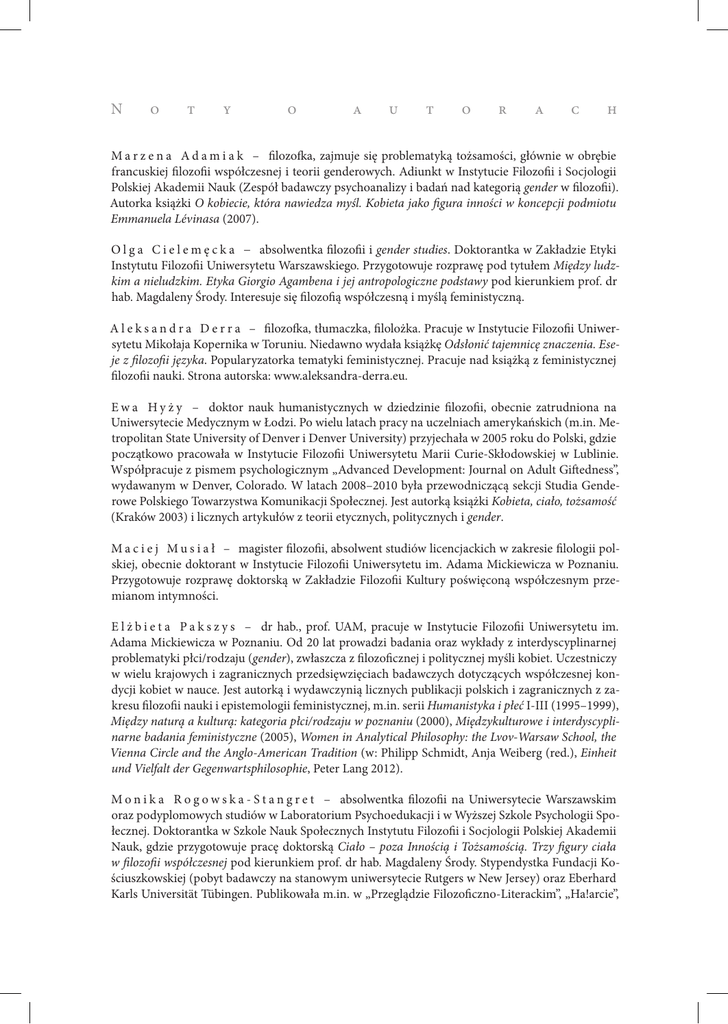 N o t y o a u t o r a c h M a r z e n a A d a m i a k – filozofka, zajmuje się problematyką tożsamości, głównie w obrębie francuskiej filozofii współczesnej i teorii genderowych. Adiunkt w Instytucie Filozofii i Socjologii Polskiej Akademii Nauk (Zespół badawczy psychoanalizy i badań nad kategorią gender w filozofii). Autorka książki O kobiecie, która nawiedza myśl. Kobieta jako figura inności w koncepcji podmiotu Emmanuela Lévinasa (2007). O l g a C i e l e m ę c k a − absolwentka filozofii i gender studies. Doktorantka w Zakładzie Etyki Instytutu Filozofii Uniwersytetu Warszawskiego. Przygotowuje rozprawę pod tytułem Między ludz‑ kim a nieludzkim. Etyka Giorgio Agambena i jej antropologiczne podstawy pod kierunkiem prof. dr hab. Magdaleny Środy. Interesuje się filozofią współczesną i myślą feministyczną. A l e k s a n d r a D e r r a – filozofka, tłumaczka, filolożka. Pracuje w Instytucie Filozofii Uniwersytetu Mikołaja Kopernika w Toruniu. Niedawno wydała książkę Odsłonić tajemnicę znaczenia. Ese‑ je z filozofii języka. Popularyzatorka tematyki feministycznej. Pracuje nad książką z feministycznej filozofii nauki. Strona autorska: www.aleksandra‑derra.eu. E w a H y ż y – doktor nauk humanistycznych w dziedzinie filozofii, obecnie zatrudniona na Uniwersytecie Medycznym w Łodzi. Po wielu latach pracy na uczelniach amerykańskich (m.in. Metropolitan State University of Denver i Denver University) przyjechała w 2005 roku do Polski, gdzie początkowo pracowała w Instytucie Filozofii Uniwersytetu Marii Curie‑Skłodowskiej w Lublinie. Współpracuje z pismem psychologicznym „Advanced Development: Journal on Adult Giftedness”, wydawanym w Denver, Colorado. W latach 2008–2010 była przewodniczącą sekcji Studia Genderowe Polskiego Towarzystwa Komunikacji Społecznej. Jest autorką książki Kobieta, ciało, tożsamość (Kraków 2003) i licznych artykułów z teorii etycznych, politycznych i gender. M a c i e j M u s i a ł – magister filozofii, absolwent studiów licencjackich w zakresie filologii polskiej, obecnie doktorant w Instytucie Filozofii Uniwersytetu im. Adama Mickiewicza w Poznaniu. Przygotowuje rozprawę doktorską w Zakładzie Filozofii Kultury poświęconą współczesnym przemianom intymności. E l ż b i e t a P a k s z y s – dr hab., prof. UAM, pracuje w Instytucie Filozofii Uniwersytetu im. Adama Mickiewicza w Poznaniu. Od 20 lat prowadzi badania oraz wykłady z interdyscyplinarnej problematyki płci/rodzaju (gender), zwłaszcza z filozoficznej i politycznej myśli kobiet. Uczestniczy w wielu krajowych i zagranicznych przedsięwzięciach badawczych dotyczących współczesnej kondycji kobiet w nauce. Jest autorką i wydawczynią licznych publikacji polskich i zagranicznych z zakresu filozofii nauki i epistemologii feministycznej, m.in. serii Humanistyka i płeć I‑III (1995–1999), Między naturą a kulturą: kategoria płci/rodzaju w poznaniu (2000), Międzykulturowe i interdyscypli‑ narne badania feministyczne (2005), Women in Analytical Philosophy: the Lvov‑Warsaw School, the Vienna Circle and the Anglo‑American Tradition (w: Philipp Schmidt, Anja Weiberg (red.), Einheit und Vielfalt der Gegenwartsphilosophie, Peter Lang 2012). M o n i k a R o g o w s k a ‑ S t a n g r e t – absolwentka filozofii na Uniwersytecie Warszawskim oraz podyplomowych studiów w Laboratorium Psychoedukacji i w Wyższej Szkole Psychologii Społecznej. Doktorantka w Szkole Nauk Społecznych Instytutu Filozofii i Socjologii Polskiej Akademii Nauk, gdzie przygotowuje pracę doktorską Ciało – poza Innością i Tożsamością. Trzy figury ciała w filozofii współczesnej pod kierunkiem prof. dr hab. Magdaleny Środy. Stypendystka Fundacji Kościuszkowskiej (pobyt badawczy na stanowym uniwersytecie Rutgers w New Jersey) oraz Eberhard Karls Universität Tübingen. Publikowała m.in. w „Przeglądzie Filozoficzno‑Literackim”, „Ha!arcie”, 154 NOTY O AUTORACH „Sztuce i Filozofii”, „Recyklingu Idei”, „LiteRacjach”; współpracuje z „Przeglądem Filozoficzno‑Literackim” (m.in. współredaktorka numeru 4/2011 Ciało). D o r o t a S e p c z y ń s k a – adiunkt w Instytucie Filozofii Uniwersytetu Warmińsko‑Mazurskiego w Olsztynie. Zajmuje się filozofią współczesną i społeczną, w szczególności nurtami filozofii polityki. Jest m.in. autorką monografii Katolicyzm a liberalizm. Szkic z filozofii społecznej (Kraków 2008), kilkunastu artykułów naukowych (m.in. O osobliwości filozofii polityki, „Archiwum Historii Filozofii i Myśli Społecznej” 2011, t. 56) i współredaktorką książek: Z myśli hiszpańskiej i iberoame‑ rykańskiej. Filozofia – literatura – mistyka (Olsztyn 2006), Między Złotym a Srebrnym Wiekiem kul‑ tury hiszpańskiej (Olsztyn 2008), Współczesne dylematy filozofii i kultury (Olsztyn 2010) i Z filozofii współczesnej. O prawdzie (Olsztyn 2010). A n n a S m y w i ń s k a – doktorantka w Zakładzie Ontologii w Instytucie Filozofii Uniwersytetu Jagiellońskiego w Krakowie. Zainteresowania badawcze: filozofia społeczna, gender studies, lokalna historia kobiet, społeczeństwa matriarchalne. M a g d a l e n a Ś r o d a – dr hab., prof. UW, pracuje w Zakładzie Etyki Instytutu Filozofii Uniwersytetu Warszawskiego. Etyczka, filozofka, publicystka, feministka. Zajmuje się historią idei etycznych, etyką stosowaną, filozofią polityczną i problematyką kobiecą. Autorka książek: Idea godności w kulturze i etyce (Wydział Filozofii i Socjologii UW, Warszawa 1993), Idee etyczne starożytności i średniowiecza. Podręcznik do etyki dla I klasy szkoły średniej (WSIP, Warszawa 1994), Idee etyczne czasów nowożytnych i współczesności. Podręcznik do etyki dla II klasy szkoły średniej (WSIP, Warszawa 1999), Indywidualizm i jego krytycy. Współczesne spory między liberałami, komunitarianami i feministkami na temat podmiotu, wspólno