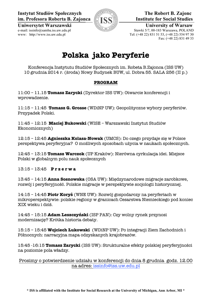 Instytut Studiów Społecznych im. Profesora Roberta B. Zajonca Uniwersytet Warszawski The Robert B. Zajonc Institute for Social Studies University of Warsaw e-mail: [email protected] www: http://www.iss.uw.edu.pl Stawki 5/7, 00-183 Warszawa, POLAND Tel: (+48 22) 831 51 53, (+48 22) 554 97 30 Fax: (+48 22) 831 49 33 Polska jako Peryferie Konferencja Instytutu Studiów SpoĿecznych im. Robeta B.Zajonca (ISS UW) 10 grudnia 2014 r. (środa) Nowy Budynek BUW, ul. Dobra 55. SALA 256 (II p.) PROGRAM 11:00 – 11.15 Tomasz Zarycki (Dyrektor ISS UW): Otwarcie konferencji i wprowadzenie. 11:15 – 11:45 Tomasz G. Grosse (WDiNP UW): Geopolityczne wybory peryferiów. Przypadek Polski. 11:45 – 12:15 Maciej Bukowski (WISE – Warszawski Instytut Studiów Ekonomicznych) 12:15 – 12:45 Agnieszka Kolasa-Nowak (UMCS): Do czego przydaje się w Polsce perspektywa peryferyjna? O możliwych sposobach użycia w naukach spoĿecznych. 12:45 – 13:15 Tomasz Warczok (UP Kraków): Nierówna cyrkulacja idei. Miejsce Polski w globalnym polu nauk spoĿecznych 13:15 – 13:45 P r z e r w a 13:45 – 14:15 Anna Sosnowska (OSA UW): Międzynarodowe migracje zarobkowe, rozwój i peryferyjność. Polskie migracje w perspektywie socjologii historycznej. 14:15 – 14:45 Piotr Koryś (WNE UW): Rozwój gospodarczy na peryferiach w mikroperspektywie: polskie regiony w granicach Cesarstwa Niemieckiego pod koniec XIX wieku i dziś. 14:45 – 15:15 Adam Leszczyński (ISP PAN): Czy wolny rynek przynosi modernizację? Krótka historia debaty. 15:15 – 15:45 Wojciech ðukowski (WDiNP UW): Po integracji Ziem Zachodnich i PóĿnocnych: narracyjna mapa odzyskanych krajobrazów. 15:45 -16:15 Tomasz Zarycki (ISS UW): Strukturalne efekty polskiej peryferyjności na poziomie pola wĿadzy. Prosimy o potwierdzenie udziaĿu w konferencji do dnia 8 grudnia godz. 12.00 na adres: [email protected] * ISS is affiliated with the Institute for Social Research at the University of Michigan, Ann Arbor, MI *
