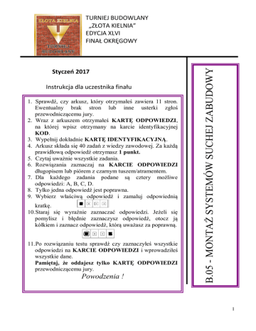 Styczeń 2017 Instrukcja dla uczestnika finału 1. Sprawdź, czy arkusz, który otrzymałeś zawiera 11 stron. Ewentualny brak stron lub inne usterki zgłoś przewodniczącemu jury. 2. Wraz z arkuszem otrzymałeś KARTĘ ODPOWIEDZI, na której wpisz otrzymany na karcie identyfikacyjnej KOD. 3. Wypełnij dokładnie KARTĘ IDENTYFIKACYJNĄ. 4. Arkusz składa się 40 zadań z wiedzy zawodowej. Za każdą prawidłową odpowiedź otrzymasz 1 punkt. 5. Czytaj uważnie wszystkie zadania. 6. Rozwiązania zaznaczaj na KARCIE ODPOWIEDZI długopisem lub piórem z czarnym tuszem/atramentem. 7. Dla każdego zadania podane są cztery możliwe odpowiedzi: A, B, C, D. 8. Tylko jedna odpowiedź jest poprawna. 9. Wybierz właściwą odpowiedź i zamaluj odpowiednią kratkę. 10. Staraj się wyraźnie zaznaczać odpowiedzi. Jeżeli się pomylisz i błędnie zaznaczysz odpowiedź, otocz ją kółkiem i zaznacz odpowiedź, którą uważasz za poprawną. 11. Po rozwiązaniu testu sprawdź czy zaznaczyłeś wszystkie odpowiedzi na KARCIE ODPOWIEDZI i wprowadziłeś wszystkie dane. Pamiętaj, że oddajesz tylko KARTĘ ODPOWIEDZI przewodniczącemu jury. Powodzenia ! B.05 - MONTAŻ SYSTEMÓW SUCHEJ ZABUDOWY TURNIEJ BUDOWLANY „ZŁOTA KIELNIA” EDYCJA XLVI FINAŁ OKRĘGOWY 1 1. Maksymalny rozstaw wieszaków, jaki może być zastosowany w ruszcie sufitów na konstrukcji krzyżowej dwupoziomowej wynosi: a) 120 x 120 cm. b) 50 x100 cm. c) 90 x 100 cm. d) 150 x 400 cm. 2. Rozstaw wkrętów do mocowania płyt g-k w poszyciach jednowarstwowych sufitów podwieszanych powinien wynosić: a) 40 cm. b) 20 cm. c) 17 cm. d) od 17 do 40 cm. 3. Przedstawiony na rysunku układ profili stosowany do montażu sufitu podwieszanego to: a) system bezwieszakowy. b) system korytarzowy. c) układ kasetonowy. d) system poddaszowy. 4. Rysunek poniżej przedstawia fragment sufitu podwieszanego przy montażu konstrukcji: a) do okładzin sufitowych. b) krzyżowej jednopoziomowej. c) krzyżowej dwupoziomowej. d) przęsłowej bezwieszakowej. 2 5. Przy montowaniu płyt w okładzinach ściennych należy: a) ustawiać płyty na podłodze. b) pozostawić szczelinę ok. 1 cm od podłogi. c) ustawić tak, aby nie stykały się z podłogą. d) ustawiać na profilu UD 30. 6. Na rysunku obok przedstawiono fragment konstrukcji: a) okładziny ściennej na profilach CD. b) ścianki działowej bez izolacji termicznej. c) okładziny ściennej na profilach kapeluszowych. d) obudowy szybów i wind. 7. Rozstaw uchwytów ES do mocowania profili CD60 powinien wynosić: a) w pionie maksymalnie 125 cm. b) w pionie co najmniej 125 cm. c) w poziomie maksymalnie 60 cm. d) w poziomie co najmniej 60 cm. 8. Długość profili CW w konstrukcji przedścianki powinna być: a) równa wysokości pomieszczenia. b) mniejsza o ok. 1 cm od wysokości pomieszczenia. c) mniejsza o grubość profili CU,. d) mniejsza o ok. 2 cm od wysokości pomieszczenia. 9. Do montażu przedścianek stosuje się profile: a) CD, UD. b) CD, UW. c) CW, UW. d) CW, UD. 10. Element systemu suchej zabudowy przedstawiony na rysunku to: a) suchy tynk. b) przedścianka. c) ściana działowa. d) ścianka instalacyjna. 3 11. Zakładka przy łączeniu profili dla ścian wysokich powinna wynosić co najmniej dla: a) profilu CW 100 – 1,0 m, dla profilu CW 75-0,75 m. b) wszystkich profili - 1 m. c) obu – 25 cm. d) obu profili – 0,75 m. 12. Do wykonania ścian łukowych z płyt g-k najlepiej stosować: a) wszystkie rodzaje płyt. b) płyty grubości 12,5 mm. c) specjalne płyty g-k o grubości 6 mm, zbrojone włóknem szklanym. d) specjalne płyty krzywoliniowe. 13. Na rysunku poniżej przedstawiającym fragment ściany działowej elementy oznaczone cyframi to: a) 2 – profil słupkowy CW, 6 –taśma izolacyjna przeciwdźwiękowa, 3 – profil UW. b) 2 – profil CD, 6 – taśma papierowa, 3 – profil CW. c) 2 – słupek drewniany 50 x 70 mm, 6 – taśma z włókna szklanego, 3 – profil UA. d) 2 – profil UD, 6 – taśma przeciwwilgociowa, 3 – profil UW. 14. Paroizolacja w obudowie dachu: a) chroni płyty g-k przed wilgocią. b) chroni izolacją termiczną przed przeciekami z pokrycia dachu. c) zwiększa dodatkowo izolację termiczną. d) chroni izolację od wilgoci powstającej w pomieszczeniu. 4 15. Jeżeli obudowa dachu i ścian wykonywana jest w systemie suchej zabudowy to ich montaż powinien odbywać się następująco: a) pierwsze wykonywane ściany działowe. b) pierwsza wykonywana obudowa dachu. c) kolejność montażu jest obojętna. d) powinny być montowane równolegle. 16. Przedstawiony na rysunku fragment suchej zabudowy poddasza to konstrukcja: a) na profilach CW i wieszakach grzybkowych. b) na profilach kapeluszowych i wieszakach grzybkowych. c) na profilach CD i wieszakach ES. d) na profilach CD i wieszakach grzybkowych. 17. Dwuwarstwowe ułożenie izolacji: a) stosuje się, gdy mamy różne materiały izolacyjne. b) likwiduje mostki cieplne. c) ułatwia układanie izolacji. d) stosuje się tam, gdzie wynika to z konstrukcji dachu. 18. Gdzie powinno być wykonane połączenie ślizgowe w systemie suchej obudowy dachu? a) na załamaniach dachu. b) między płytami przy dużej powierzchni dachu. c) na połączeniu obudowy dachu i ściany murowanej. d) przy obudowie okien dachowych. 19. Płyty przykręca się do: a) profili CD60. b) profili UD30. c) obu profili CD60 i UD30. d) obu profili CD60 i UD30, gdy ściana jest dłuższa niż 6 m. 5 20. Karton w płycie g-k pełni rolę: a) ochrony przeciwwilgociowej. b) zwiększa gładkość płyty. c) zwiększa wytrzymałość na rozciąganie. d) umożliwia dalsze prace wykończeniowe. 21. Jakie właściwości posiada płyt g-k typu F? a) odporność na wilgoć. b) ognioochronna. c) większa wytrzymałość mechaniczna. d) impregnowana. 22. Płyty g-k należy składować: a) układając pionowo. b) układając płasko na podkładzie. c) opierając o pionowe przegrody. d) tak, aby nie uszkodzić. 23. Jako przyścienne należy stosować profi