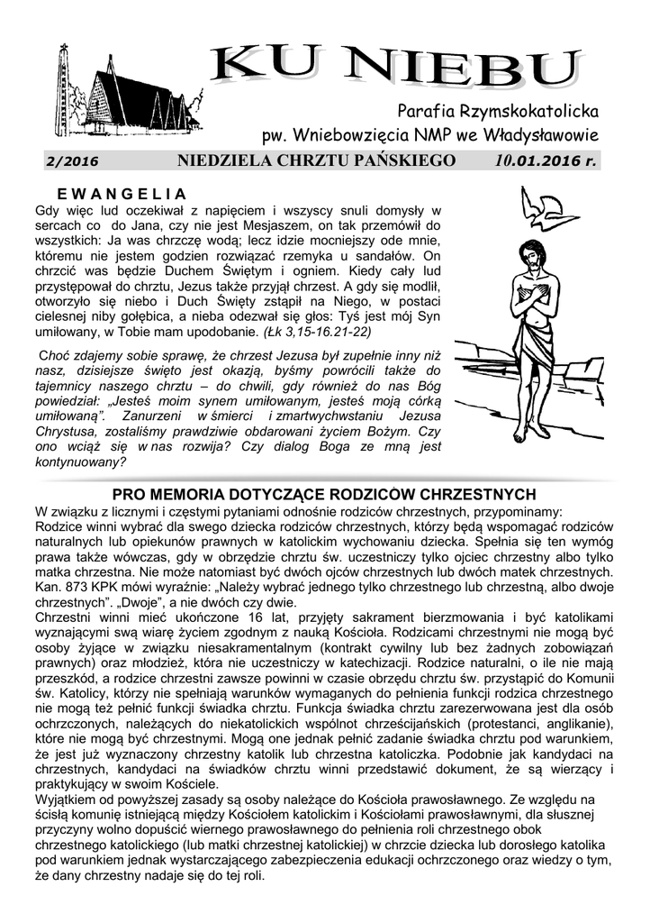 2/2016 Parafia Rzymskokatolicka pw. Wniebowzięcia NMP we Władysławowie NIEDZIELA CHRZTU PAŃSKIEGO 10.01.2016 r. EWANGELIA Gdy więc lud oczekiwał z napięciem i wszyscy snuli domysły w sercach co do Jana, czy nie jest Mesjaszem, on tak przemówił do wszystkich: Ja was chrzczę wodą; lecz idzie mocniejszy ode mnie, któremu nie jestem godzien rozwiązać rzemyka u sandałów. On chrzcić was będzie Duchem Świętym i ogniem. Kiedy cały lud przystępował do chrztu, Jezus także przyjął chrzest. A gdy się modlił, otworzyło się niebo i Duch Święty zstąpił na Niego, w postaci cielesnej niby gołębica, a nieba odezwał się głos: Tyś jest mój Syn umiłowany, w Tobie mam upodobanie. (Łk 3,15-16.21-22) Choć zdajemy sobie sprawę, że chrzest Jezusa był zupełnie inny niż nasz, dzisiejsze święto jest okazją, byśmy powrócili także do tajemnicy naszego chrztu – do chwili, gdy również do nas Bóg powiedział: „Jesteś moim synem umiłowanym, jesteś moją córką umiłowaną”. Zanurzeni w śmierci i zmartwychwstaniu Jezusa Chrystusa, zostaliśmy prawdziwie obdarowani życiem Bożym. Czy ono wciąż się w nas rozwija? Czy dialog Boga ze mną jest kontynuowany? PRO MEMORIA DOTYCZĄCE RODZICÓW CHRZESTNYCH W związku z licznymi i częstymi pytaniami odnośnie rodziców chrzestnych, przypominamy: Rodzice winni wybrać dla swego dziecka rodziców chrzestnych, którzy będą wspomagać rodziców naturalnych lub opiekunów prawnych w katolickim wychowaniu dziecka. Spełnia się ten wymóg prawa także wówczas, gdy w obrzędzie chrztu św. uczestniczy tylko ojciec chrzestny albo tylko matka chrzestna. Nie może natomiast być dwóch ojców chrzestnych lub dwóch matek chrzestnych. Kan. 873 KPK mówi wyraźnie: „Należy wybrać jednego tylko chrzestnego lub chrzestną, albo dwoje chrzestnych”. „Dwoje”, a nie dwóch czy dwie. Chrzestni winni mieć ukończone 16 lat, przyjęty sakrament bierzmowania i być katolikami wyznającymi swą wiarę życiem zgodnym z nauką Kościoła. Rodzicami chrzestnymi nie mogą być osoby żyjące w związku niesakramentalnym (kontrakt cywilny lub bez żadnych zobowiązań prawnych) oraz młodzież, która nie uczestniczy w katechizacji. Rodzice naturalni, o ile nie mają przeszkód, a rodzice chrzestni zawsze powinni w czasie obrzędu chrztu św. przystąpić do Komunii św. Katolicy, którzy nie spełniają warunków wymaganych do pełnienia funkcji rodzica chrzestnego nie mogą też pełnić funkcji świadka chrztu. Funkcja świadka chrztu zarezerwowana jest dla osób ochrzczonych, należących do niekatolickich wspólnot chrześcijańskich (protestanci, anglikanie), które nie mogą być chrzestnymi. Mogą one jednak pełnić zadanie świadka chrztu pod warunkiem, że jest już wyznaczony chrzestny katolik lub chrzestna katoliczka. Podobnie jak kandydaci na chrzestnych, kandydaci na świadków chrztu winni przedstawić dokument, że są wierzący i praktykujący w swoim Kościele. Wyjątkiem od powyższej zasady są osoby należące do Kościoła prawosławnego. Ze względu na ścisłą komunię istniejącą między Kościołem katolickim i Kościołami prawosławnymi, dla słusznej przyczyny wolno dopuścić wiernego prawosławnego do pełnienia roli chrzestnego obok chrzestnego katolickiego (lub matki chrzestnej katolickiej) w chrzcie dziecka lub dorosłego katolika pod warunkiem jednak wystarczającego zabezpieczenia edukacji ochrzczonego oraz wiedzy o tym, że dany chrzestny nadaje się do tej roli. JASEŁKA Dzieci z TEATRU MAŁEGO TWÓRCY ZAPRASZAJĄ NA JASEŁKA, które odbędą się 10 stycznia (niedziela) o godz.15:00 w kościele. WIZYTA DUSZPASTERSKA Niedziela - 10 stycznia 2016 r. (od 14.00) ul. Łąkowa 2-20 ul. Łąkowa 22-54 ul. Nadmorska 1-39 ul. Nadmorska 2-26 i ul. Łąkowa 3-35 ul. Piwna 1-22 ul. Męczenników Wielkiej Wsi 1-41 ul. Męczenników Wielkiej Wsi 2-36 ul. Ceynowy 21-1 ul. Ceynowy 50-4 Poniedziałek - 11 stycznia 2016 r. (od 15.30) ul. Stolarska 2-20 ul. Stolarska 1-23 ul. Średnia 1-20 ul. Inżynierska 1- 14 ul. Gdańska 60-2 ul. Gdańska 1- 49 ul. Gdańska 68, 59, 57, 58,61,67 i ul. Droga Chłapowska 29-2. Porazińskiej, ul. Rietza ul. Konopnickiej, ul. Golli, ul. Dąbrowskiej, ul . Modrzewskiego ul. Kochanowskiego, ul. Orzeszkowej Wtorek - 12 stycznia 2016 r. (od 15.30) ul. Droga Swarzewska, ul. Prusa i ul Wewnętrzna 1- 11 ul. Wewnętrzna 2-28 ul. Dettlaffa i 8 Marca 1-24 Stadionowa 18A- 2 ul. Niepodległości 21-3 i 2-14 ul. Piłata, ul. Fenikowskiego, ul. Drzeżdżona ul. Necla 15-5 i ul. Necla i 63 i 22-4 ul. Necla i 63 i 62 – 24 ul. Kwiatowa 1-35 Środa - 13 stycznia 2016 r. (od 15.30) ul. Droga Chłapowska 74-60, i ul. Trałowa – ul. Droga Chłapowska 58-30 i ul. Żwirowa 36 ul. Droga Chłapowska 41-53 ul. Droga Chłapowska 55-61 ul. Krasickiego 1-43 i ul. Przemysłowa ul. Krasickiego 2-34 ul. Reymonta 3- 36 ul. Przybyszewskiego 45-3 ul. Przybyszewskiego 60-2 Czwartek - 14 stycznia 2016 r. (od 15.30) ul. Reja 1A- 41 ul. Reja 2-38 ul. Rzemieślnicza 1-26 ul Młyńska 1-35 ul. Młyńska 2-28 ul. Młyńska 30-66 ul. Żytnia 19-1 ul. Żytnia 41-21 ul. Żytnia 32-2 Piątek - 15 stycznia 2016 r. (od 15.30) ul. Żwirowa 1-15 ul. Sucharskiego i ul. Dąbka 3-22 i ul. Wyzwolenia 90-102 ul. Wyzwolenia 1-29 ul. Wyzwolenia 56-88 ul. Wyzwolenia 2-54 ul. Steyera 2-40 ul. Unruga 3-29 ul. Żeromskiego ul. Żeromskiego Sobota - 16 stycznia 2016 r. (od 14.00) ul. Drogowców, 5 i 1 ul. Żeromskiego 34-50 i 31 ul. Słoneczna 1-18 ul. Harcerska 1-35 ul. Długa 4-28A ul. Długa 1-35 ul. Krótka 1-9 ul. Ogrodowa 1-33 ul. Ogrodowa 2-44 Niedziela - 17 stycznia 2016 r. (od 14.00) Morenowa 2-52 ul. Morenowa 1-49 ul. Róży Wiatrów 1-47 ul. Róży Wiatrów 2-42 ul. Nawigacyjna 1-47 ul. Nawigacyjna 2-22 ul. Stoczniowców 2-42 ul. Parkowa 1-23 ul. Zuchów 1-50 Wizytę w ramach uzupełnień, wszelkie zmiany i niedogodności prosimy zgłaszać w zakrystii, na plebani, telefonicznie. Program całej kolędy dostępny