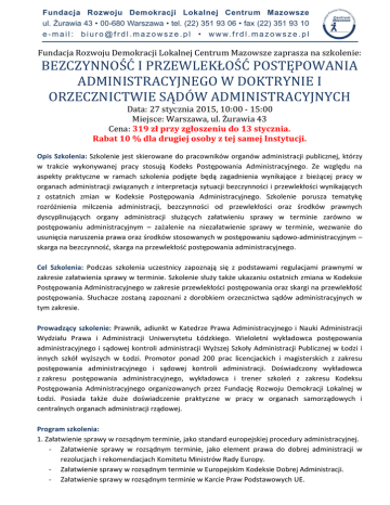 Fundacja Rozwoju Demokracji Lokalnej Centrum Mazowsze zaprasza na szkolenie: BEZCZYNNOŚĆ I PRZEWLEKŁOŚĆ POSTĘPOWANIA ADMINISTRACYJNEGO W DOKTRYNIE I ORZECZNICTWIE SĄDÓW ADMINISTRACYJNYCH Data: 27 stycznia 2015, 10:00 - 15:00 Miejsce: Warszawa, ul. Żurawia 43 Cena: 319 zł przy zgłoszeniu do 13 stycznia. Rabat 10 % dla drugiej osoby z tej samej Instytucji. Opis Szkolenia: Szkolenie jest skierowane do pracowników organów administracji publicznej, którzy w trakcie wykonywanej pracy stosują Kodeks Postępowania Administracyjnego. Ze względu na aspekty praktyczne w ramach szkolenia podjęte będą zagadnienia wynikające z bieżącej pracy w organach administracji związanych z interpretacja sytuacji bezczynności i przewlekłości wynikających z ostatnich zmian w Kodeksie Postępowania Administracyjnego. Szkolenie porusza tematykę rozróżnienia milczenia administracji, bezczynności od przewlekłości oraz środków prawnych dyscyplinujących organy administracji służących załatwieniu sprawy w terminie zarówno w postępowaniu administracyjnym – zażalenie na niezałatwienie sprawy w terminie, wezwanie do usunięcia naruszenia prawa oraz środków stosowanych w postępowaniu sądowo-administracyjnym – skarga na bezczynność, skarga na przewlekłość postępowania administracyjnego. Cel Szkolenia: Podczas szkolenia uczestnicy zapoznają się z podstawami regulacjami prawnymi w zakresie załatwienia sprawy w terminie. Szkolenie służy także ukazaniu ostatnich zmiana w Kodeksie Postępowania Administracyjnego w zakresie przewlekłości postępowania oraz skargi na przewlekłość postępowania. Słuchacze zostaną zapoznani z dorobkiem orzecznictwa sądów administracyjnych w tym zakresie. Prowadzący szkolenie: Prawnik, adiunkt w Katedrze Prawa Administracyjnego i Nauki Administracji Wydziału Prawa i Administracji Uniwersytetu Łódzkiego. Wieloletni wykładowca postępowania administracyjnego i sądowej kontroli administracji Wyższej Szkoły Administracji Publicznej w Łodzi i innych szkół wyższych w Łodzi. Promotor ponad 200 prac licencjackich i magisterskich z zakresu postępowania administracyjnego i sądowej kontroli administracji. Doświadczony wykładowca z zakresu postępowania administracyjnego, wykładowca i trener szkoleń z zakresu Kodeksu Postępowania Administracyjnego organizowanych przez Fundację Rozwoju Demokracji Lokalnej w Łodzi. Posiada także duże doświadczenie praktyczne w pracy w organach samorządowych i centralnych organach administracji rządowej. Program szkolenia: 1. Załatwienie sprawy w rozsądnym terminie, jako standard europejskiej procedury administracyjnej. - Załatwienie sprawy w rozsądnym terminie, jako element prawa do dobrej administracji w rezolucjach i rekomendacjach Komitetu Ministrów Rady Europy. - Załatwienie sprawy w rozsądnym terminie w Europejskim Kodeksie Dobrej Administracji. - Załatwienie sprawy w rozsądnym terminie w Karcie Praw Podstawowych UE. 2. Zasada szybkości postępowania na tle standardów europejskich. 3. Terminy załatwienia spraw w postępowaniu administracyjnym. 4. Niezałatwienie sprawy w terminie. - Zażalenie na niezałatwienie sprawy w terminie. - Wezwanie do usunięcia naruszenia prawa. 5. Milczenie w administracji. - Instytucja milczenia w prawie. - Instytucja milczenia organu w postępowaniu administracyjnym. 6. Bezczynność organu. - Pojęcie bezczynności. - Bezczynność a kompetencja organu. 7. Przewlekłe załatwianie sprawy. 8. Skarga powszechna, jako środek służący przeciwdziałaniu bezczynności. 9. Skarga na bezczynność i skarga na przewlekłość postępowania. 10. Skarga indywidualna do Europejskiego Trybunału Praw Człowieka. 11. Orzecznictwo WSA i NSA w zakresie bezczynności i przewlekłości postępowania. 12. Odpowiedzialność urzędnika za niezałatwienie sprawy w terminie. ZGŁOSZENIE BEZCZYNNOŚĆ I PRZEWLEKŁOŚĆ POSTĘPOWANIA ADMINISTRACYJNEGO W DOKTRYNIE I ORZECZNICTWIE SĄDÓW ADMINISTRACYJNYCH Data: 27 stycznia 2015, 10:00 - 15:00 Miejsce: Warszawa, ul. Żurawia 43 Cena: 319 zł przy zgłoszeniu do 13 stycznia. Rabat 10 % dla drugiej osoby z tej samej Instytucji. Instytucja (dane do faktury): ................................................................................................ Adres: ................................................................................................................................. NIP: ..................................................................................................................................... L.p. Imię i nazwisko Wydział tel. e-mail 1.......................................................................................................................................... 2.......................................................................................................................................... 3.......................................................................................................................................... ........................................................... podpis i pieczątka osoby delegującej Zgłoszenia prosimy przesyłać do 20 stycznia 2015 r. fax: (22) 351 93 10, e-mail: [email protected] lub wybrać opcje zapisu przez stronę www.frdl.mazowsze.pl Przy zgłoszeniu w ramach Forów prosimy o wpisanie w uwagach: „Zgłoszenie w ramach Forum (nazwa odpowiedniego Forum)”. Ewentualną rezygnację ze szkolenia można zgłosić najpóźniej na dwa dni robocze przed szkoleniem. W przypadku niewykorzystania zgłoszonego uczestnictwa - Urząd będzie zobowiązany do sfinansowania 60% odpłatności za uczestnictwo i materiały. FRDL zastrzega sobie prawo odwołania szkolenia. Miejsce szkolenia: Warszawa, ul. Żurawia 43. Lokalizacja 300 metrów od Metra Centrum. Cena: 319 zł netto przy zgłoszeniu do 13 stycznia. Cena po 13 stycznia to 369 zł. Rabat 10 % dla drugiej osoby z tej samej Instytucji. Zwolnienie z VAT w przypadku finansow
