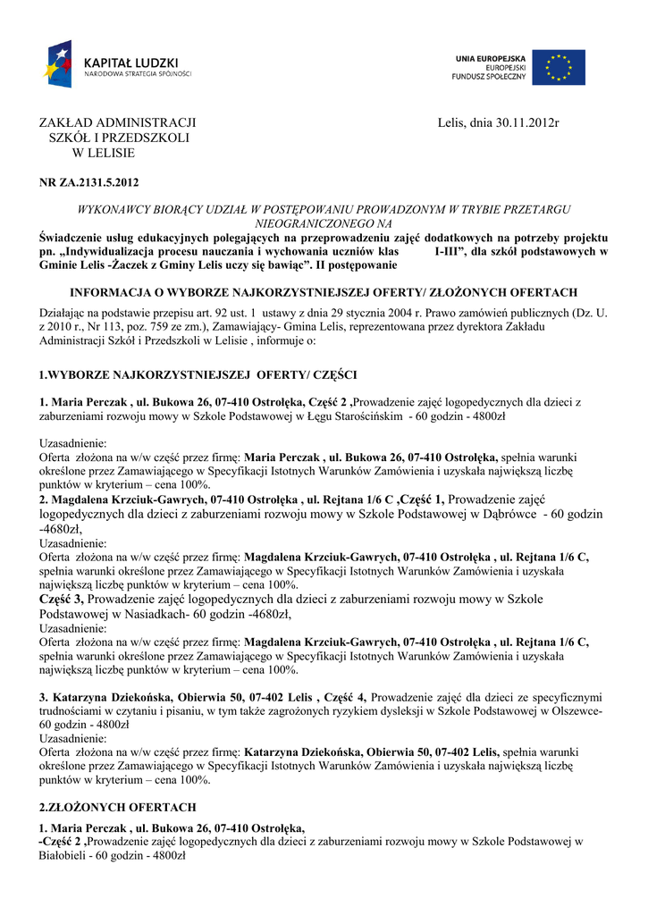 ZAKŁAD ADMINISTRACJI SZKÓŁ I PRZEDSZKOLI W LELISIE Lelis, dnia 30.11.2012r NR ZA.2131.5.2012 WYKONAWCY BIORĄCY UDZIAŁ W POSTĘPOWANIU PROWADZONYM W TRYBIE PRZETARGU NIEOGRANICZONEGO NA Świadczenie usług edukacyjnych polegających na przeprowadzeniu zajęć dodatkowych na potrzeby projektu pn. „Indywidualizacja procesu nauczania i wychowania uczniów klas I-III”, dla szkół podstawowych w Gminie Lelis -Żaczek z Gminy Lelis uczy się bawiąc”. II postępowanie INFORMACJA O WYBORZE NAJKORZYSTNIEJSZEJ OFERTY/ ZŁOŻONYCH OFERTACH Działając na podstawie przepisu art. 92 ust. 1 ustawy z dnia 29 stycznia 2004 r. Prawo zamówień publicznych (Dz. U. z 2010 r., Nr 113, poz. 759 ze zm.), Zamawiający- Gmina Lelis, reprezentowana przez dyrektora Zakładu Administracji Szkół i Przedszkoli w Lelisie , informuje o: 1.WYBORZE NAJKORZYSTNIEJSZEJ OFERTY/ CZĘŚCI 1. Maria Perczak , ul. Bukowa 26, 07-410 Ostrołęka, Część 2 ,Prowadzenie zajęć logopedycznych dla dzieci z zaburzeniami rozwoju mowy w Szkole Podstawowej w Łęgu Starościńskim - 60 godzin - 4800zł Uzasadnienie: Oferta złożona na w/w część przez firmę: Maria Perczak , ul. Bukowa 26, 07-410 Ostrołęka, spełnia warunki określone przez Zamawiającego w Specyfikacji Istotnych Warunków Zamówienia i uzyskała największą liczbę punktów w kryterium – cena 100%. 2. Magdalena Krzciuk-Gawrych, 07-410 Ostrołęka , ul. Rejtana 1/6 C ,Część 1, Prowadzenie zajęć logopedycznych dla dzieci z zaburzeniami rozwoju mowy w Szkole Podstawowej w Dąbrówce - 60 godzin -4680zł, Uzasadnienie: Oferta złożona na w/w część przez firmę: Magdalena Krzciuk-Gawrych, 07-410 Ostrołęka , ul. Rejtana 1/6 C, spełnia warunki określone przez Zamawiającego w Specyfikacji Istotnych Warunków Zamówienia i uzyskała największą liczbę punktów w kryterium – cena 100%. Część 3, Prowadzenie zajęć logopedycznych dla dzieci z zaburzeniami rozwoju mowy w Szkole Podstawowej w Nasiadkach- 60 godzin -4680zł, Uzasadnienie: Oferta złożona na w/w część przez firmę: Magdalena Krzciuk-Gawrych, 07-410 Ostrołęka , ul. Rejtana 1/6 C, spełnia warunki określone przez Zamawiającego w Specyfikacji Istotnych Warunków Zamówienia i uzyskała największą liczbę punktów w kryterium – cena 100%. 3. Katarzyna Dziekońska, Obierwia 50, 07-402 Lelis , Część 4, Prowadzenie zajęć dla dzieci ze specyficznymi trudnościami w czytaniu i pisaniu, w tym także zagrożonych ryzykiem dysleksji w Szkole Podstawowej w Olszewce60 godzin - 4800zł Uzasadnienie: Oferta złożona na w/w część przez firmę: Katarzyna Dziekońska, Obierwia 50, 07-402 Lelis, spełnia warunki określone przez Zamawiającego w Specyfikacji Istotnych Warunków Zamówienia i uzyskała największą liczbę punktów w kryterium – cena 100%. 2.ZŁOŻONYCH OFERTACH 1. Maria Perczak , ul. Bukowa 26, 07-410 Ostrołęka, -Część 2 ,Prowadzenie zajęć logopedycznych dla dzieci z zaburzeniami rozwoju mowy w Szkole Podstawowej w Białobieli - 60 godzin - 4800zł 2.Magdalena Krzciuk-Gawrych, 07-410 Ostrołęka , ul. Rejtana 1/6 C , -Część 1, Prowadzenie zajęć logopedycznych dla dzieci z zaburzeniami rozwoju mowy w Szkole Podstawowej w Dąbrówce - 60 godzin -4680zł, -Część 3, Prowadzenie zajęć logopedycznych dla dzieci z zaburzeniami rozwoju mowy w Szkole Podstawowej w Nasiadkach- 60 godzin -4680zł, 3. Katarzyna Dziekońska, Obierwia 50, 07-402 Lelis , -Część 4, Prowadzenie zajęć dla dzieci ze specyficznymi trudnościami w czytaniu i pisaniu, w tym także zagrożonych ryzykiem dysleksji w Szkole Podstawowej w Zespole Szkół w Obierwi - 60 godzin - 4800zł 3. WYKONAWCACH WYKLUCZONYCH /ODRZUCONYCH Do wiadomości: 1. Maria Perczak , ul. Bukowa 26, 07-410 Ostrołęka, 2. Magdalena Krzciuk-Gawrych, 07-410 Ostrołęka , ul. Rejtana 1/6 C , 3. Katarzyna Dziekońska, Obierwia 50, 07- 402 Lelis , Kierownik Zamawiającego Andrzej Przeradzki Dyrektor ZASiP w Lelisie