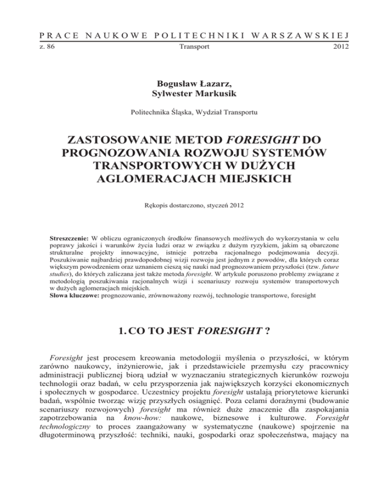 PRACE NAUKOWE POLITECHNIKI WARSZAWSKIEJ z. 86 Transport 2012 Bogusaw azarz, Sylwester Markusik Politechnika lska, Wydzia Transportu ZASTOSOWANIE METOD FORESIGHT DO PROGNOZOWANIA ROZWOJU SYSTEMÓW TRANSPORTOWYCH W DUYCH AGLOMERACJACH MIEJSKICH Rkopis dostarczono, stycze 2012 Streszczenie: W obliczu ograniczonych rodków finansowych moliwych do wykorzystania w celu poprawy jakoci i warunków ycia ludzi oraz w zwizku z duym ryzykiem, jakim s obarczone strukturalne projekty innowacyjne, istnieje potrzeba racjonalnego podejmowania decyzji. Poszukiwanie najbardziej prawdopodobnej wizji rozwoju jest jednym z powodów, dla których coraz wikszym powodzeniem oraz uznaniem ciesz si nauki nad prognozowaniem przyszoci (tzw. future studies), do których zaliczana jest take metoda foresight. W artykule poruszono problemy zwizane z metodologi poszukiwania racjonalnych wizji i scenariuszy rozwoju systemów transportowych w duych aglomeracjach miejskich. Sowa kluczowe: prognozowanie, zrównowaony rozwój, technologie transportowe, foresight 1. CO TO JEST FORESIGHT ? Foresight jest procesem kreowania metodologii mylenia o przyszoci, w którym zarówno naukowcy, inynierowie, jak i przedstawiciele przemysu czy pracownicy administracji publicznej bior udzia w wyznaczaniu strategicznych kierunków rozwoju technologii oraz bada, w celu przysporzenia jak najwikszych korzyci ekonomicznych i spoecznych w gospodarce. Uczestnicy projektu foresight ustalaj priorytetowe kierunki bada, wspólnie tworzc wizj przyszych osigni. Poza celami dora nymi (budowanie scenariuszy rozwojowych) foresight ma równie due znaczenie dla zaspokajania zapotrzebowania na know-how: naukowe, biznesowe i kulturowe. Foresight technologiczny to proces zaangaowany w systematyczne (naukowe) spojrzenie na dugoterminow przyszo: techniki, nauki, gospodarki oraz spoeczestwa, majcy na 72 Bogusaw azarz, Sylwester Markusik celu identyfikacj obszarów bada strategicznych oraz powstajcych technologii generycznych, które maj potencja przyniesienia najwyszych korzyci gospodarczych i spoecznych w okrelonej perspektywie czasowej. A wic, ogólnym celem foresightu technologicznego jest identyfikacja powstajcych technologii kluczowych, które posiadaj potencja wytworzenia najwyszych korzyci gospodarczych oraz spoecznych. Jako kluczowe technologie uwaa si technologie posiadajce wysoki potencja wpywania na konkurencyjno danego przedsibiorstwa, regionu lub kraju oraz na jako ycia spoeczestwa. Wymieni mona szereg wanych aspektów powyej przytoczonych definicji metodologii foresightu [1]: x jako próby spojrzenia na przyszo musz by one systematyczne, aby nazwa je „foresight”; x foresight musi odnosi si do duszego okresu, który zazwyczaj postrzega si jako duszy od normalnego horyzontu planowania. Horyzonty czasowe foresightu tym samym wynosz od 5 do 30 lat. Horyzont czasowy foresightu jest zawsze daleko poza zainteresowaniami decydentów (zarówno w administracji publicznej, jak i w yciu politycznym). Dotyczy to w szczególnoci foresightów zwizanych z problematyk rozwoju transportu, gdzie wszelkie dziaania inwestycyjne wymagaj dugiego okresu czasu, znacznie wybiegajcego poza okres jednej kadencji polityka lub samorzdowca; x postp nauki/technologii powinien by zbalansowany zapotrzebowaniem rynku. Foresight technologiczny nie powinien by jednak zdominowany wycznie przez nauk i technologi. Naley powici uwag take czynnikom spoecznogospodarczym, które równie wpywaj na ksztatowanie innowacji technicznych; x foresight skupia si na powstajcych technologiach generycznych, gdzie istnieje prawna podstawa do wsparcia rzdowego. Jest to spowodowane faktem, i przedsibiorstwa s czsto niechtne do finansowania bada strategicznych, które wspieraj powstajce nowe technologie generyczne. Powysze aspekty byy czsto modyfikowane definicjami foresightu kadcymi wikszy nacisk na budowanie systemu oraz korzyci wynikajce z tego procesu. Programy foresight obejmuj wic pi kluczowych elementów [1]: x strukturalne przewidywanie dugoterminowych: spoecznych, gospodarczych oraz technologicznych postpów oraz potrzeb, x interaktywne metody badawcze, analizy oraz badania, zawierajce szeroki zakres stron zainteresowanych, które s charakterystyczne dla foresightu (w przeciwiestwie do wielu tradycyjnych bada przyszoci, które s raczej zarezerwowane dla ekspertów), x interaktywne podejcie obejmuje tworzenie nowych sieci spoecznych. Nacisk na rol tworzenia sieci roni si w zalenoci od typu programu foresight, x formalne produkty foresightu wykraczaj poza prezentacj scenariuszy oraz przygotowywanie ogólnych planów rozwojowych, x wspólna wizja rozwojowa nie moe by utopijna, poniewa musi by stworzone wyra ne uznanie oraz wyjanienie implikacji dla „dzisiejszych decyzji oraz przyszych dziaa”. Naley zauway, i foresight nie zastpuje prognozowania, bada nad przyszoci czy planowania strategicznego. Kade z tych dziaa ma swoj rol. Wielu przypadkach role tych dziaa mog si wzajemnie wspiera. Pogld, e „nie mona przewidzie Zastosowanie metod Foresight do prognozowania rozwoju systemów … 73 przyszoci”, wynika z niezrozumienia idei foresightu, który nie ma na celu przewidywania przyszoci. Foresight dotyczy gównie uprzedzania rónych moliwych wariantów przyszoci. Skupia si take na tworzeniu podanej wizji przyszoci przez propozycje dziaa podejmowanych aktualnie. Programy typu Foresight umoliwiaj wic i s pomocne w tworzeniu planów zrównowaonego rozwoju danych regionów. Termin „zrównowaony rozwój transportu” zosta zdefiniowany w 1987 roku (w Raporcie wiatowej Komisji rodowiska i Rozwoju Nasza wspólna przyszo) jako „rozwój, odpowiadajcy potrzebom dnia dzisiejszego, który nie ogranicza zdolnoci transportowych przyszych pokole do zaspokajania ich potrzeb w zakresie mobilnoci”. Z punktu widzenia zrównowaonego rozwoju regionu bardzo istotn rol peni nastpujce aspekty: poziom ycia spoeczestwa, energia, ekologia, technologie na rzecz ochrony rodowiska, wzrost gospodarczy i infrastruktura. Z k