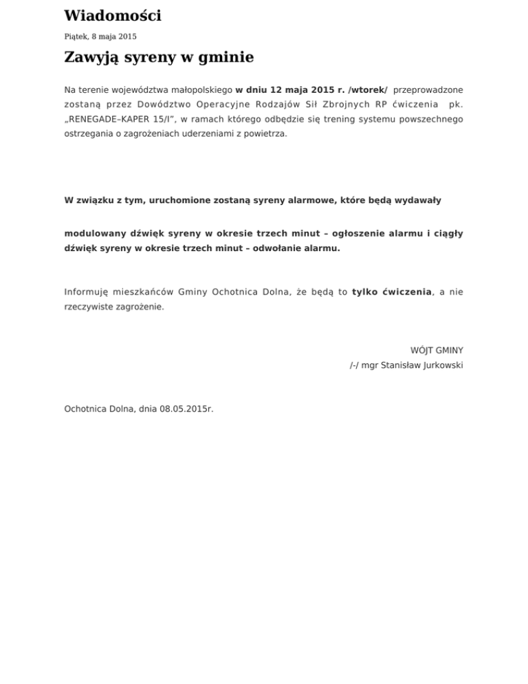 Wiadomości Piątek, 8 maja 2015 Zawyją syreny w gminie Na terenie województwa małopolskiego w dniu 12 maja 2015 r. /wtorek/ przeprowadzone zostaną przez Dowództwo Operacyjne Rodzajów Sił Zbrojnych RP ćwiczenia pk. „RENEGADE–KAPER 15/I”, w ramach którego odbędzie się trening systemu powszechnego ostrzegania o zagrożeniach uderzeniami z powietrza. W związku z tym, uruchomione zostaną syreny alarmowe, które będą wydawały modulowany dźwięk syreny w okresie trzech minut – ogłoszenie alarmu i ciągły dźwięk syreny w okresie trzech minut – odwołanie alarmu. Informuję mieszkańców Gminy Ochotnica Dolna, że będą to tylko ćwiczenia, a nie rzeczywiste zagrożenie. WÓJT GMINY /-/ mgr Stanisław Jurkowski Ochotnica Dolna, dnia 08.05.2015r.