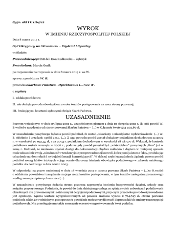 Sygn. akt I C 1164/12 WYROK W IMIENIU RZECZYPOSPOLITEJ POLSKIEJ Dnia 8 marca 2013 r. Sąd Okręgowy we Wrocławiu – Wydział I Cywilny w składzie: Przewodniczący: SSR del. Ewa Rudkowska – Ząbczyk Protokolant: Marcin Guzik po rozpoznaniu na rozprawie w dniu 8 marca 2013 r. we W. sprawy z powództwa W. B. przeciwko Skarbowi Państwa - Dyrektorowi (...) we W. o zapłatę I. oddala powództwo; II. nie obciąża powoda obowiązkiem zwrotu kosztów postępowania na rzecz strony pozwanej; III. brakującymi kosztami sądowymi obciąża Skarb Państwa. UZASADNIENIE Pozwem wniesionym w dniu 25 lipca 2012 r., uzupełnionym pismem z dnia 10 sierpnia 2012 r. (k. 28) powód W. B.wniósł o zasądzenie od strony pozwanej Skarbu Państwa – (...) w O.łącznie kwoty 534 402,80 zł. W uzasadnieniu powyższego żądania powód podniósł, że został „oskarżony o nieodpłatne wydzierżawienie (...) W. B. obiektów i urządzeń spółki z o.o. (...). Z tego powodu powód został obciążony podatkiem dochodowym za 2002 r. w wysokości 40 032,55 zł, a za 2003 r. podatkiem dochodowym w wysokości 18 487,00 zł. Wskazał, że kontrola podatkowa została wszczęta w 2006 r., podczas gdy powód przestał być „właścicielem” powyższych „firm” już w 2004 r. Podniósł, że niedawno uzyskał dostęp do dokumentacji obydwu zakładów i dopiero w niniejszej sprawie może udowodnić swoją „niewinność w tendencyjnie przeprowadzonej kontroli, która pomija istotne fakty, produkując oskarżenie na domysłach i wybujałej fantazji kontrolujących”. W dalszej części uzasadnienia żądania pozwu powód podniósł szereg faktów istotnych w jego ocenie dla oceny istnienia obowiązku podatkowego w zakresie ustalonego podatku dochodowego za lata 2002 i 2003. W odpowiedzi na pozew wniesionej w dniu 18 września 2012 r. strona pozwana Skarb Państwa – (...)w O.wniósł o oddalenia powództwa i zasądzenie na jego rzecz kosztów postepowania, w tym kosztów zastępstwa procesowego według norm przepisanych na rzecz (...). W uzasadnieniu powyższego żądania strona pozwana zaprzeczyła istnieniu bezprawności działań, szkody oraz związku przyczynowego. Podniosła, że powód do dnia dzisiejszego zalega ze spłatą swoich zobowiązań podatkowych określonych mu prawomocnymi i ostatecznymi decyzjami podatkowymi, przy czym przeciwko powodowi prowadzona jest egzekucja. Łączna wartość wyegzekwowanych od powoda środków wynosi 2 764,745 zł. Strona pozwana podniosła także, że w niniejszym postepowaniu powód nie może zweryfikować i doprowadzić do zmiany rozstrzygnięć podatkowych. Nie przysługuje mu także roszczenie o zwrot wyegzekwowanych kwot podatku. Postanowieniem z dnia 10 grudnia 2012 r. Sąd zmienił oznaczenie statio fisci pozwanego Skarbu Państwa w ten sposób, że w miejsce (...)w O.oznaczył Dyrektora (...) we W.. Sąd ustalił następujący stan faktyczny: Postanowieniem z dnia 24 lipca 2006 r. Dyrektor (...) postanowił wszcząć z urzędu postepowanie kontrolne wobec powoda w zakresie rzetelności deklarowanych podstaw opodatkowania oraz prawidłowości obliczania i wpłacania do budżetu państwa podatku dochodowego od osób fizycznych za lata 2002 i 2003. (dowód: postanowienie Dyrektor (...)nr (...)dnia 24 lipca 2006 r., k. 122; upoważnienie nr (...)(...) z dnia 24 lipca 2006 r., k. 121 i 123) Po przeprowadzeniu postepowania kontrolnego Dyrektor (...) we W.określił dla powoda zobowiązanie podatkowe w podatku dochodowym od osób fizycznych za 2002 r. w wysokości 43 007,00 zł oraz wysokość odsetek za zwłokę od zaległości powstałej z tytułu nie wpłaconych w terminie zaliczek na podatek dochodowy od osób fizycznych w łącznej kwoce 4 830,00 zł. (dowód: decyzja Dyrektora (...) we W.nr (...)z dnia 31 grudnia 2007 r., k. 124-137) Po przeprowadzeniu postepowania kontrolnego Dyrektor (...) we W.określił dla powoda zobowiązanie podatkowe w podatku dochodowym od osób fizycznych za 2003 r. w wysokości 38 504,00 zł oraz wysokość odsetek za zwłokę od zaległości powstałej z tytułu nie wpłaconych w terminie zaliczek na podatek dochodowy od osób fizycznych w łącznej kwoce 3 876,00 zł. (dowód: decyzja Dyrektora (...) we W.nr (...)z dnia 31 grudnia 2007 r., k. 139-151) Decyzją z dnia 30 maja 2008 r. Dyrektor (...)we W.uchylił w całości decyzję z dnia 31 grudnia 2007 r. nr (...)organu podatkowego pierwszej instancji (Dyrektora (...) we W.) określającą zobowiązanie powoda w podatku dochodowym od osób fizycznych za 2002 r. w wysokości 43 007,00 zł oraz odsetki za zwłokę od zaległości powstałej z tytułu niewpłaconych w terminie zaliczek na podatek dochodowy od osób fizycznych w łącznej kwocie 4830,00 zł i przekazał sprawę do ponownego rozpoznania. (dowód: decyzja Dyrektora (...)we W.z dnia 30 maja 2008 r. nr (...) (...), k. 152-156) Decyzją z dnia 30 maja 2008 r. Dyrektor (...)we W.uchylił w całości decyzję z dnia 31 grudnia 2007 r. nr (...)organu podatkowego pierwszej instancji (Dyrektora (...) we W.) określającą zobowiązanie powoda w podatku dochodowym od osób fizycznych za 2003 r. w wysokości 38 504,00 zł oraz odsetki za zwłokę od zaległości powstałej z tytułu niewpłaconych w terminie zaliczek na podatek dochodowy od osób fizycznych w łącznej kwocie 3876,00 zł i przekazał sprawę do ponownego rozpoznania. (dowód: decyzja Dyrektora (...)we W.z dnia 30 maja 2008 r. nr (...) (...), k. 157-161) Decyzją z dnia 3 listopada 2008 r. Dyrektor (...) we W.określił powodowi zobowiązanie podatkowe w podatku dochodowym od osób fizycznych za 2002 r. w wysokości 27 339,00 zł oraz odsetki za zwłokę od należnych zaliczek na podatek w łącznej kwocie 3562,00 zł. (dowód: decyzja Dyrektora (...) we W.nr (...)z dnia 3 listopada 2008 r., k. 162-180) Decyzją z dnia 14 listopada 2008 r. Dyrektor (...) we W.określił powodowi zobowiązanie podatkowe w podatku dochodowym od osób fizycznych za 2003 r. w wys