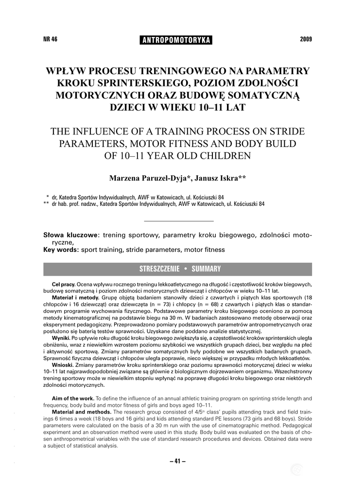NR 46 AN TRO PO MO TO RY KA 2009 WPŁYW PROCESU TRENINGOWEGO NA PARAMETRY KROKU SPRINTERSKIEGO, POZIOM ZDOLNOŚCI MOTORYCZNYCH ORAZ BUDOWĘ SOMATYCZNĄ DZIECI W WIEKU 10–11 LAT THE INFLUENCE OF A TRAINING PROCESS ON STRIDE PARAMETERS, MOTOR FITNESS AND BODY BUILD OF 10–11 YEAR OLD CHILDREN Marzena Paruzel-Dyja*, Janusz Iskra** ***dr, Katedra Sportów Indywidualnych, AWF w Katowicach, ul. Kościuszki 84 ***dr hab. prof. nadzw., Katedra Sportów Indywidualnych, AWF w Katowicach, ul. Kościuszki 84 Słowa kluczowe: trening sportowy, parametry kroku biegowego, zdolności motoryczne, Key words: sport training, stride parameters, motor fitness STRESZCZENIE • SUMMARY – 41 – - - Aim of the work. To define the influence of an annual athletic training program on sprinting stride length and frequency, body build and motor fitness of girls and boys aged 10–11. Material and methods. The research group consisted of 4/5th class’ pupils attending track and field trainings 6 times a week (18 boys and 16 girls) and kids attending standard PE lessons (73 girls and 68 boys). Stride parameters were calculated on the basis of a 30 m run with the use of cinematographic method. Pedagogical experiment and an observation method were used in this study. Body build was evaluated on the basis of chosen anthropometrical variables with the use of standard research procedures and devices. Obtained data were a subject of statistical analysis. - - Cel pracy. Ocena wpływu rocznego treningu lekkoatletycznego na długość i częstotliwość kroków biegowych, budowę somatyczną i poziom zdolności motorycznych dziewcząt i chłopców w wieku 10–11 lat. Materiał i metody. Grupę objętą badaniem stanowiły dzieci z czwartych i piątych klas sportowych (18 chłopców i 16 dziewcząt) oraz dziewczęta (n = 73) i chłopcy (n = 68) z czwartych i piątych klas o standardowym programie wychowania fizycznego. Podstawowe parametry kroku biegowego oceniono za pomocą metody kinematograficznej na podstawie biegu na 30 m. W badaniach zastosowano metodę obserwacji oraz eksperyment pedagogiczny. Przeprowadzono pomiary podstawowych parametrów antropometrycznych oraz posłużono się baterią testów sprawności. Uzyskane dane poddano analizie statystycznej. Wyniki. Po upływie roku długość kroku biegowego zwiększyła się, a częstotliwość kroków sprinterskich uległa obniżeniu, wraz z niewielkim wzrostem poziomu szybkości we wszystkich grupach dzieci, bez względu na płeć i aktywność sportową. Zmiany parametrów somatycznych były podobne we wszystkich badanych grupach. Sprawność fizyczna dziewcząt i chłopców uległa poprawie, nieco większej w przypadku młodych lekkoatletów. Wnioski. Zmiany parametrów kroku sprinterskiego oraz poziomu sprawności motorycznej dzieci w wieku 10–11 lat najprawdopodobniej związane są głównie z biologicznym dojrzewaniem organizmu. Wszechstronny trening sportowy może w niewielkim stopniu wpłynąć na poprawę długości kroku biegowego oraz niektórych zdolności motorycznych. Marzena Paruzel-Dyja, Janusz Iskra Results. After a period of one year strides length increased with simultaneous decrease of stride frequency and insignificant increase of a speed level, in each group no matter the gender and the level of sport activity. Changes of body build parameters were similar in the examined groups. The level of motor fitness of girls and boys improved, which might be slightly more visible in the group of young athletes. Conclusions. The changes of sprinting stride parameters and the level of motor fitness of 10–11-year-old children are probably mainly a result of a biological development of a young organism. Sport training may have a slight influence on the changes of stride length and the level of chosen motor abilities. WR = masa ciała (g)/wysokość ciała3 (m). Wstęp Współczesny trening sportowy jest procesem złożonym, a na jego skuteczność wpływa wiele czynników, których znajomość stanowi podstawę całej działalności szkoleniowej. Obecnie teoria treningu szczególnie wnikliwie odnosi się do pierwszych etapów kariery sportowej – szkolenia dzieci i młodzieży. Trening sportowy dzieci i młodzieży powinien być jedną z faz długofalowego procesu, wynikającą z praw rozwoju biologicznego i zasady stopniowego rozwijania mistrzostwa sportowego. Ma on stworzyć podstawy do uzyskiwania maksymalnych wyników w wieku najwyższych naturalnych możliwości organizmu [1]. Odpowiednio ukierunkowany proces szkolenia wywołuje szereg reakcji przystosowawczych mięśni, układu krwionośnego, oddechowego i wielu narządów ciała [2]. Próbę ustalenia zmian długości i częstotliwości kroku biegowego dzieci pod wpływem treningu sportowego podjęło wcześniej niewielu autorów [3–6]. Celem pracy była ocena wpływu rocznego treningu lekkoatletycznego na długość i częstotliwość kroków biegowych, budowę somatyczną i poziom zdolności motorycznych dziewcząt i chłopców wieku 10–11 lat. - - - - - Materiał i metody Badaniami, które przeprowadzono dwukrotnie (w odstępie jednego roku) w Szkole Podstawowej nr 15 w Rudzie Śląskiej, objęto dzieci w wieku 10–11 lat uczestniczące w lekcjach wychowania fizycznego o standardowym programie (68 chłopców i 73 dziewczęta) oraz ich rówieśników z klas sportowych (18 chłopców i 16 dziewcząt), biorących udział w treningach lekkoatletycznych 6 razy w tygodniu. W badaniach wykorzystano metodę obserwacji oraz eksperyment pedagogiczny. Budowę ciała badanych oceniono za pomocą wybranych parametrów antropometrycznych, stosując standardowe procedury i narzędzia badawcze (antropometr, cyrkiel kabłąkowy, taśmę centymetrową, fałdomierz) [7, 8]. Obliczono również wskaźnik Rohrera wg wzoru: Poziom sprawności badanych dzieci określono na podstawie wybranych testów motorycznych, którymi były: • testy szybkości biegowej – biegi na 30 i 60 m ze startu niskiego na sygna