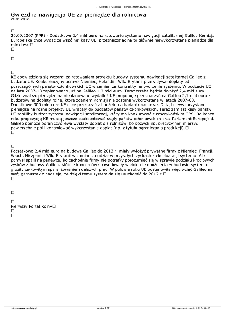 .:: Dopłaty i Fundusze - Portal Informacyjny ::. Gwiezdna nawigacja UE za pieniądze dla rolnictwa 20.09.2007. 20.09.2007 (PPR) - Dodatkowe 2,4 mld euro na ratowanie systemu nawigacji satelitarnej Galileo Komisja Europejska chce wydać ze wspólnej kasy UE, przeznaczając na to głównie niewykorzystane pieniądze dla rolnictwa. KE opowiedziała się wczoraj za ratowaniem projektu budowy systemu nawigacji satelitarnej Galileo z budżetu UE. Konkurencyjny pomysł Niemiec, Holandii i Wlk. Brytanii przewidywał dopłaty od poszczególnych państw członkowskich UE w zamian za kontrakty na tworzenie systemu. W budżecie UE na lata 2007-13 zaplanowano już na Galileo 1,2 mld euro. Teraz trzeba będzie dołożyć 2,4 mld euro. Gdzie znaleźć pieniądze na nieplanowane wydatki? KE proponuje przeznaczyć na Galileo 2,1 mld euro z budżetów na dopłaty rolne, które zdaniem Komisji nie zostaną wykorzystane w latach 2007-08. Dodatkowe 300 mln euro KE chce przekazać z budżetu na badania naukowe. Dotąd niewykorzystane pieniądze na różne projekty UE wracały do budżetów państw członkowskich. Teraz zamiast kasy państw UE zasiliłby budżet systemu nawigacji satelitarnej, który ma konkurować z amerykańskim GPS. Do końca roku propozycję KE muszą jeszcze zaakceptować rządy państw członkowskich oraz Parlament Europejski. Galileo pomoże ograniczyć lewe wypłaty dopłat dla rolników, bo pozwoli np. precyzyjniej mierzyć powierzchnię pól i kontrolować wykorzystanie dopłat (np. z tytułu ograniczania produkcji). Początkowo 2,4 mld euro na budowę Galileo do 2013 r. miały wyłożyć prywatne firmy z Niemiec, Francji, Włoch, Hiszpanii i Wlk. Brytanii w zamian za udział w przyszłych zyskach z eksploatacji systemu. Ale pomysł spalił na panewce, bo zachodnie firmy nie potrafiły porozumieć się w sprawie podziału krociowych zysków z budowy Galileo. Kłótnie koncernów spowodowały wieloletnie opóźnienia w budowie systemu i groziły całkowitym sparaliżowaniem dalszych prac. W połowie roku UE postanowiła więc wziąć Galileo na swój garnuszek z nadzieją, że dzięki temu system da się uruchomić do 2012 r. Pierwszy Portal Rolny http://www.doplaty.pl Kreator PDF Utworzono 8 March, 2017, 10:49