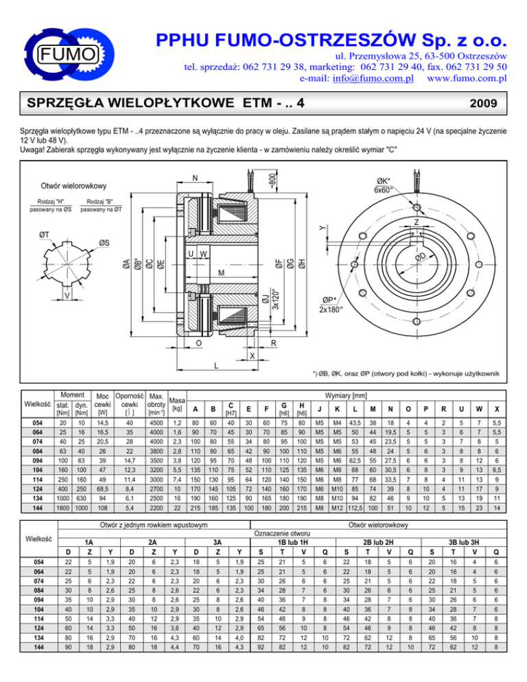 PPHU FUMO-OSTRZESZÓW Sp. z o.o. FUMO ul. Przemysłowa 25, 63-500 Ostrzeszów tel. sprzedaż: 062 731 29 38, marketing: 062 731 29 40, fax. 062 731 29 50 e-mail: [email protected] www.fumo.com.pl SPRZĘGŁA WIELOPŁYTKOWE ETM - .. 4 2009 N Otwór wielorowkowy ØK* 6x60° Rodzaj "B" pasowany na ØT Z Y Rodzaj "H" pasowany na ØS ~800 Sprzęgła wielopłytkowe typu ETM - ..4 przeznaczone są wyłącznie do pracy w oleju. Zasilane są prądem stałym o napięciu 24 V (na specjalne życzenie 12 V lub 48 V). Uwaga! Zabierak sprzęgła wykonywany jest wyłącznie na życzenie klienta - w zamówieniu należy określić wymiar "C" ØT ØS ØD ØF ØG ØH ØA ØB* ØC ØE U W ØJ 3x120° M V O ØP * 2x180° R X L *) ØB, ØK, oraz ØP (otwory pod kołki) - wykonuje użytkownik Moment Moc Oporność Max. Masa Wielkość stat. dyn. cewki cewki obroty [kg] A -1 [min ] [Ω] [Nm] [Nm] [W] 054 064 074 084 094 104 114 124 134 144 20 10 25 16 40 25 63 40 100 63 160 100 250 160 400 250 1000 630 1600 1000 14,5 16,5 20,5 26 39 47 49 68,5 94 108 40 35 28 22 14,7 12,3 11,4 8,4 6,1 5,4 4500 4000 4000 3800 3500 3200 3000 2700 2500 2200 1,2 1,6 2,3 2,8 3,8 5,5 7,4 10 16 22 80 90 100 110 120 135 150 170 190 215 Wymiary [mm] B 60 70 80 90 95 110 130 145 160 185 C [H7] 40 45 55 65 70 75 95 105 125 135 E F 30 30 34 42 48 52 64 72 90 100 60 70 80 90 100 110 120 140 165 180 G H [h6] 75 85 95 100 110 125 140 160 180 200 [h6] 80 90 100 110 120 135 150 170 190 215 J K M5 M5 M5 M5 M5 M6 M6 M6 M8 M8 L M4 43,5 38 M5 50 44 M5 53 45 M6 55 48 M6 62,5 55 M8 68 60 M8 77 68 M10 85 74 M10 94 82 M12 112,5 100 Otwór z jednym rowkiem wpustowym Wielkość 054 064 074 084 094 104 114 124 134 144 M N O P R U W X 18 19,5 23,5 24 27,5 30,5 33,5 39 46 51 4 5 5 5 6 6 7 8 9 10 4 5 5 6 6 8 8 10 10 12 2 3 3 3 3 3 4 4 5 5 5 6 7 8 8 9 11 11 13 15 7 7 8 8 12 13 13 17 19 23 5,5 5,5 5 6 6 6,5 9 9 11 14 Otwór wielorowkowy D 1A Z Y D 2A Z Y D 3A Z Y 22 22 25 30 35 40 50 60 80 90 5 5 6 8 10 10 14 14 16 18 1,9 1,9 2,3 2,6 2,9 2,9 3,3 3,3 2,9 2,9 20 20 22 25 30 35 40 50 70 80 6 6 6 8 8 10 12 16 16 18 2,3 2,3 2,3 2,6 2,6 2,9 2,9 3,6 4,3 4,4 18 18 20 22 25 30 35 40 60 70 5 5 6 6 8 8 10 12 14 16 1,9 1,9 2,3 2,3 2,6 2,6 2,9 2,9 4,0 4,3 Oznaczenie otworu 1B lub 1H S T V 25 25 30 34 40 46 54 65 82 92 21 21 26 28 36 42 46 56 72 82 5 5 6 7 7 8 9 10 12 12 Q S 2B lub 2H T V Q S 3B lub 3H T V Q 6 6 6 6 8 8 8 8 10 10 22 22 25 30 34 40 46 54 72 82 18 18 21 26 28 36 42 46 62 72 6 6 6 6 6 8 8 8 8 10 20 20 22 25 30 34 40 46 65 72 16 16 18 21 26 28 36 42 56 62 6 6 6 6 6 6 8 8 8 8 5 5 5 6 7 7 8 9 12 12 4 4 5 5 6 7 7 8 10 12 ZASILANIE Sprzęgła ETM - ..4 przystosowane są do zasilania prądem stałym o napięciu 24±1 V. W celu zabezpieczenia cewki sprzęgła przed przebiciem w układzie zasilającym należy zastosować człon gaszący w postaci równolegle podłączonego do cewki opornika o oporności około 10 razy większej od oporności cewki, lub diody półprzewodnikowej lub też opornika i diody. SMAROWANIE Smarowanie sprzęgieł wielopłytkowych ma za zadanie zmniejszenie zużycia części (głównie płytek ciernych) oraz odprowadzenie ciepła wytworzonego podczas pracy. Sprzęgła wielopłytkowe należy smarować dowolnymi olejami mineralnymi o lepkościach mniejszych od 37 cSt. W zależności od prędkości liniowej sprzęgła "V" (mierzonej na średnicy zewnętrznej) zaleca się stosować oleje o lepkościach: • przy prędkości liniowej V < 12 m/s - oleje o lepkości max. 37 cSt • przy prędkości liniowej V >12 m/s - oleje o lepkości ~ 20 cSt [ 1 cSt = 1 mm2/s ] Uwaga! Lepkość oleju podano dla temp. 50°C Sposoby smarowania sprzęgieł (od środka przez drążony wał, przez polewanie lub przez zanurzenie w oleju na wysokość 1/6 średnicy "H") uzależnione są przede wszystkim od warunków pracy. Należy wybrać taki sposób smarowania, aby temperatura oleju w układzie smarowania nie przekraczała 60°C, a temperatura sprzęgła po ustabilizowaniu się nie przekraczała 90°C. Zalecane wydatki oleju przy smarowaniu sprzęgieł przez polewanie wynoszą: Wielkość sprzęgła 054 064 074 084 094 104 114 124 134 144 Wydatek [ l/min. ] 0,3 0,3 0,4 0,6 0,8 1,2 1,6 2,0 2,5 3,0 Przy smarowaniu sprzęgieł od środka (przez drążony wał) wydatki oleju mogą zostać zmniejszone o około 50% wartości wydatków podanych w tabeli. WYMOGI TECHNICZNE ZABUDOWY I EKSPLOATACJI 1. Przed przystąpieniem do zabudowy sprzęgło należy przemyć w środku rozkonserwującym. 2. Cewkotrzymak przykręcić do nieruchomego elementu maszyny bazując na średnicy „G” lub "H" (max. niewspółosiowość względem wału, na którym osadzona jest tuleja sprzęgła, od 0,03÷0,05 mm w zależności od wielkości sprzęgła). 3. Tuleję sprzęgła osadzić na wale w ten sposób, aby czoło tulei oraz czoło cewkotrzymaka leżały w jednej płaszczyźnie (jest to ważne ze względu na zachowanie prawidłowej szczeliny magnetycznej na powierzchni stożkowej korpusu i cewkotrzymaka) a następnie zabezpieczyć ją przed ruchem osiowym. 4. Zabierak przymocować do elementu napędzanego lub napędzającego za pomocą wkrętów i kołków zabezpieczonych przed możliwością wypadnięcia podczas eksploatacji. Bicie powierzchni bazowej pod zabierak powinno wynosić od 0,03÷0,05 mm w zależności od wielkości sprzęgła. 5. Podczas eksploatacji, sprzęgła nie wymagają żadnej regulacji. Należy jedynie okresowo kontrolować czystość oleju (olej do smarowania powinien być wolny od zanieczyszczeń mechanicznych i chemicznych). Sposób oznaczania sprzęgła przy składaniu zamówienia (przykład) Sprzęgło ETM− − 104 − 1A− − 24-00 wielkość sprzęgła oznaczenie otworu osadczego napięcie zasilania wymiar „C” w zabieraku *) *) w przypadku zamówienia sprzęgła bez zabieraka, należy zawsze wpisać wartość "00", w przeciwnym razie należy wpisać żądany wymiar *** Producent zastrzega sobie prawo wprowadzania zmian poprawiających jakość wyrobu **