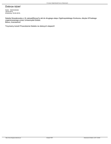 VI Liceum Ogólnokszta³c±ce w Katowicach Dobrze idzie! Autor: Administrator 18.02.2015. Zmieniony 18.02.2015. Natalia Nowakowska z IA zakwalifikowa³a siê do drugiego etapu Ogólnopolskiego Konkursu Jêzyka W³oskiego organizowanego przez Uniwersytet £ódzki. Bravo, bravissimo! Trzymamy kciuki! Powodzenia Natalia na dalszych etapach! http://www.dlugosz.katowice.pl Kreator PDF Utworzono 8 March, 2017, 09:49