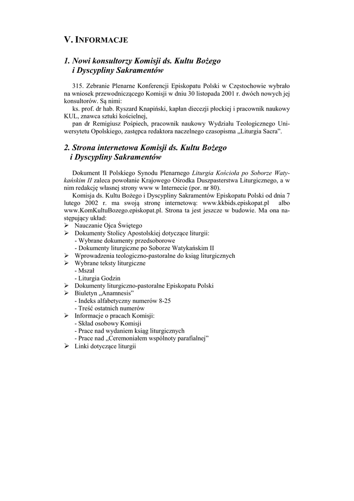 V. INFORMACJE 1. Nowi konsultorzy Komisji ds. Kultu Bożego i Dyscypliny Sakramentów 315. Zebranie Plenarne Konferencji Episkopatu Polski w Częstochowie wybrało na wniosek przewodniczącego Komisji w dniu 30 listopada 2001 r. dwóch nowych jej konsultorów. Są nimi: ks. prof. dr hab. Ryszard Knapiński, kapłan diecezji płockiej i pracownik naukowy KUL, znawca sztuki kościelnej, pan dr Remigiusz Pośpiech, pracownik naukowy Wydziału Teologicznego Uniwersytetu Opolskiego, zastępca redaktora naczelnego czasopisma „Liturgia Sacra”. 2. Strona internetowa Komisji ds. Kultu Bożego i Dyscypliny Sakramentów Dokument II Polskiego Synodu Plenarnego Liturgia Kościoła po Soborze Watykańskim II zaleca powołanie Krajowego Ośrodka Duszpasterstwa Liturgicznego, a w nim redakcję własnej strony www w Internecie (por. nr 80). Komisja ds. Kultu Bożego i Dyscypliny Sakramentów Episkopatu Polski od dnia 7 lutego 2002 r. ma swoją stronę internetową: www.kkbids.episkopat.pl albo www.KomKultuBozego.episkopat.pl. Strona ta jest jeszcze w budowie. Ma ona następujący układ: Nauczanie Ojca Świętego Dokumenty Stolicy Apostolskiej dotyczące liturgii: - Wybrane dokumenty przedsoborowe - Dokumenty liturgiczne po Soborze Watykańskim II Wprowadzenia teologiczno-pastoralne do ksiąg liturgicznych Wybrane teksty liturgiczne - Mszał - Liturgia Godzin Dokumenty liturgiczno-pastoralne Episkopatu Polski Biuletyn „Anamnesis” - Indeks alfabetyczny numerów 8-25 - Treść ostatnich numerów Informacje o pracach Komisji: - Skład osobowy Komisji - Prace nad wydaniem ksiąg liturgicznych - Prace nad „Ceremoniałem wspólnoty parafialnej” Linki dotyczące liturgii 96 Informacje 3. Informacja o pracach nad księgami liturgicznymi Po ostatnich korektach jest część rytuału Egzorcyzmy i inne modlitwy błagalne. Niebawem księga ta ukaże się drukiem w wydawnictwie Księgarnia św. Jacka w Katowicach. Wydawnictwo Pallottinum w Poznaniu przygotowuje dodatkowy (wakacyjny) tom Liturgii Godzin, który zawierał będzie teksty od połowy czerwca do końca września. To samo wydawnictwo przygotowuje druk dodatków (wkładek) do Liturgii Godzin i do Mszału rzymskiego dla diecezji polskich, które zawierać będą teksty liturgiczne o nowych świętych i błogosławionych wprowadzonych do kalendarza diecezji polskich po roku 1992. Opracowywany jest przekład nowego Wykazu odpustów (Enchiridion Indulgentiarum) ogłoszonego 16 lipca 1999 r. Zespół tłumaczy przygotowuje przekład nowego wydania Martyrologium Romanum, którego łaciński tekst został wydrukowany na początku października 2001 r. 4. Prace nad „Ceremoniałem wspólnoty parafialnej” Od pewnego czasu Podkomisja ds. Służby Liturgicznej pracuje nad opracowaniem Ceremoniału wspólnoty parafialnej. W dniach 28.- 30.12.2001 w parafii św. Józefa w Krakowie odbyło się spotkanie przedstawicieli moderatorów, Wspólnoty Niepokalanej Matki Kościoła i animatorów Diakonii Liturgicznej Ruchu Światło-Życie i kilka osób spoza tego ruchu. Byli tam wykładowcy liturgiki, diecezjalny duszpasterz służby liturgicznej, klerycy Wyższego Seminarium Duchownego, nadzwyczajny szafarz Komunii Świętej. Pochodzili z różnych stron Polski. W drugiej połowie stycznia tekst roboczy Ceremoniału został przesłany do szerszej konsultacji w różnych środowiskach, przede wszystkim do wykładowców liturgiki, do przewodniczących diecezjalnych komisji liturgicznych, oraz do duszpasterzy służby liturgicznej. Roboczy tekst Ceremoniału wspólnoty parafialnej znajduje się na stronie internetowej Komisji Kultu Bożego i Dyscypliny Sakramentów Episkopatu Polski: www.kkbids.episkopat.pl. Zamieszczone są tam także adresy, na które można posyłać swoje uwagi lub zapytania. 25 lutego 4. Liturgiczne nowości wydawnicze Tu zwykle podajemy informacje o wydanych księgach liturgicznych i niektórych książkach z dziedzinyliturgiki. a. Pontyfikał rzymski. Obrzędy poświęcenia kościoła i ołtarza, Katowice 2001, Księgarnia św. Jacka, ISBN: 83-7030-322-6. Informacje 97 Ta księga liturgiczna - część Pontyfikału rzymskiego - zawiera obrzędy poświęcenia kamienia węgielnego lub rozpoczęcia budowy kościoła, obrzędy poświęcenia kościoła, zwane kiedyś konsekracją kościoła, obrzędy poświęcenia kościoła, w którym już stale sprawuje się służbę Bożą, obrzędy poświęcenia ołtarza, obrzędy błogosławieństwa kościoła, obrzędy błogosławieństwa ołtarza oraz obrzędy błogosławieństwa kielicha i pateny. b. Józef Wacław Boguniowski SDS, Rozwój historyczny ksiąg liturgii rzymskiej do Soboru Trydenckiego i ich recepcja w Polsce, Wydawnictwo UNUM, Kraków 2001, ISBN 83-87022-74-8. Książka jest c. Piotr Greger, Recepcja obrzędów pokuty w Polsce po Soborze Watykańskim II, Bielsko Biała 2000 , ISBN: 83-904153-7-2 Książka jest d. Zdzisław Janiec, Liturgia na ambonie, Wydawnictwo Diecezjalne, Sandomierz 2002, ISBN 83-7300-095-X Dla. e. Andrzej Krzystek, Generalna reforma liturgiczna Papieża Piusa XII. Zamierzenia i realizacja, Ottonianum, Szczecin 2000, ISBN 83-7041-212-2 Dla. f. Sławomir Ropiak, Teologia hymnów polskojęzycznej Liturgii Godzin. Tom IOkres Bożego Narodzenia, Hosianum, Olsztyn 2001, ISSN 1425-302X Dla głębszego g. Robert Tyrała, Soborowa odnowa muzyki kościelnej w Polsce, Wydawnictwo Unum, Kraków 2000, ISBN 83-87022-58-6. Dla głębszego poznania liturgii sakramentów ważne jest przestudiowanie wprowadzeń