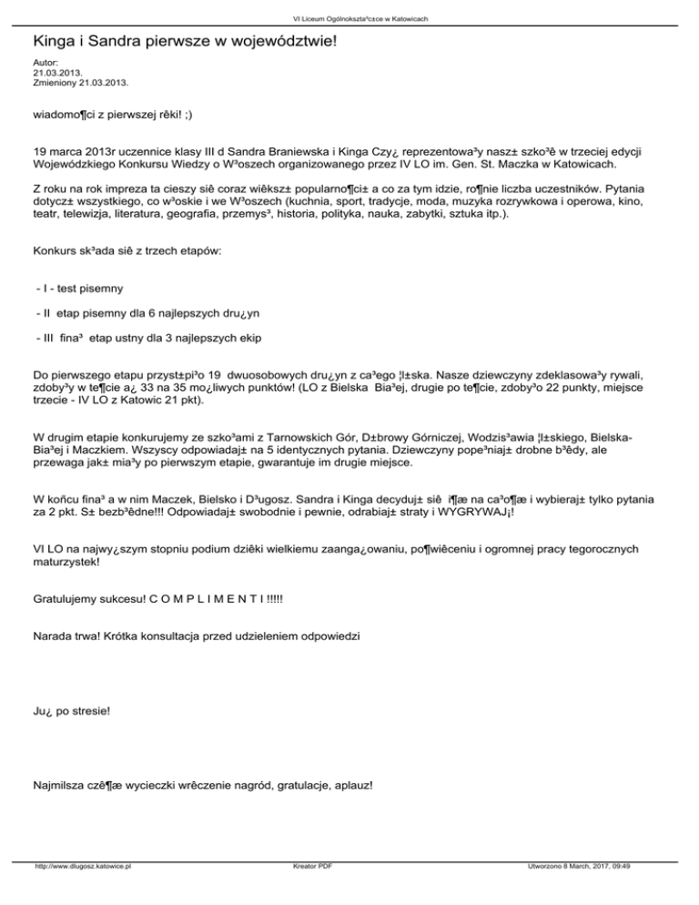 VI Liceum Ogólnokszta³c±ce w Katowicach Kinga i Sandra pierwsze w województwie! Autor: 21.03.2013. Zmieniony 21.03.2013. wiadomo¶ci z pierwszej rêki! ;) 19 marca 2013r uczennice klasy III d Sandra Braniewska i Kinga Czy¿ reprezentowa³y nasz± szko³ê w trzeciej edycji Wojewódzkiego Konkursu Wiedzy o W³oszech organizowanego przez IV LO im. Gen. St. Maczka w Katowicach. Z roku na rok impreza ta cieszy siê coraz wiêksz± popularno¶ci± a co za tym idzie, ro¶nie liczba uczestników. Pytania dotycz± wszystkiego, co w³oskie i we W³oszech (kuchnia, sport, tradycje, moda, muzyka rozrywkowa i operowa, kino, teatr, telewizja, literatura, geografia, przemys³, historia, polityka, nauka, zabytki, sztuka itp.). Konkurs sk³ada siê z trzech etapów: - I - test pisemny - II etap pisemny dla 6 najlepszych dru¿yn - III fina³ etap ustny dla 3 najlepszych ekip Do pierwszego etapu przyst±pi³o 19 dwuosobowych dru¿yn z ca³ego ¦l±ska. Nasze dziewczyny zdeklasowa³y rywali, zdoby³y w te¶cie a¿ 33 na 35 mo¿liwych punktów! (LO z Bielska Bia³ej, drugie po te¶cie, zdoby³o 22 punkty, miejsce trzecie - IV LO z Katowic 21 pkt). W drugim etapie konkurujemy ze szko³ami z Tarnowskich Gór, D±browy Górniczej, Wodzis³awia ¦l±skiego, BielskaBia³ej i Maczkiem. Wszyscy odpowiadaj± na 5 identycznych pytania. Dziewczyny pope³niaj± drobne b³êdy, ale przewaga jak± mia³y po pierwszym etapie, gwarantuje im drugie miejsce. W koñcu fina³ a w nim Maczek, Bielsko i D³ugosz. Sandra i Kinga decyduj± siê i¶æ na ca³o¶æ i wybieraj± tylko pytania za 2 pkt. S± bezb³êdne!!! Odpowiadaj± swobodnie i pewnie, odrabiaj± straty i WYGRYWAJ¡! VI LO na najwy¿szym stopniu podium dziêki wielkiemu zaanga¿owaniu, po¶wiêceniu i ogromnej pracy tegorocznych maturzystek! Gratulujemy sukcesu! C O M P L I M E N T I !!!!! Narada trwa! Krótka konsultacja przed udzieleniem odpowiedzi Ju¿ po stresie! Najmilsza czê¶æ wycieczki wrêczenie nagród, gratulacje, aplauz! http://www.dlugosz.katowice.pl Kreator PDF Utworzono 8 March, 2017, 09:49 VI Liceum Ogólnokszta³c±ce w Katowicach W tle organizatorzy konkursu prof. D. Krzy¿ewski i prof. A Tobolska. Czarno na bia³ym widaæ, ¿e D³ugosz jest najlepszy! Szczê¶liwe zwyciê¿czynie z nagrodami. Redaktor:KW http://www.dlugosz.katowice.pl Kreator PDF Utworzono 8 March, 2017, 09:49